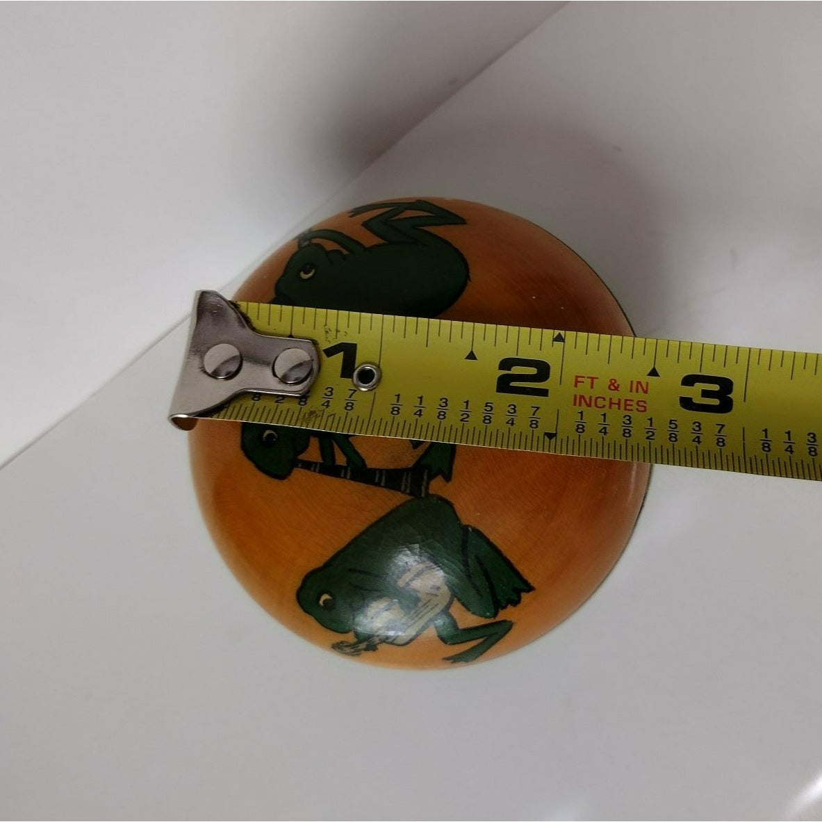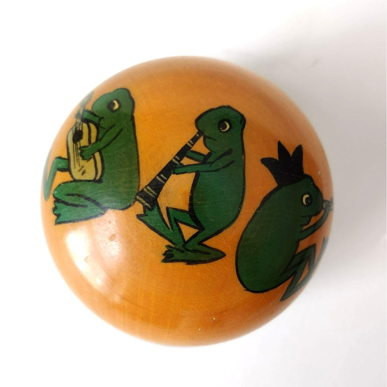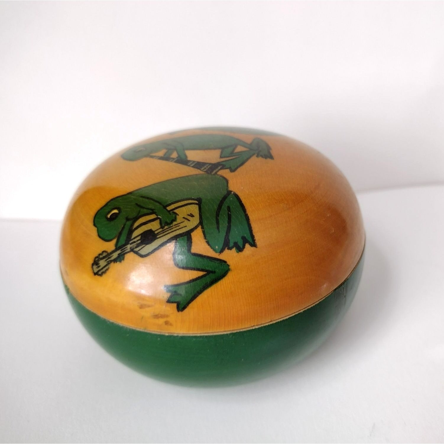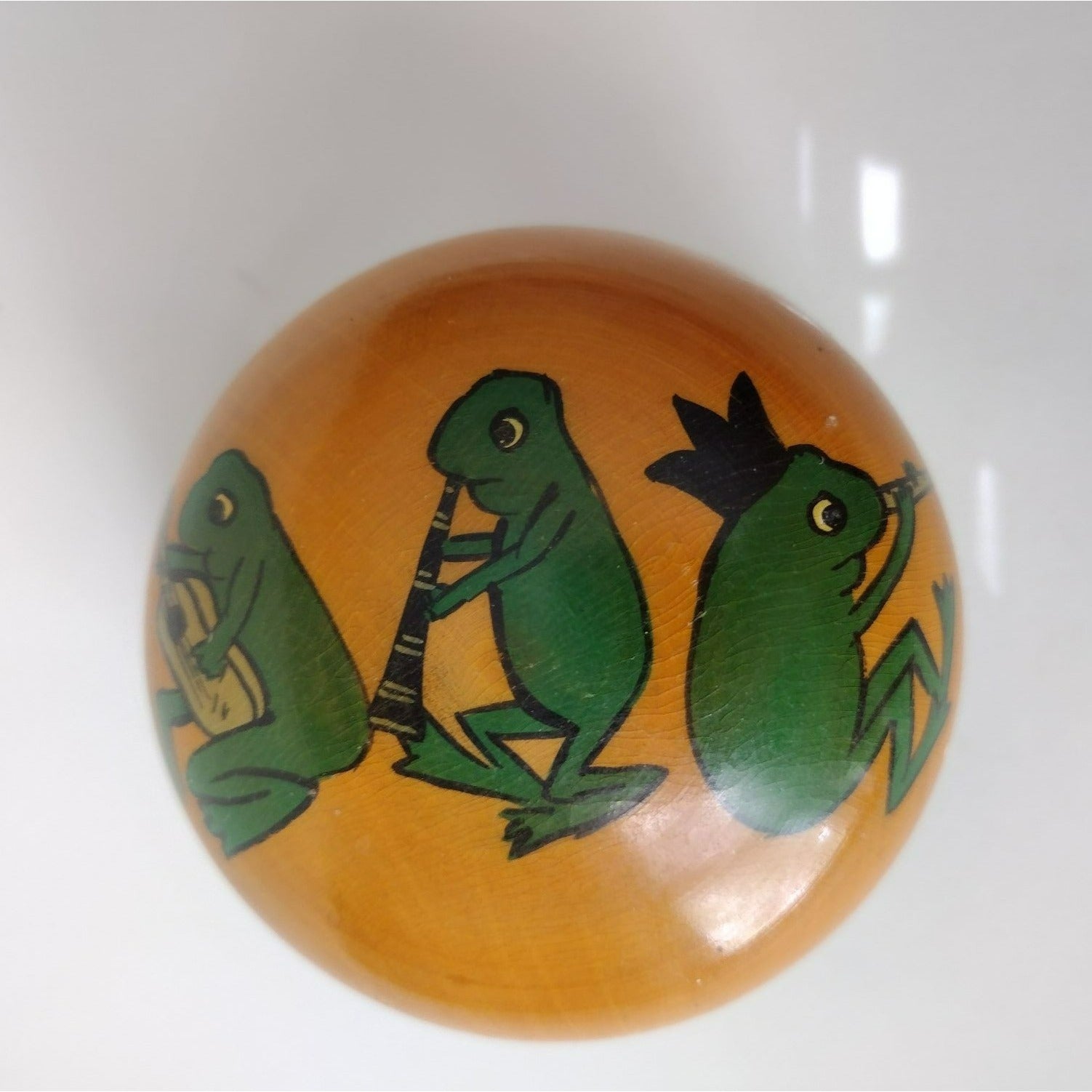 Hand Painted Wooden Frog Trinket Box, 3 Toad Musicians, Green Beige Lidded Jar