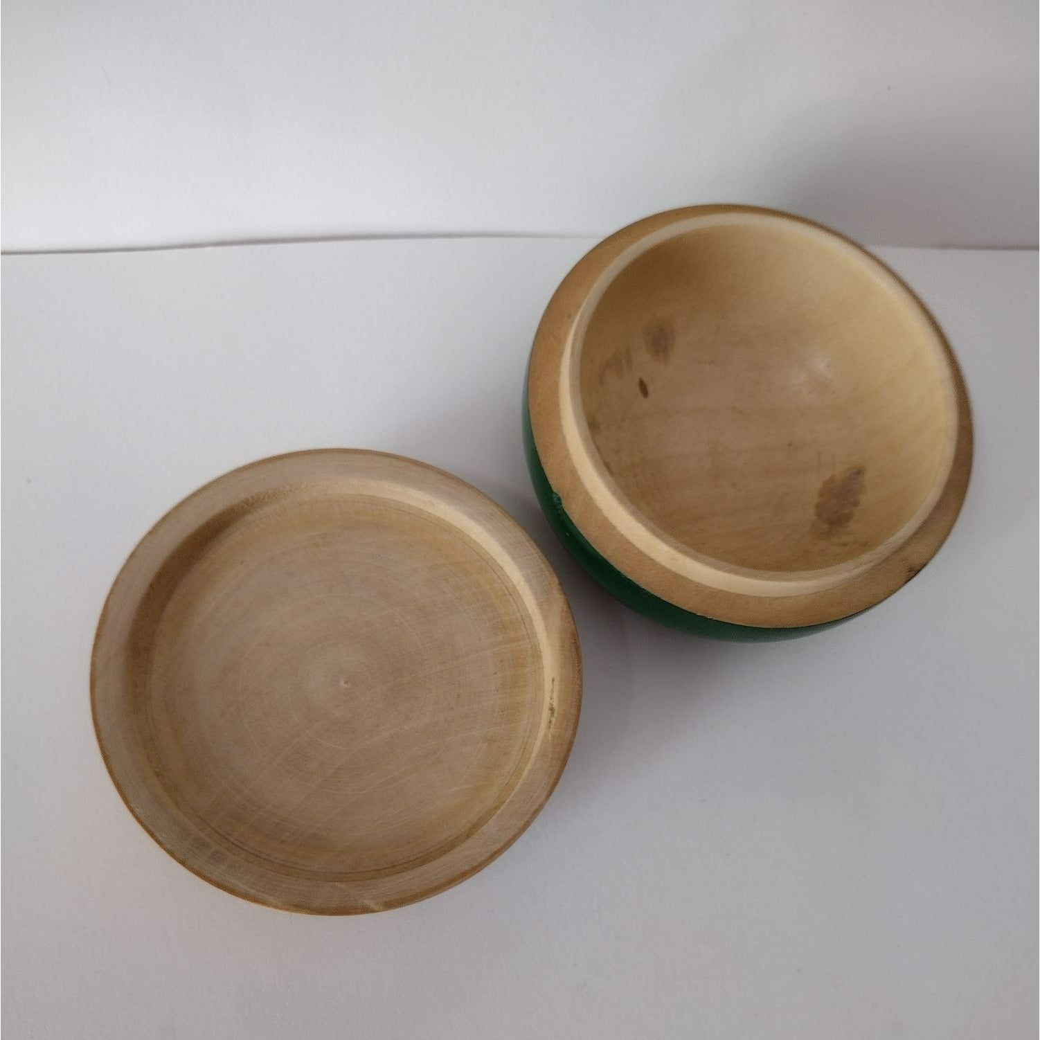 This is an adorable Hand Painted Wooden Frog Trinket Box, featuring 3 Toad Musicians. Each frog is playing a different musical instrument - it looks like a ukulele, clarinet and a flute or recorder. This Green Beige Lidded Jar is a whimsical blend of handmade folk art and eclectic style. It would make a fun gift!