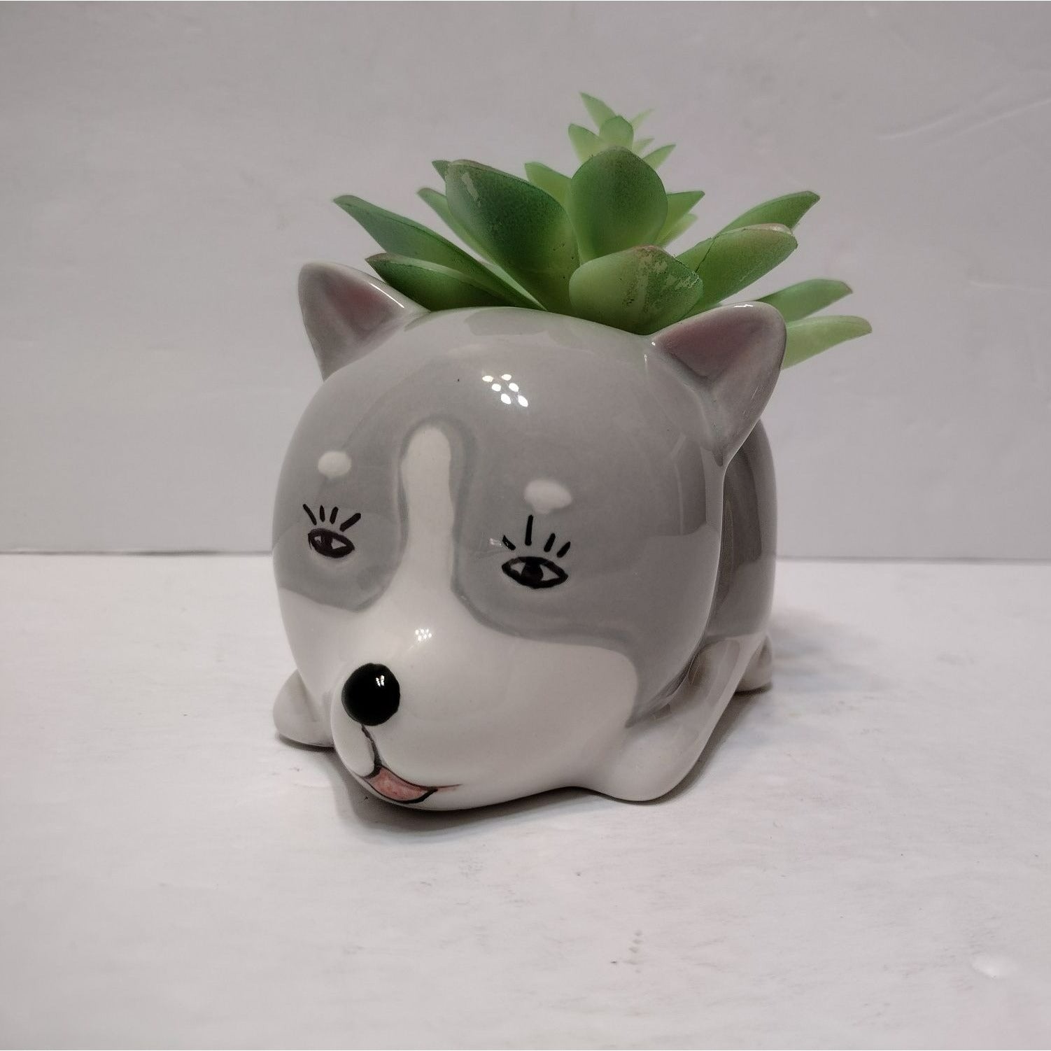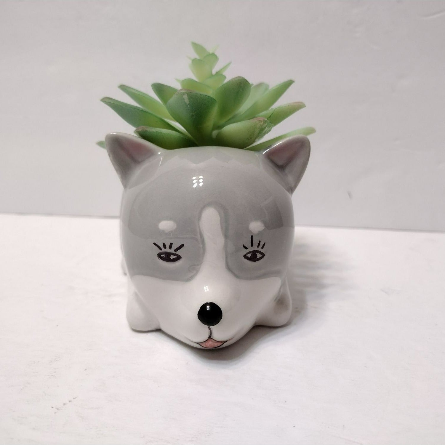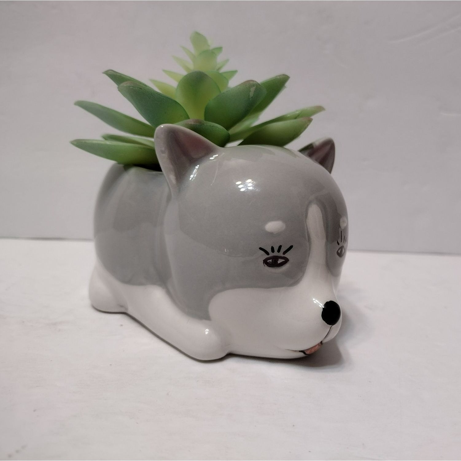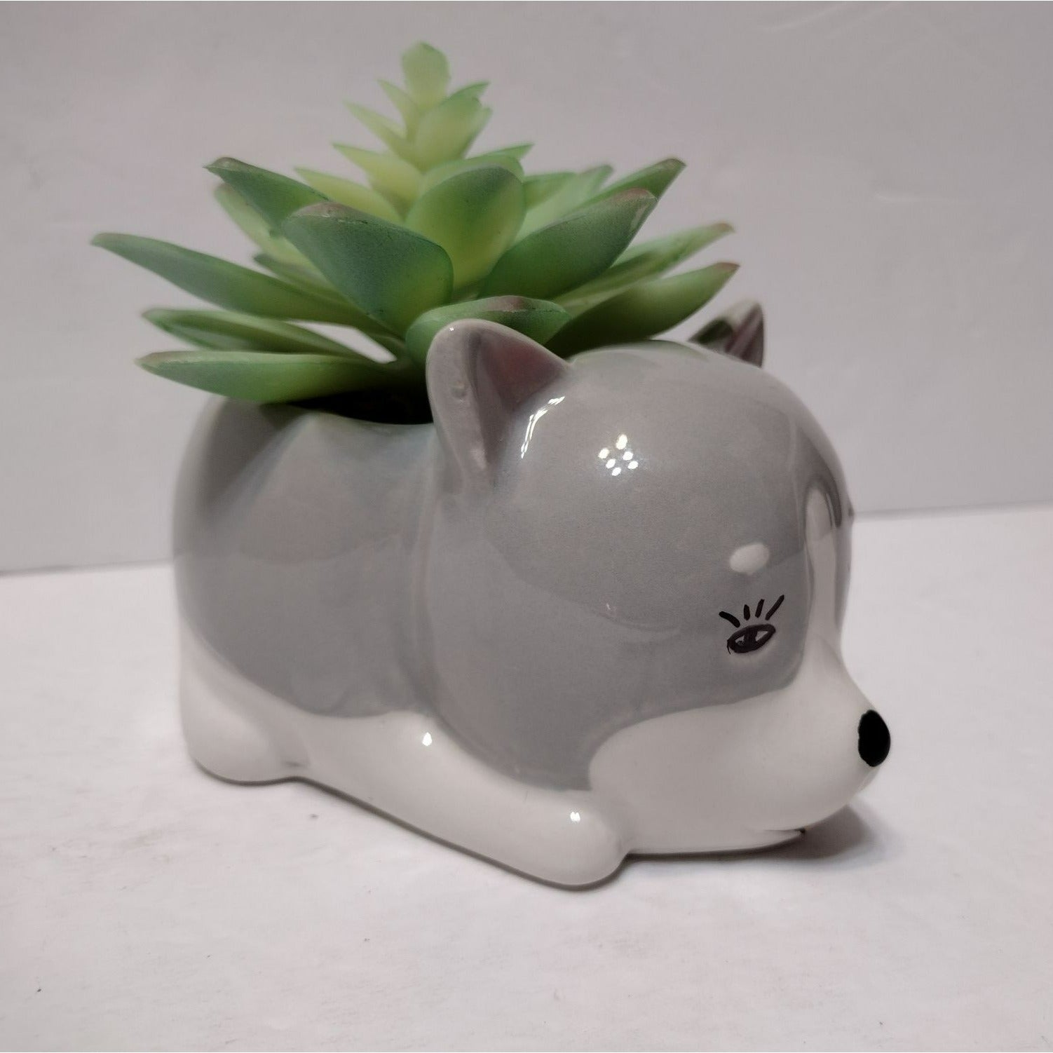 Husky Dog with Faux Plant, Grey Ceramic Puppy Animal Succulent Planter Pot Gift