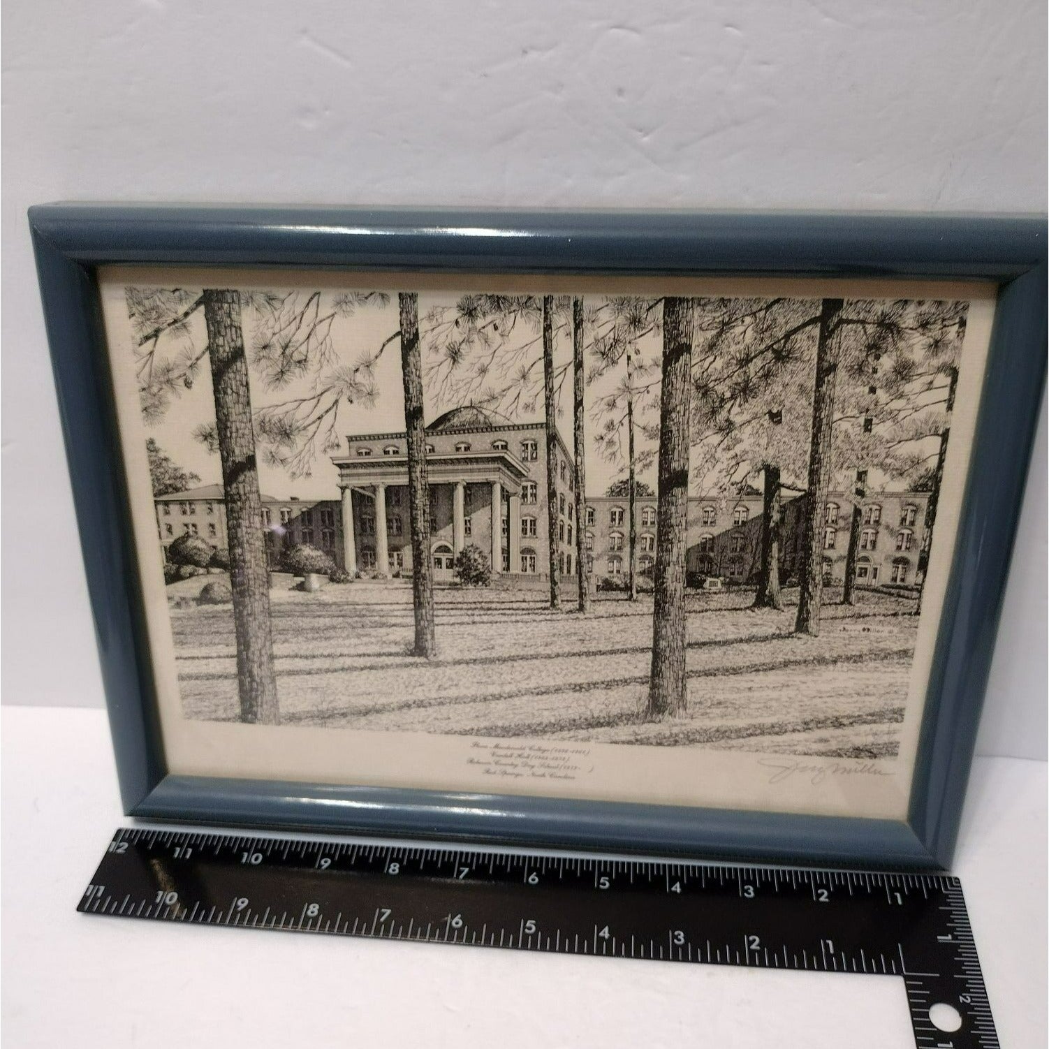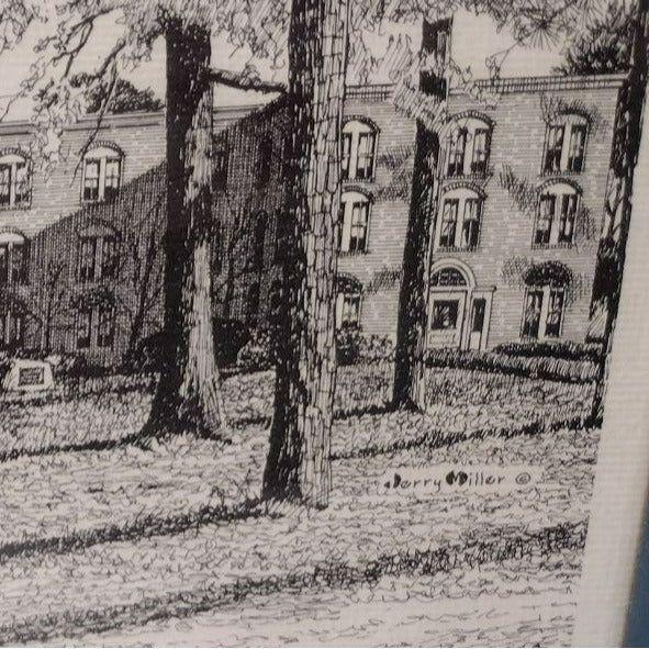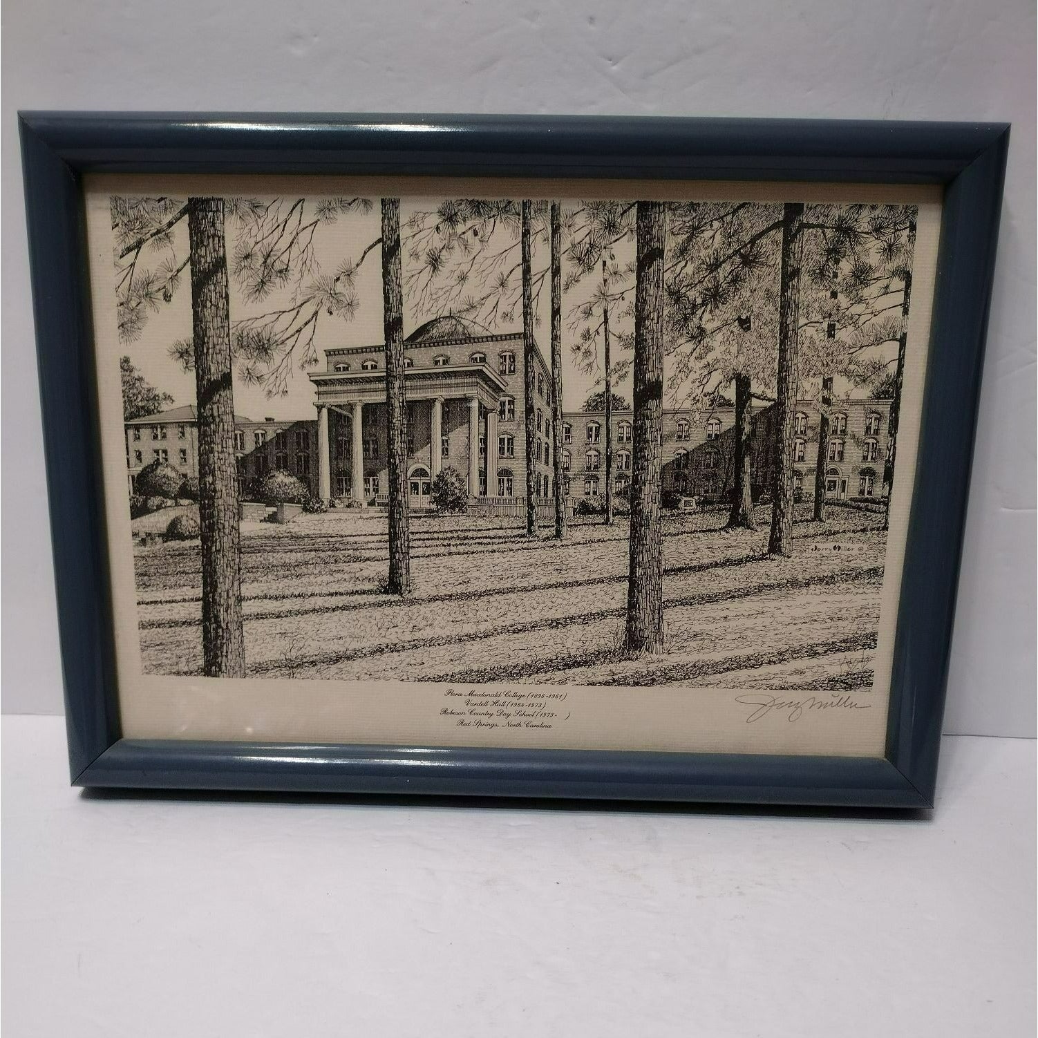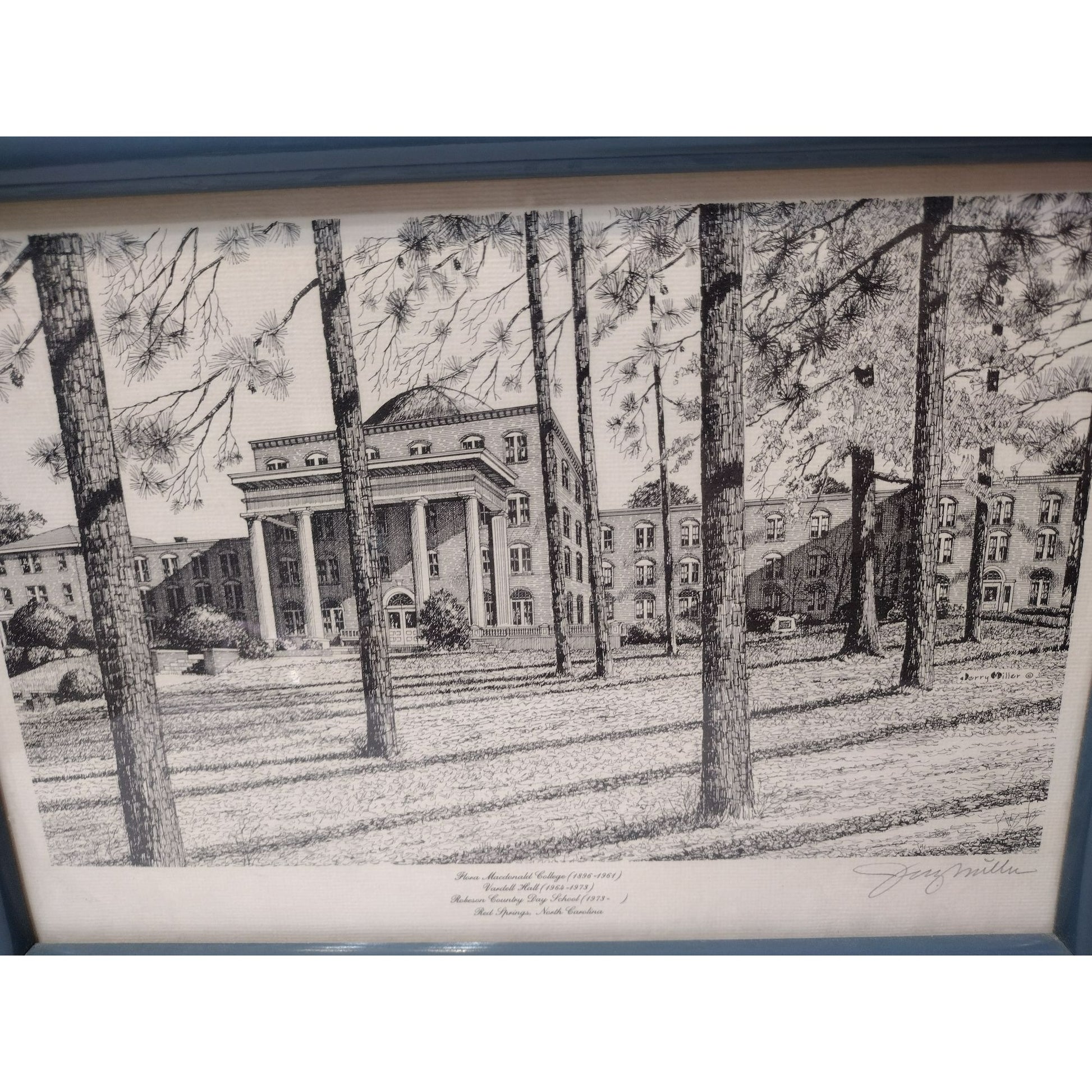 Lovely detailed pen and ink print hand signed by artist Jerry Miller. It is professionally framed in a slate blue frame with wire on the back for hanging. The subject of this piece is the lovely, old architectural building of the Robeson Country Day School in Red Springs, North Carolina, USA. This building from the 1800's was previously known as the Flora Macdonald College (a woman's college founded in 1896) and then Vardell Hall School.
