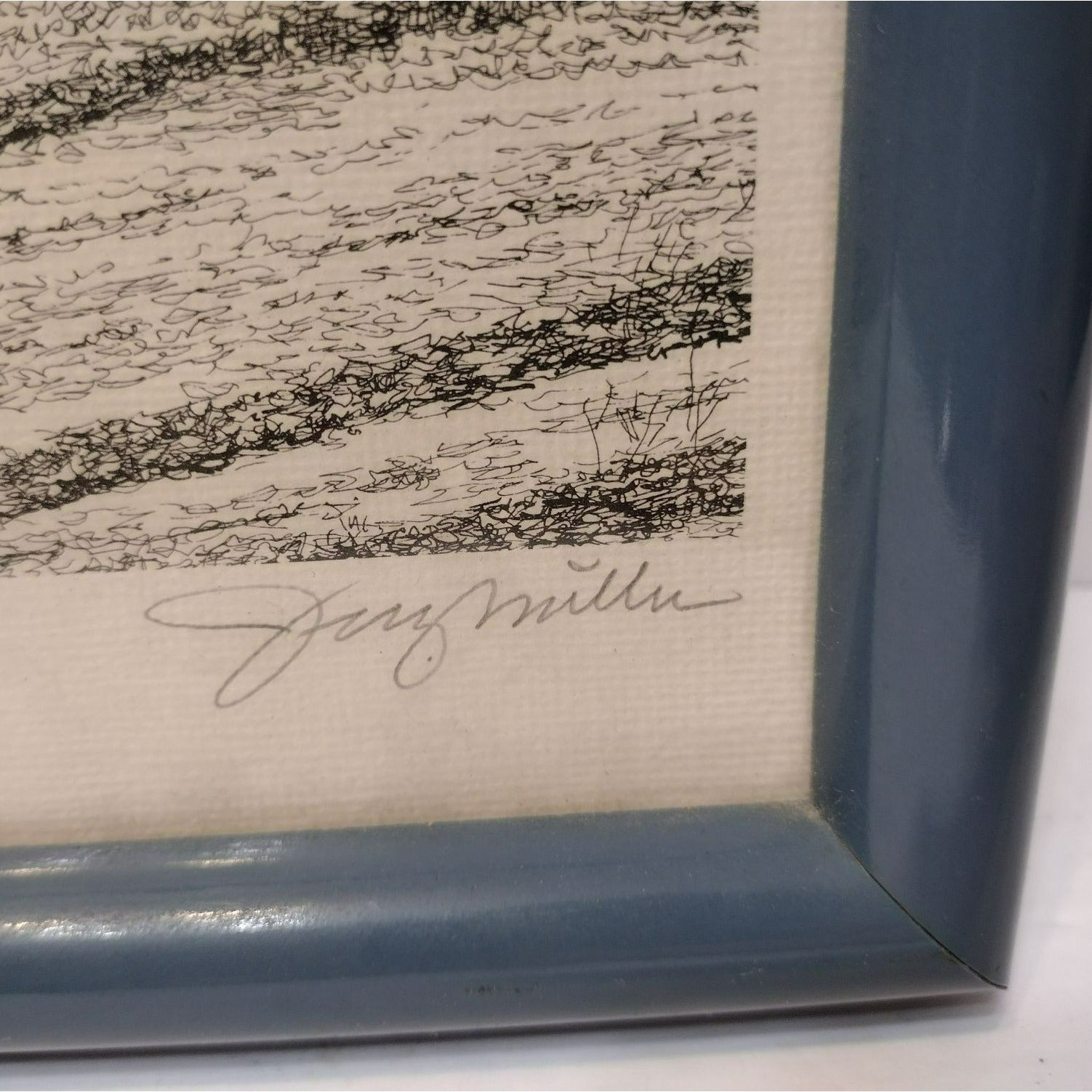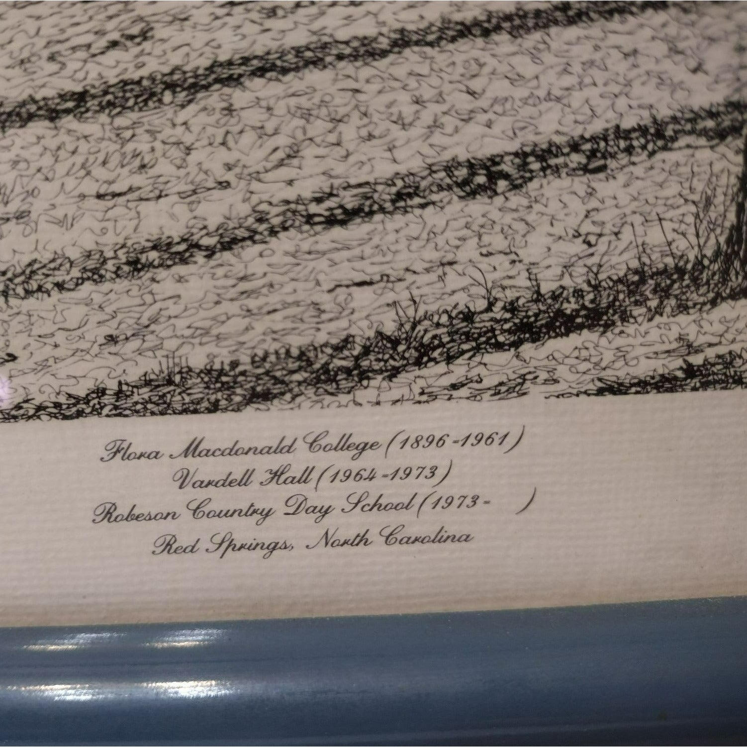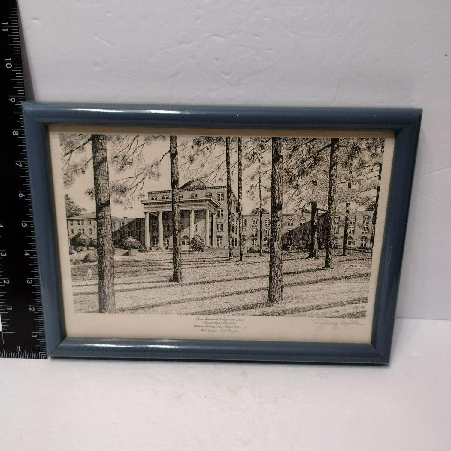 Lovely detailed pen and ink print hand signed by artist Jerry Miller. It is professionally framed in a slate blue frame with wire on the back for hanging. The subject of this piece is the lovely, old architectural building of the Robeson Country Day School in Red Springs, North Carolina, USA. This building from the 1800's was previously known as the Flora Macdonald College (a woman's college founded in 1896) and then Vardell Hall School.