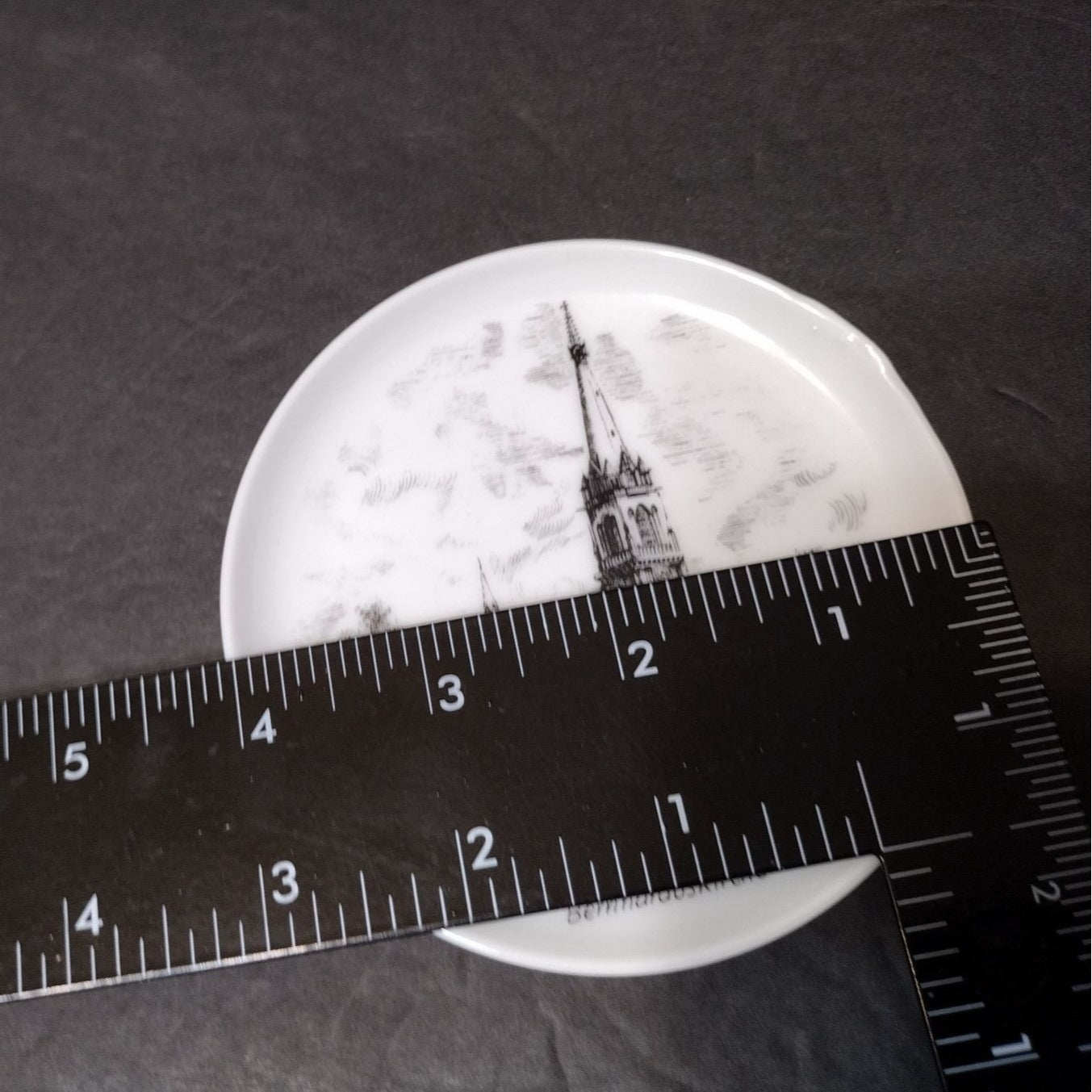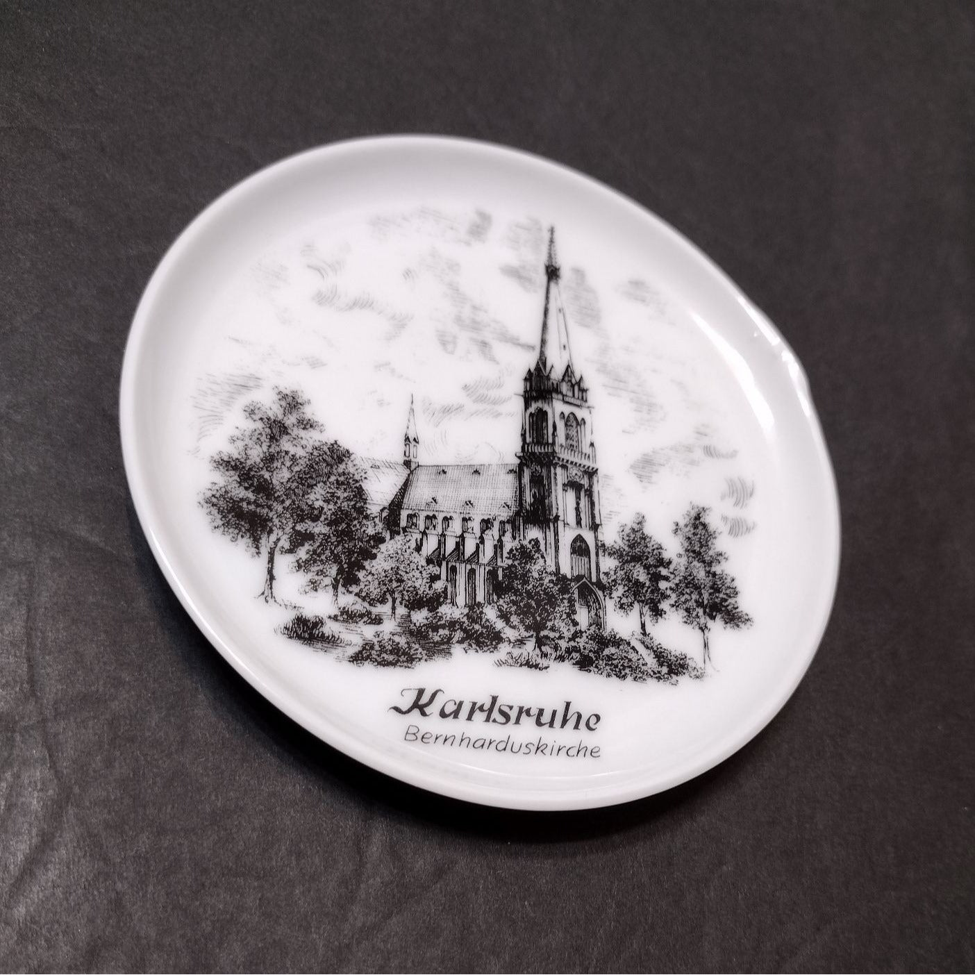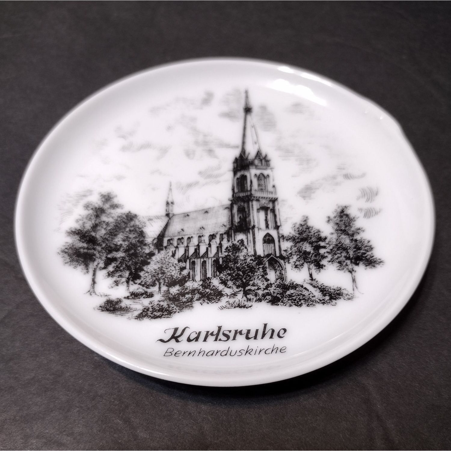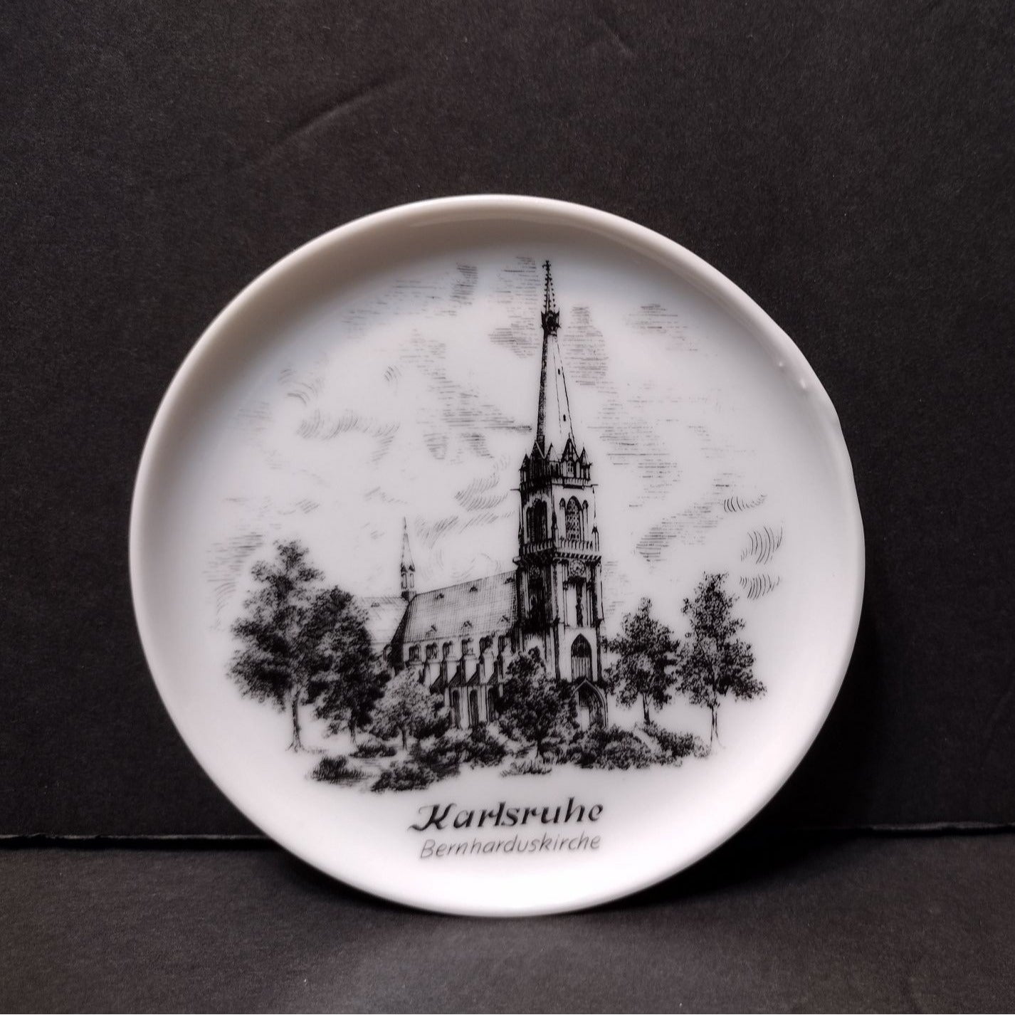 Lovely vintage miniature porcelain plate by Kaiser of West Germany. Could be used as a ring dish, trinket dish, coaster, mini individual snack dish. This one shows the St Bernhard Church landmark in Karlsruhe, a city in Germany. Marked on the back "Kaiser, West Germany", dating it to between 1949 and 1990.