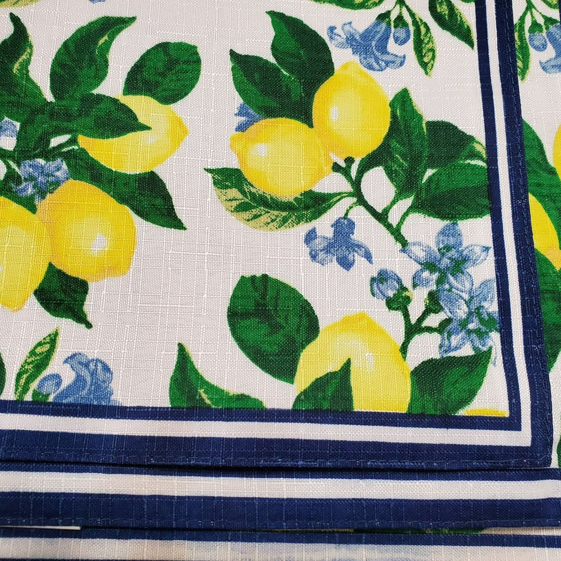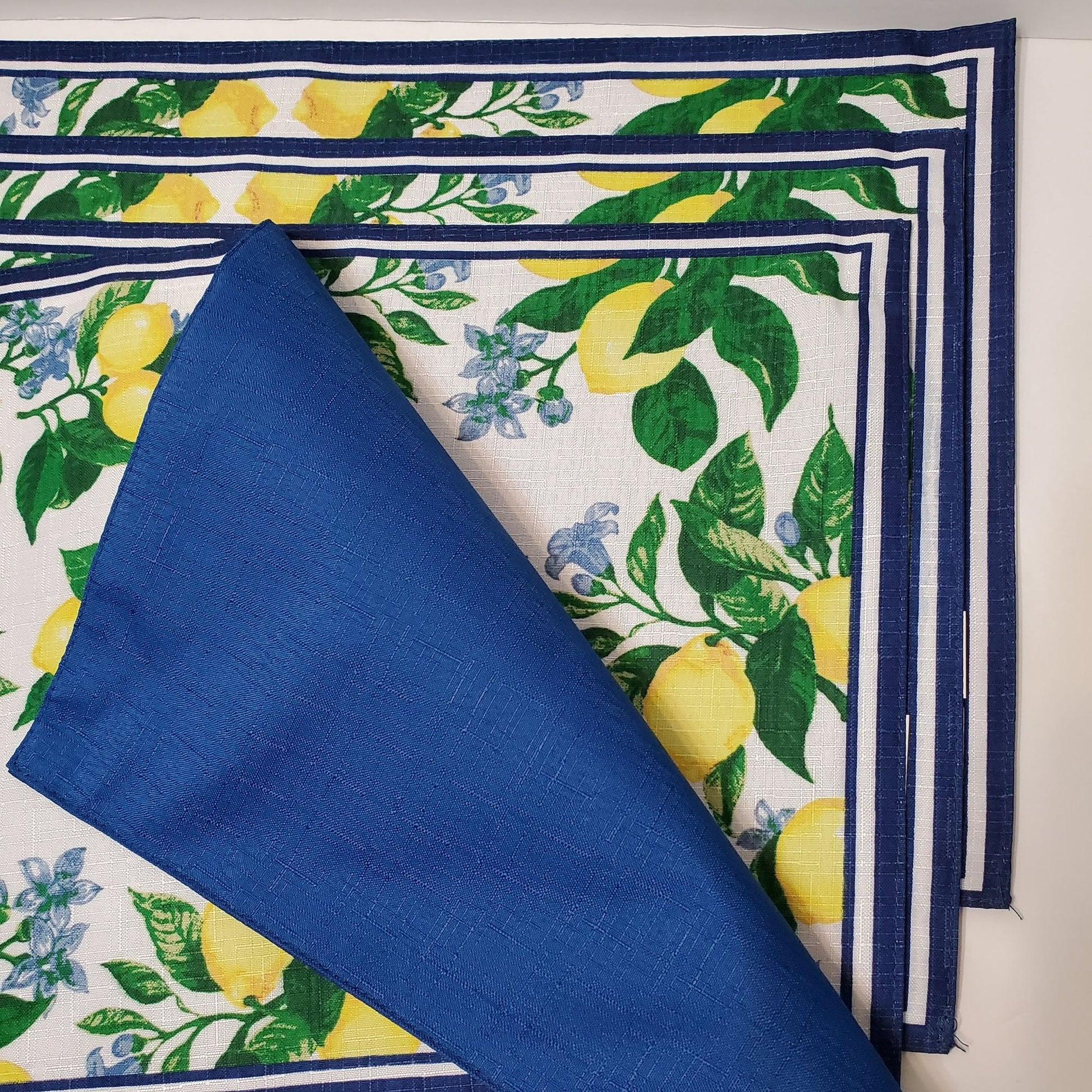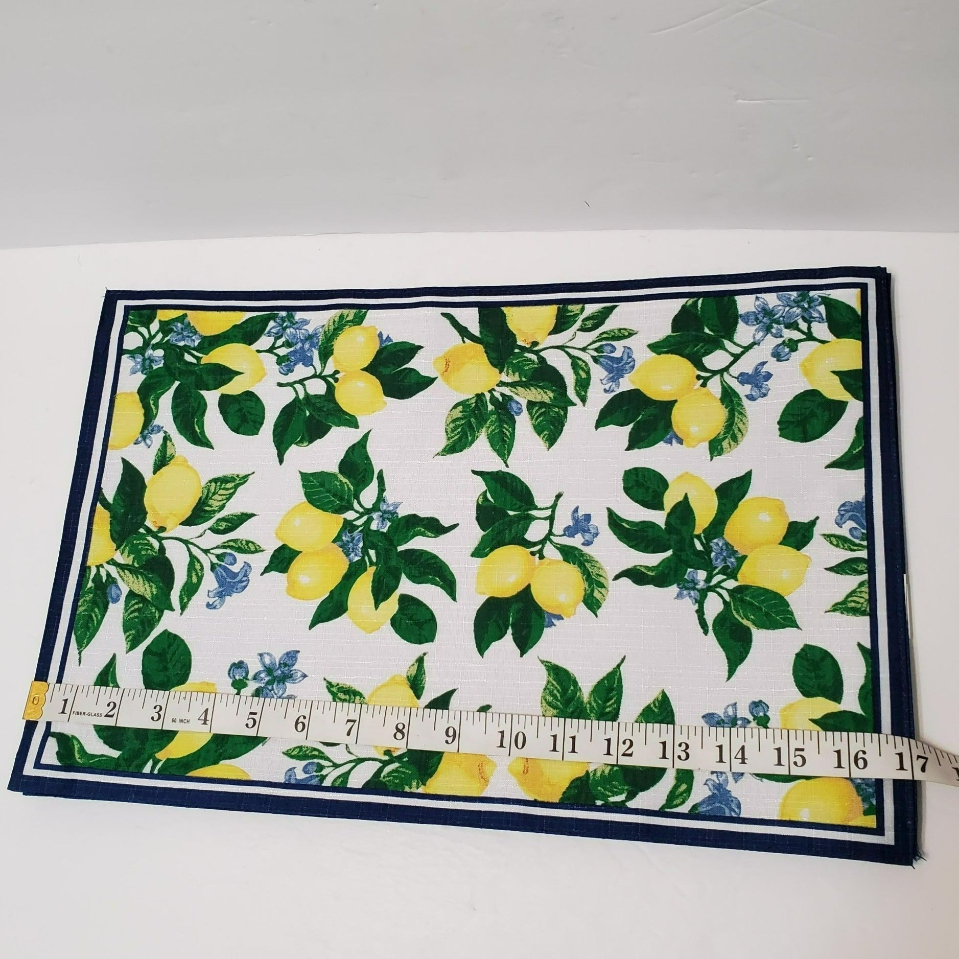 Lemon Citrus Placemats, Set of 4, Fabric Reversible Blue, Washable 17x11 NEW