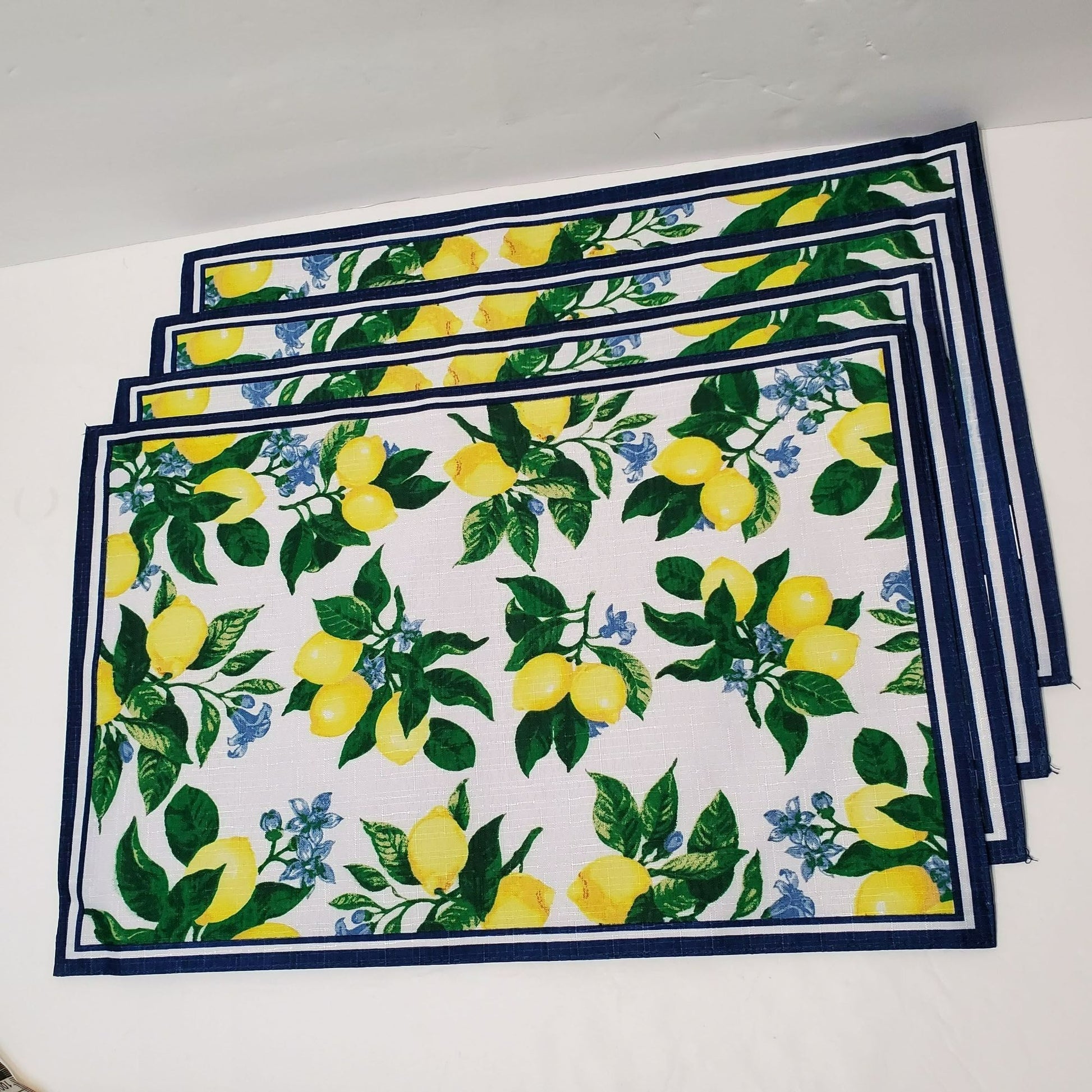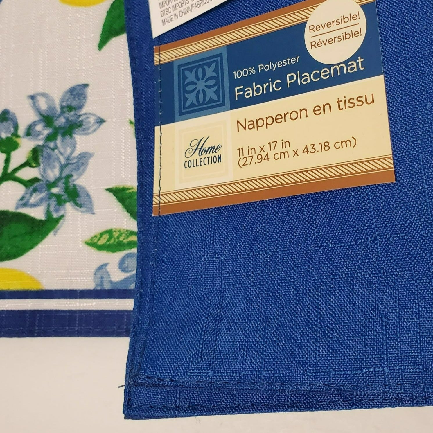 Brighten up your dining area with the Home Collection's Lemon Citrus Placemats. This set of 4 reversible, washable placemats features a Mediterranean cottage style, lemon decor on a blue and yellow polyester fabric. They are reversible to a solid blue color.