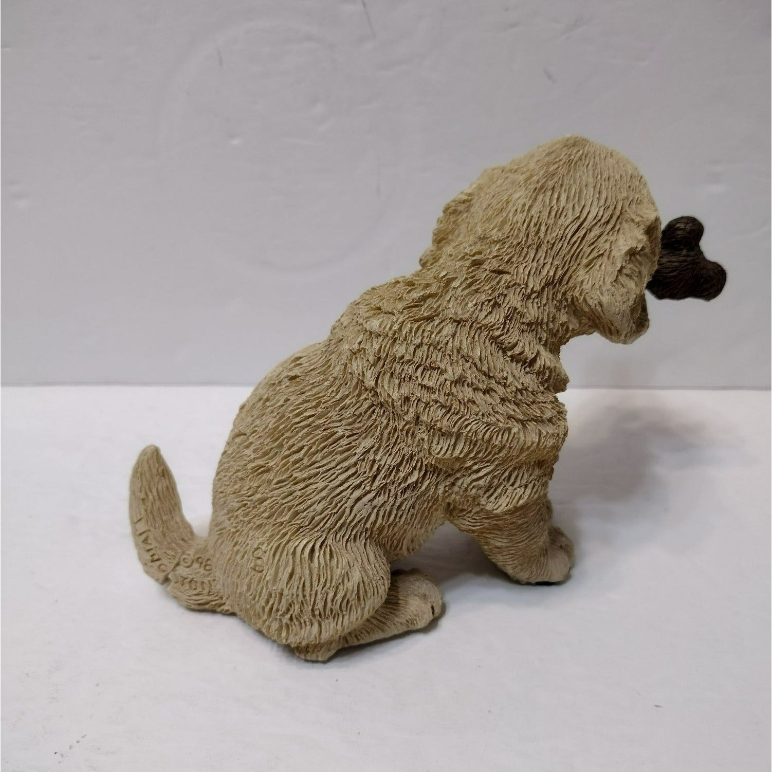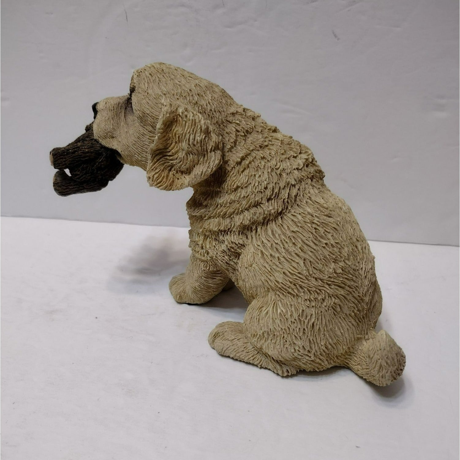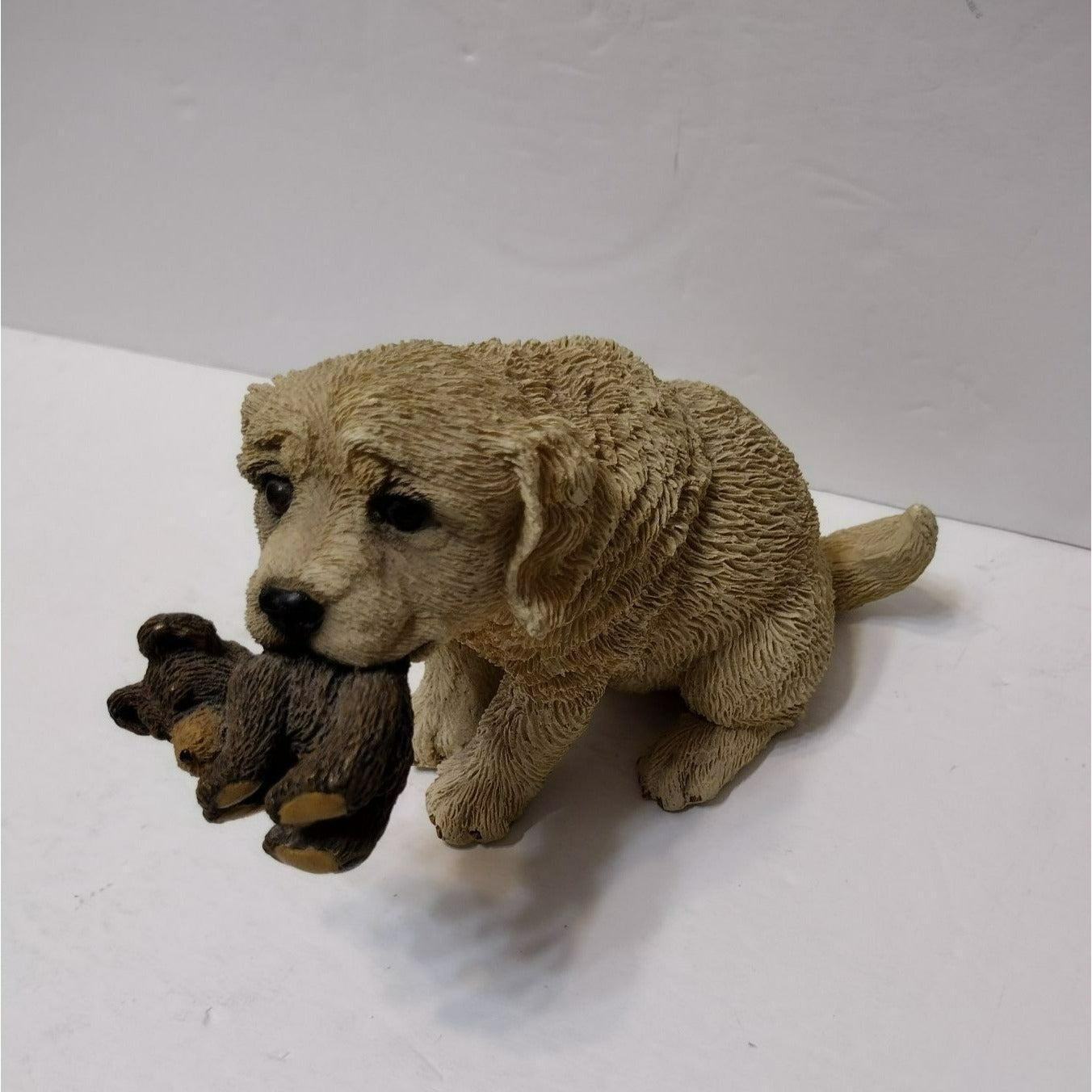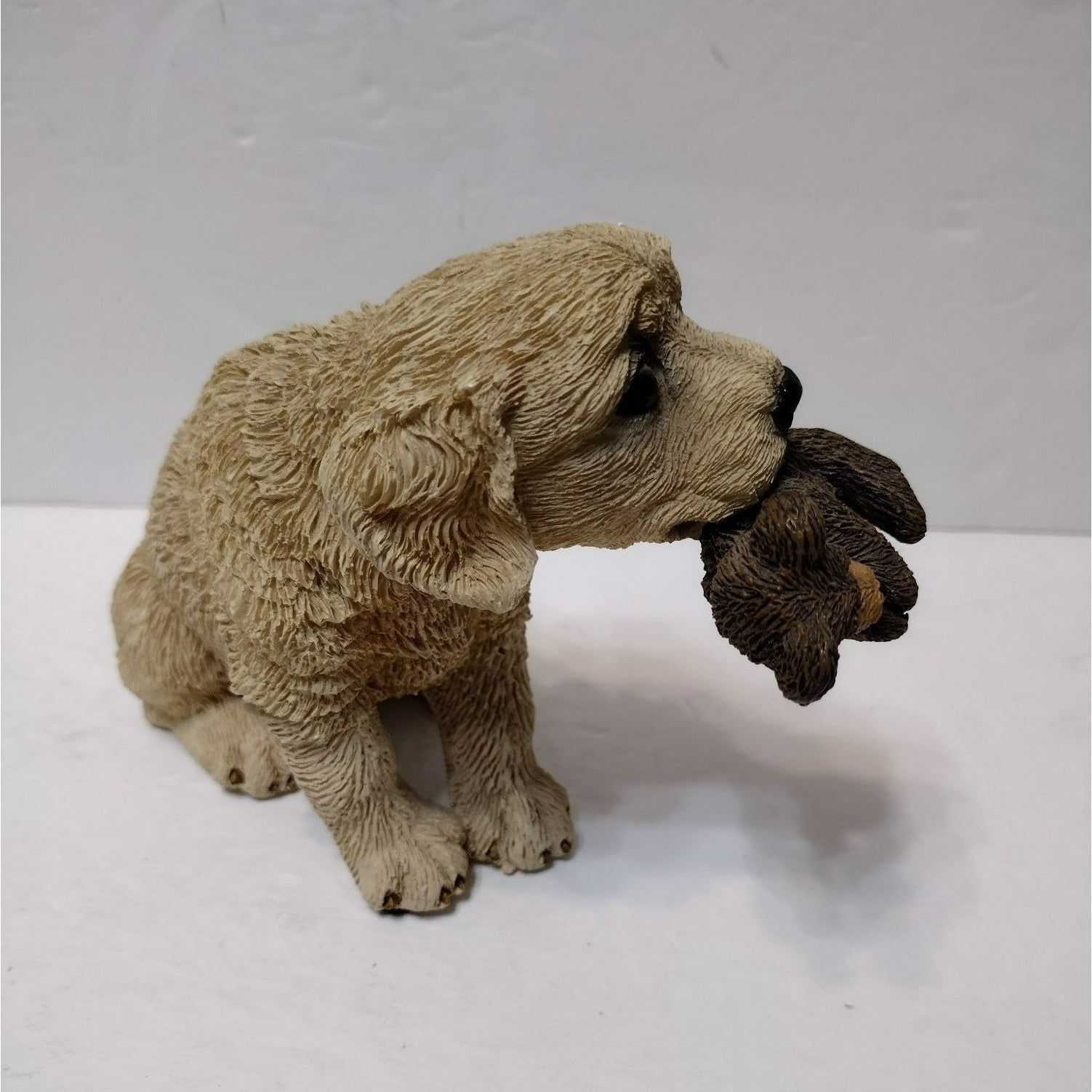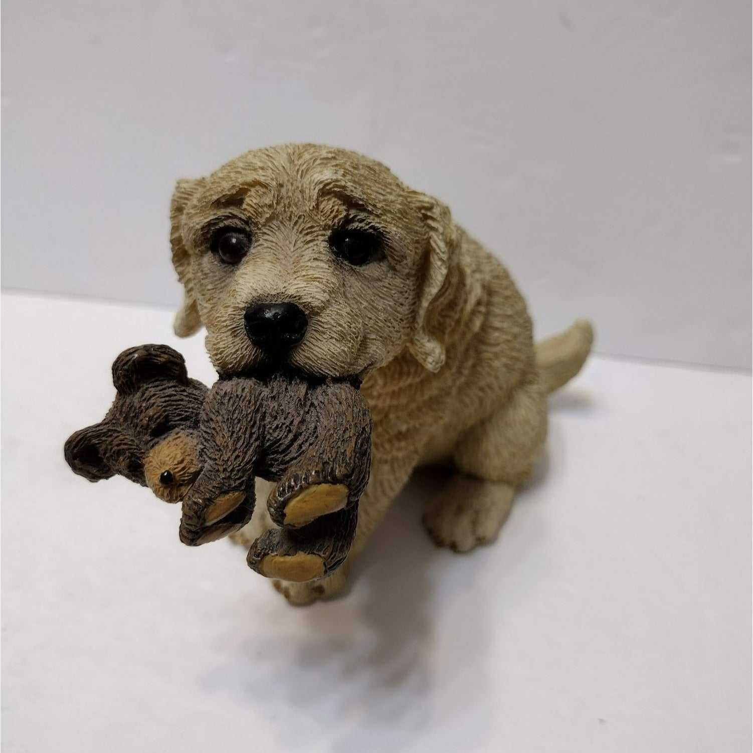 Adorable Living Stone vintage 1998 Golden Retriever dog figurine. Crafted from heavy resin, this charming statue showcases a puppy cuddling with a teddy bear. Its beige and brown color palette adds a realistic touch.