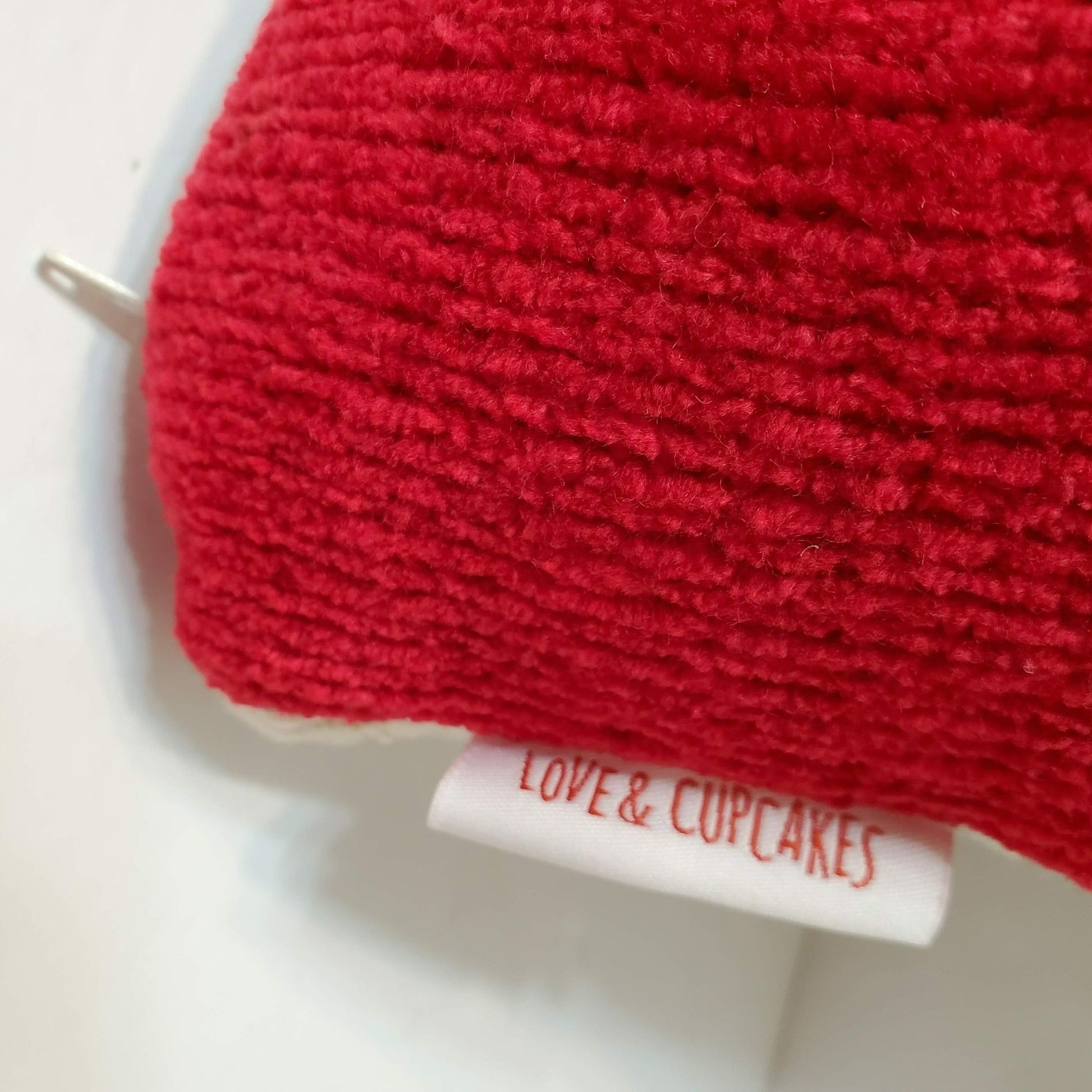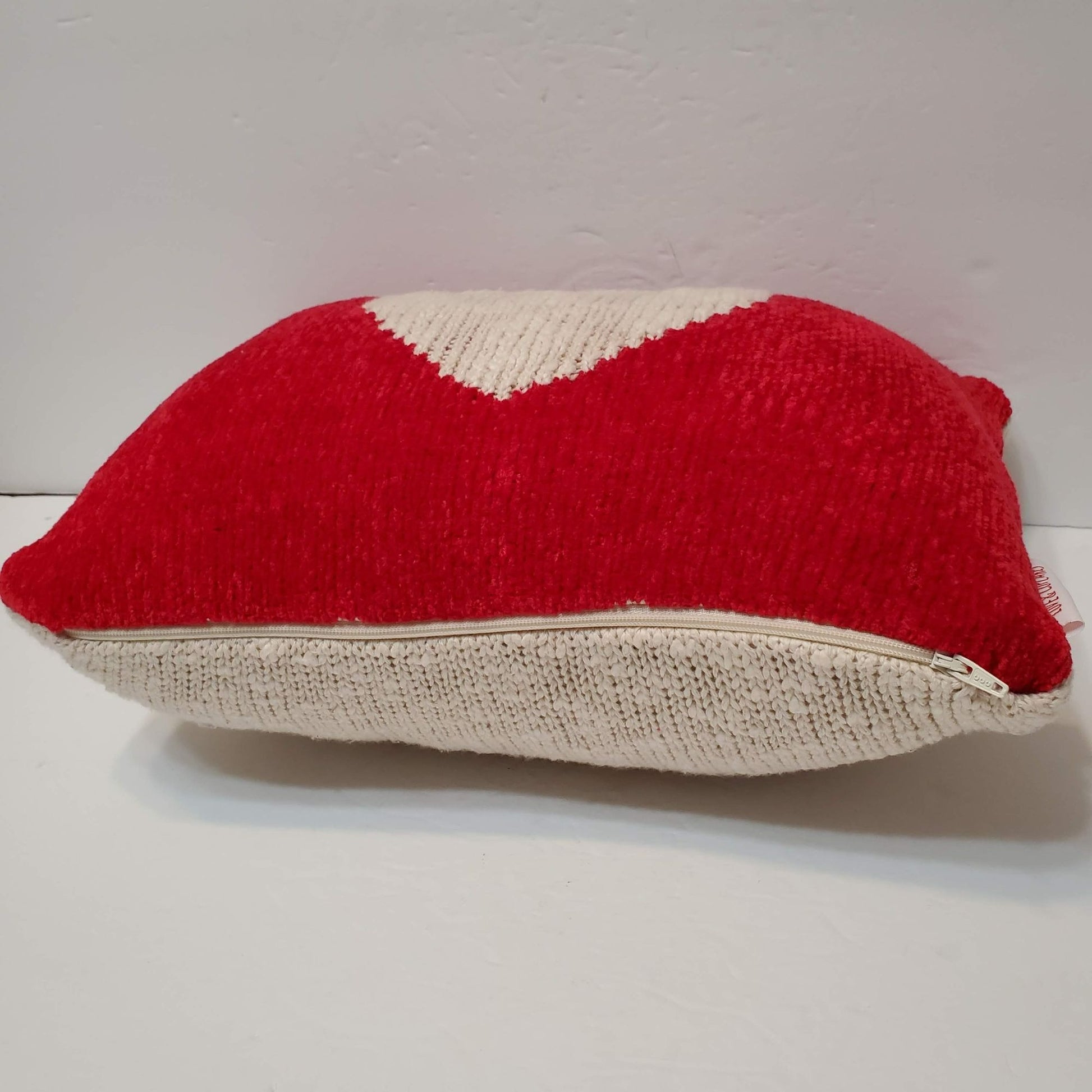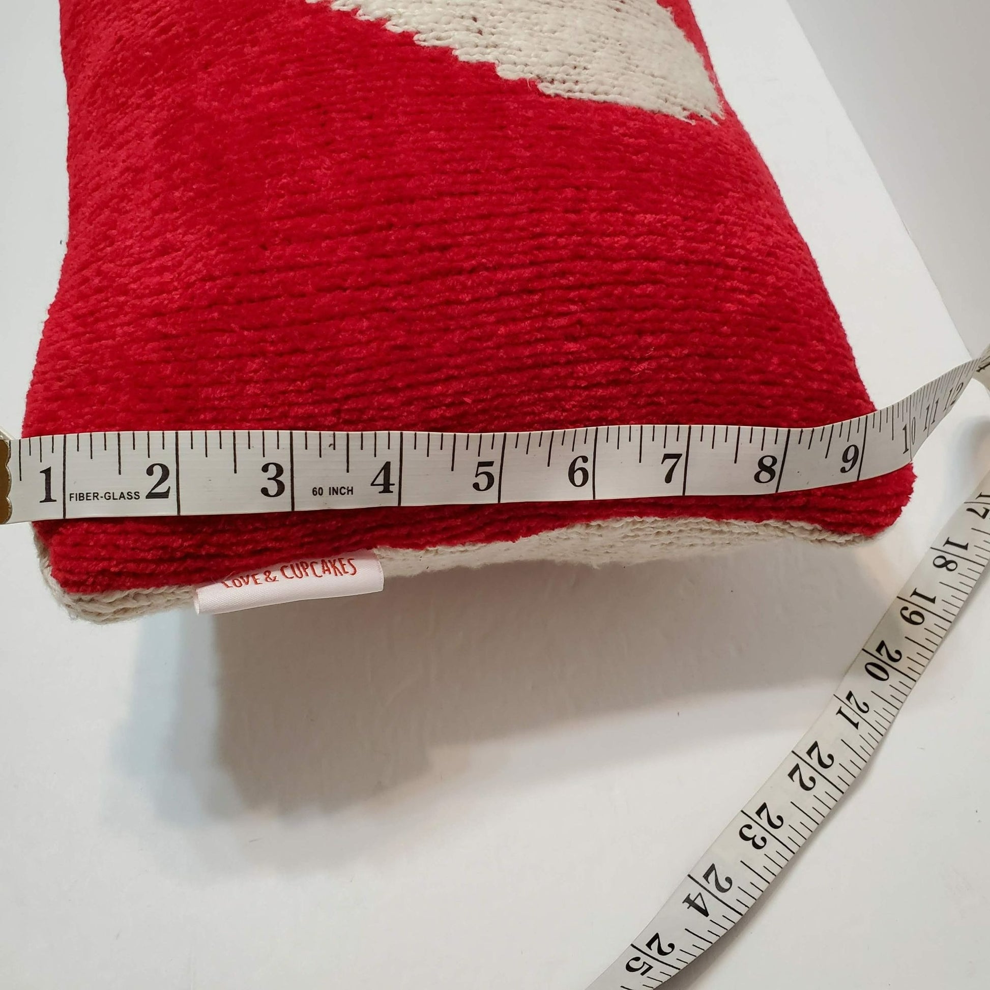 LIKE NEW Love & Cupcakes Knitted Heart Accent Pillow in vibrant red and white. Perfect for Valentine's Day or to add a romantic touch to any setting.