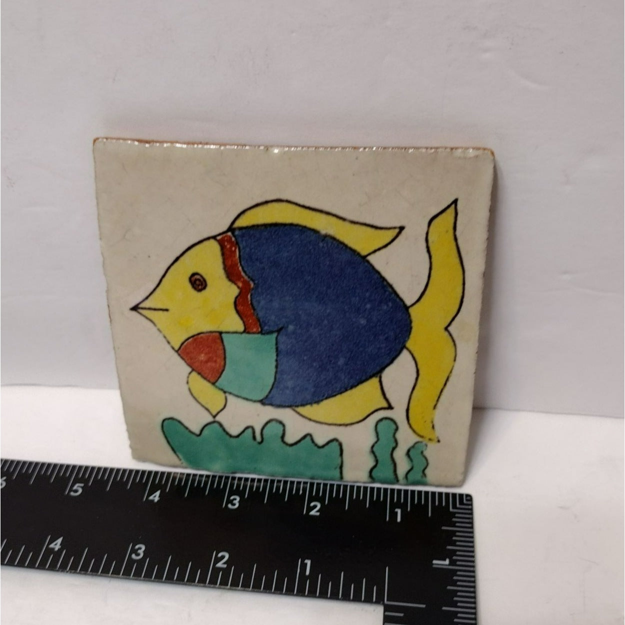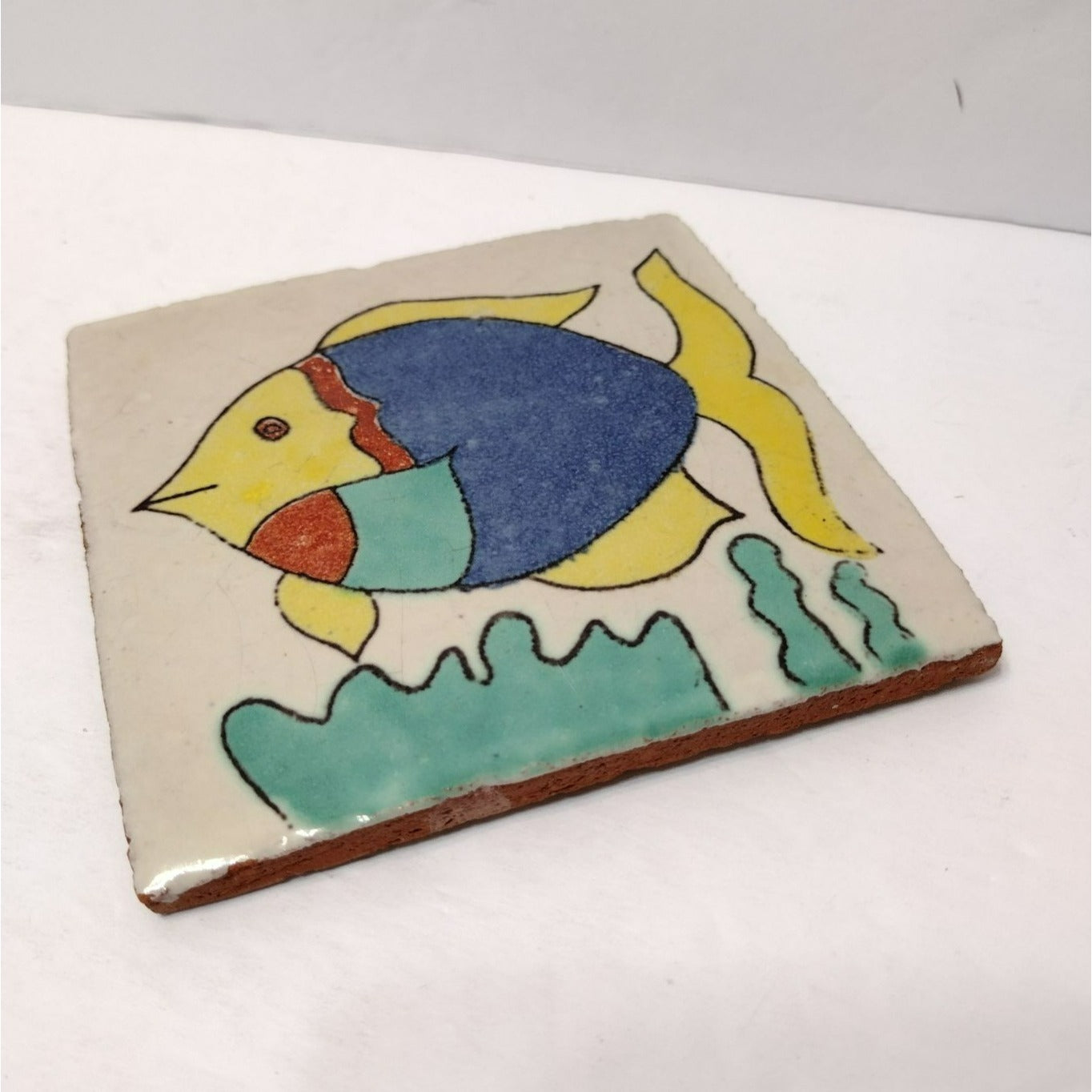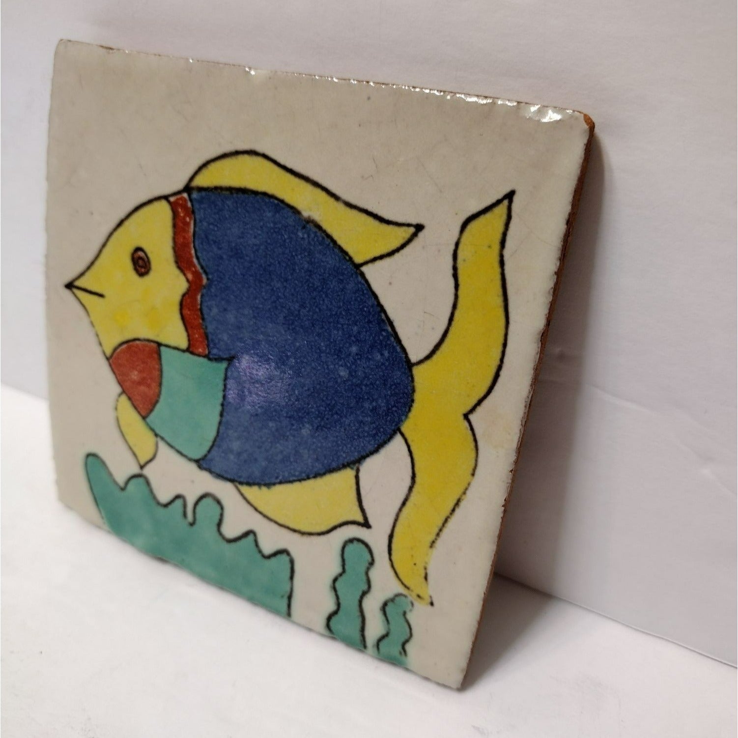 Mexican Folk Art Hand Crafted Art Tile, Ceramic Fish Coastal Yellow Blue Trivet
