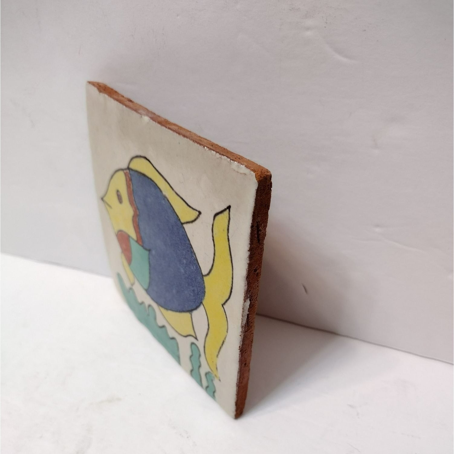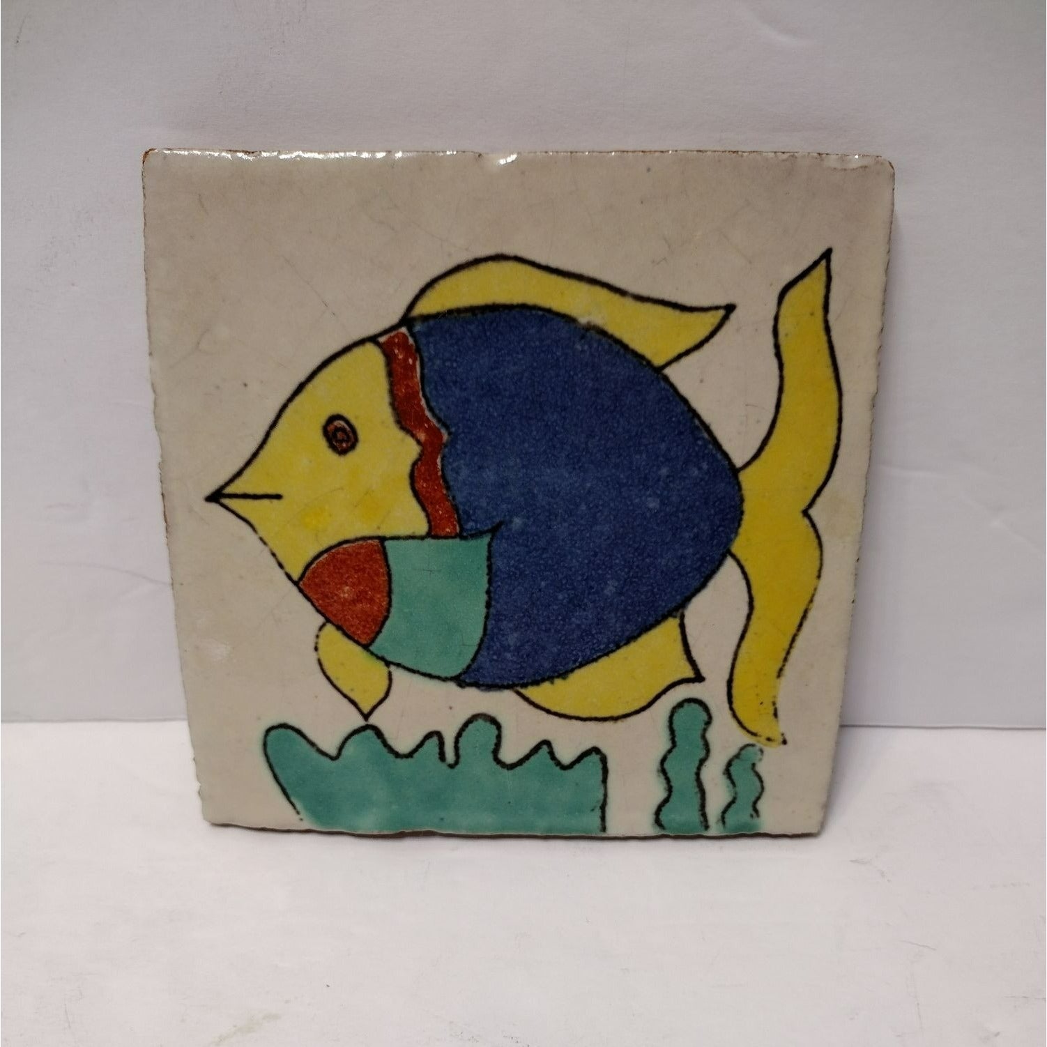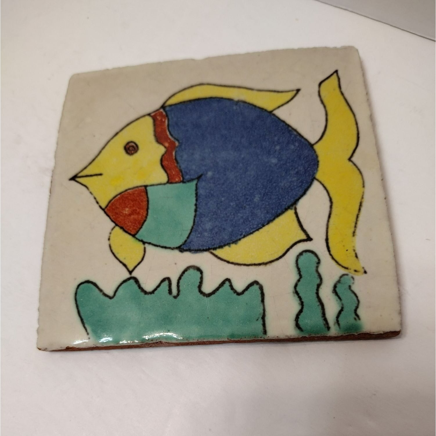 Mexican Folk Art Hand Crafted Art Tile, Ceramic Fish Coastal Yellow Blue Trivet