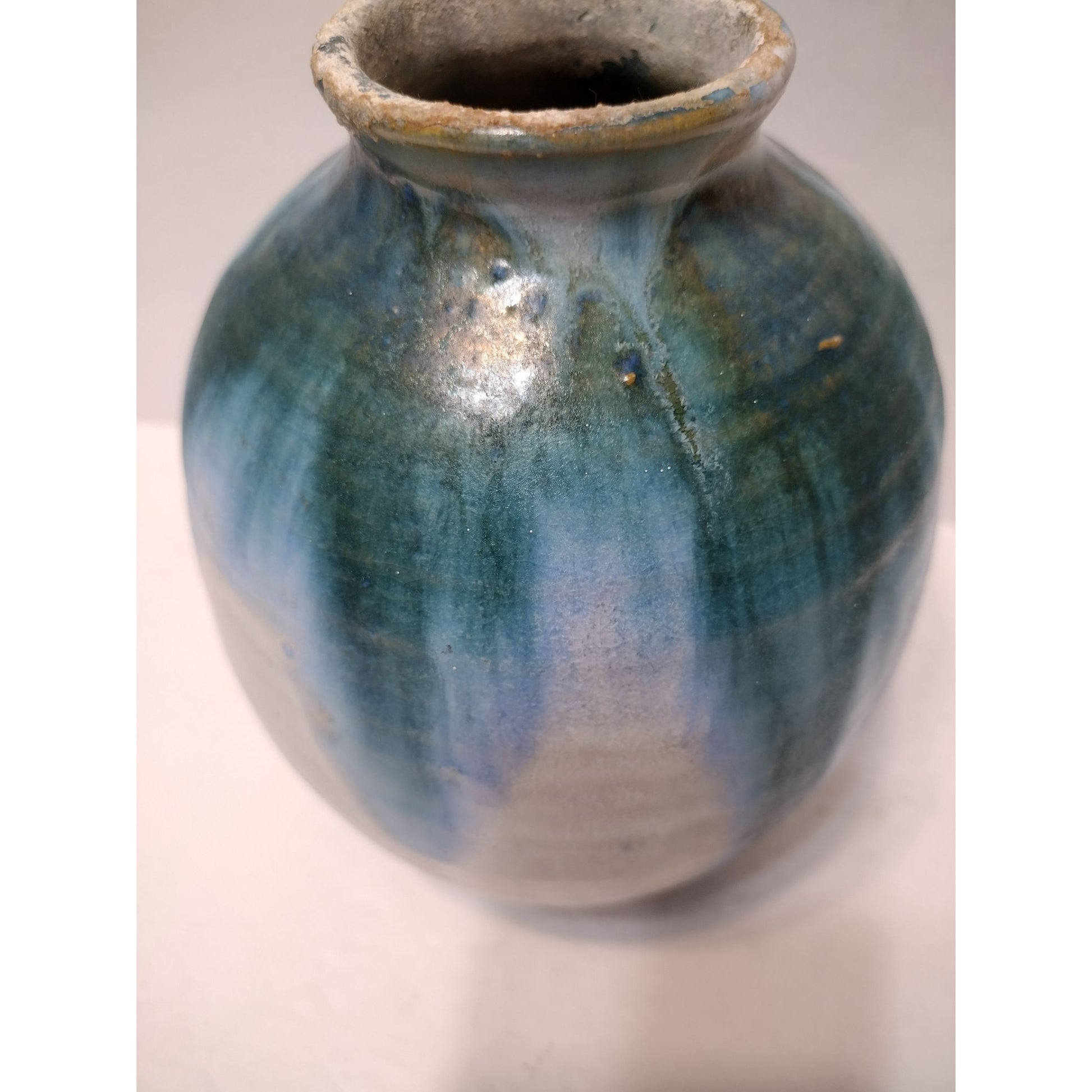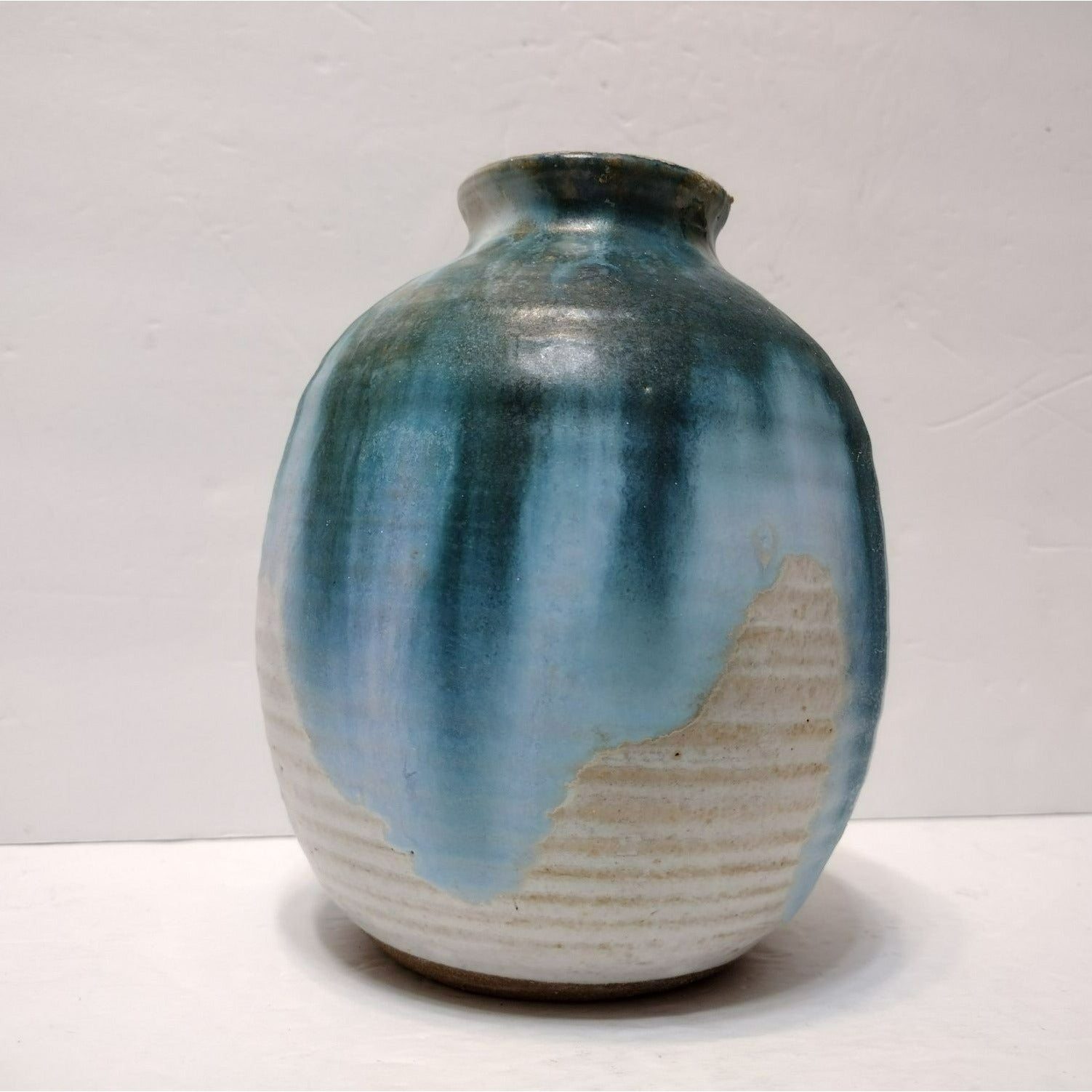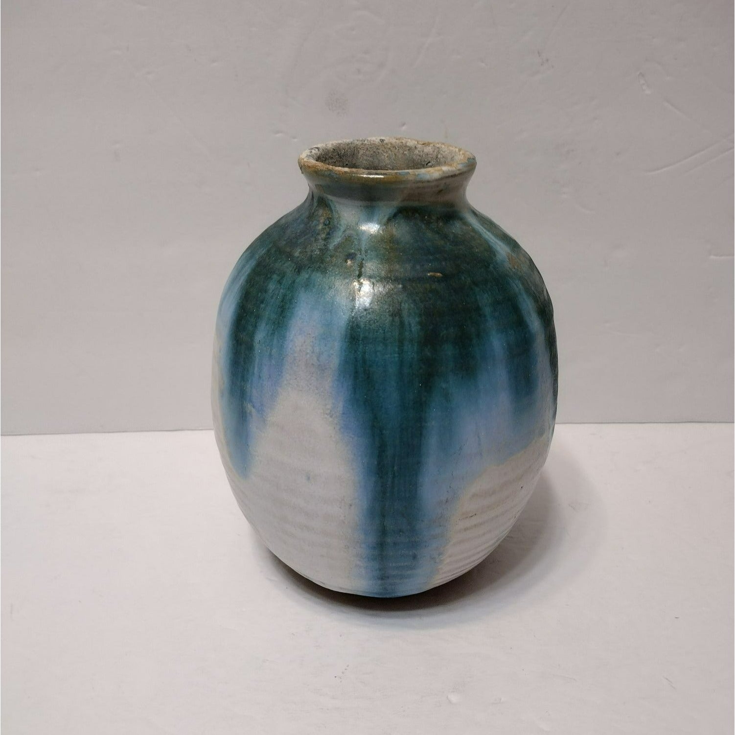 This Richard Sanderson Toad Hall Pottery Vase is a vintage 1980s handmade ceramic piece. The artisan-crafted studio vase, hailing from New Hampshire, showcases beautiful blue and green glaze hues.