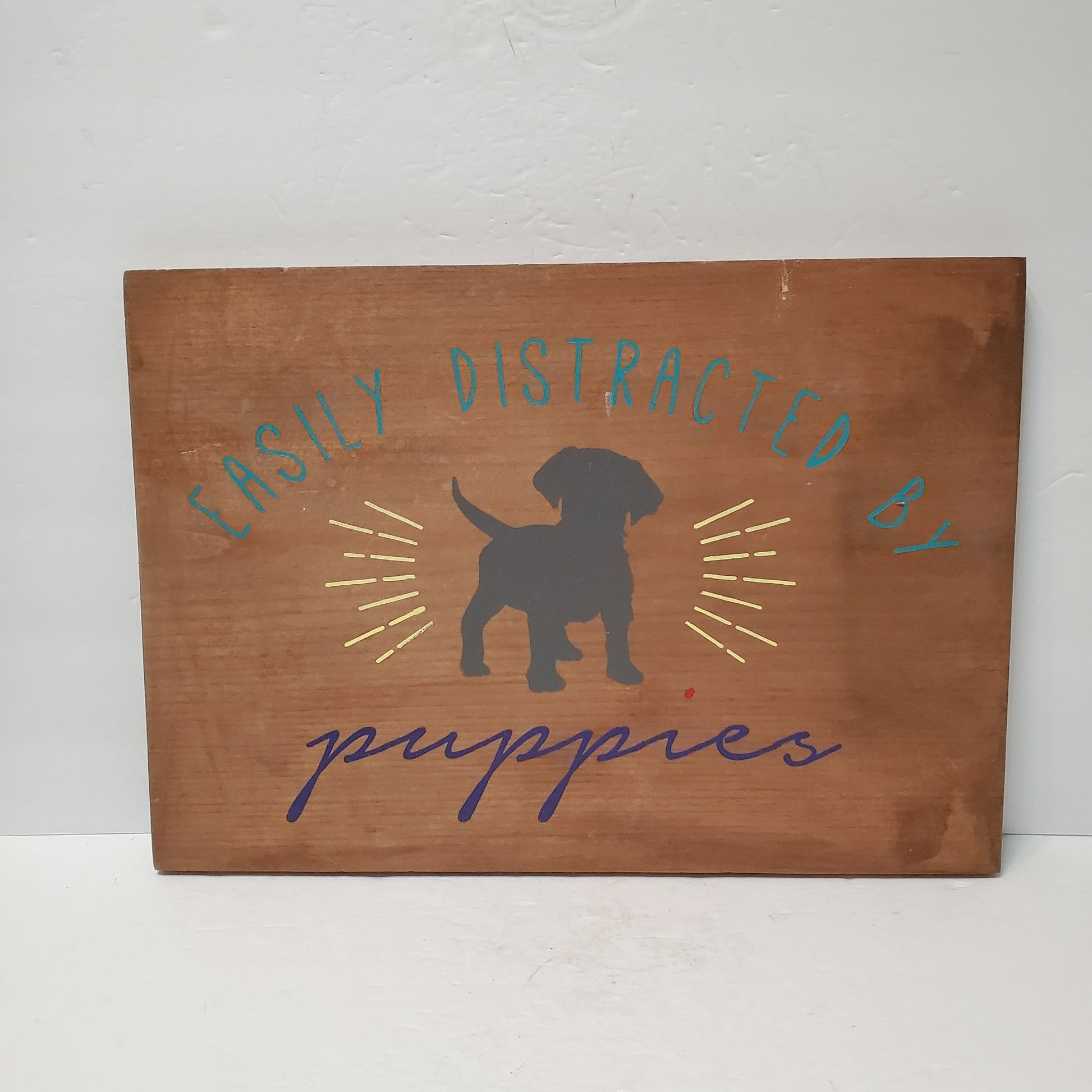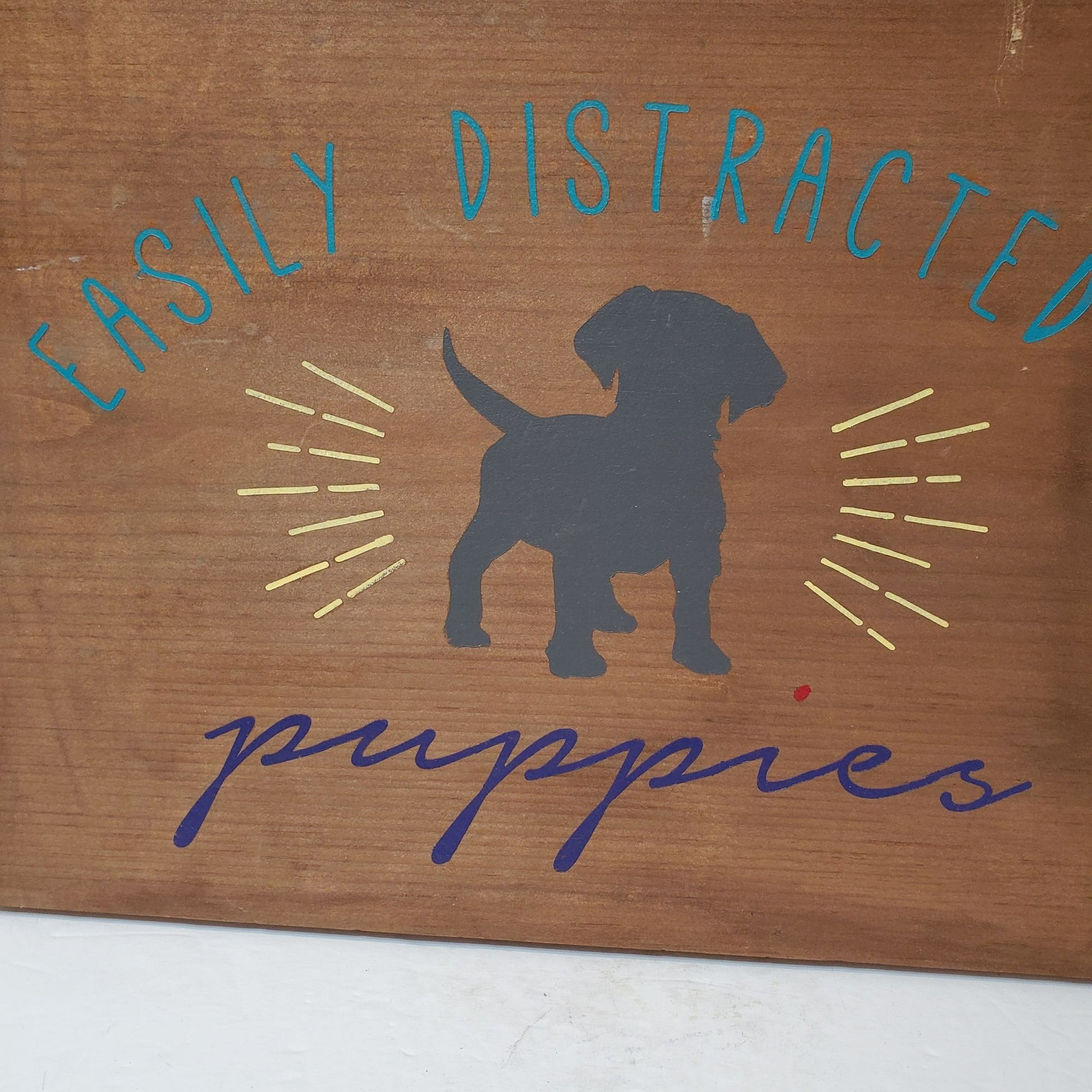 This Hand Crafted Rustic Wooden Wall Sign with an \"Easily Distracted By Puppies\" message is a perfect decor piece for dog lovers. Measuring 16x11, it adds a charming touch to any room.