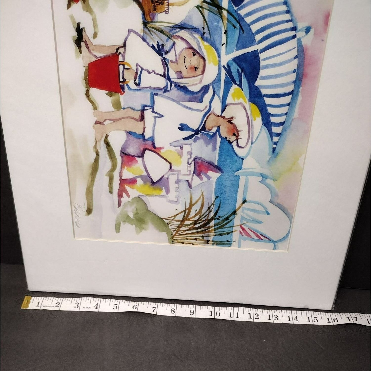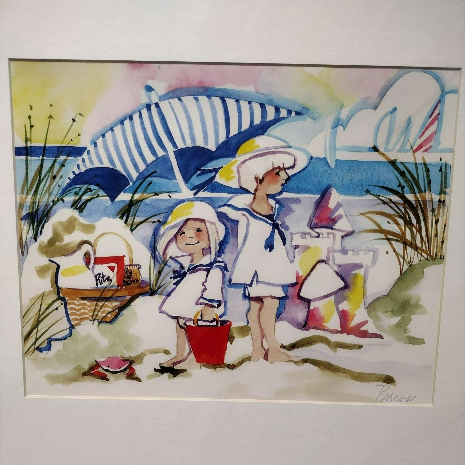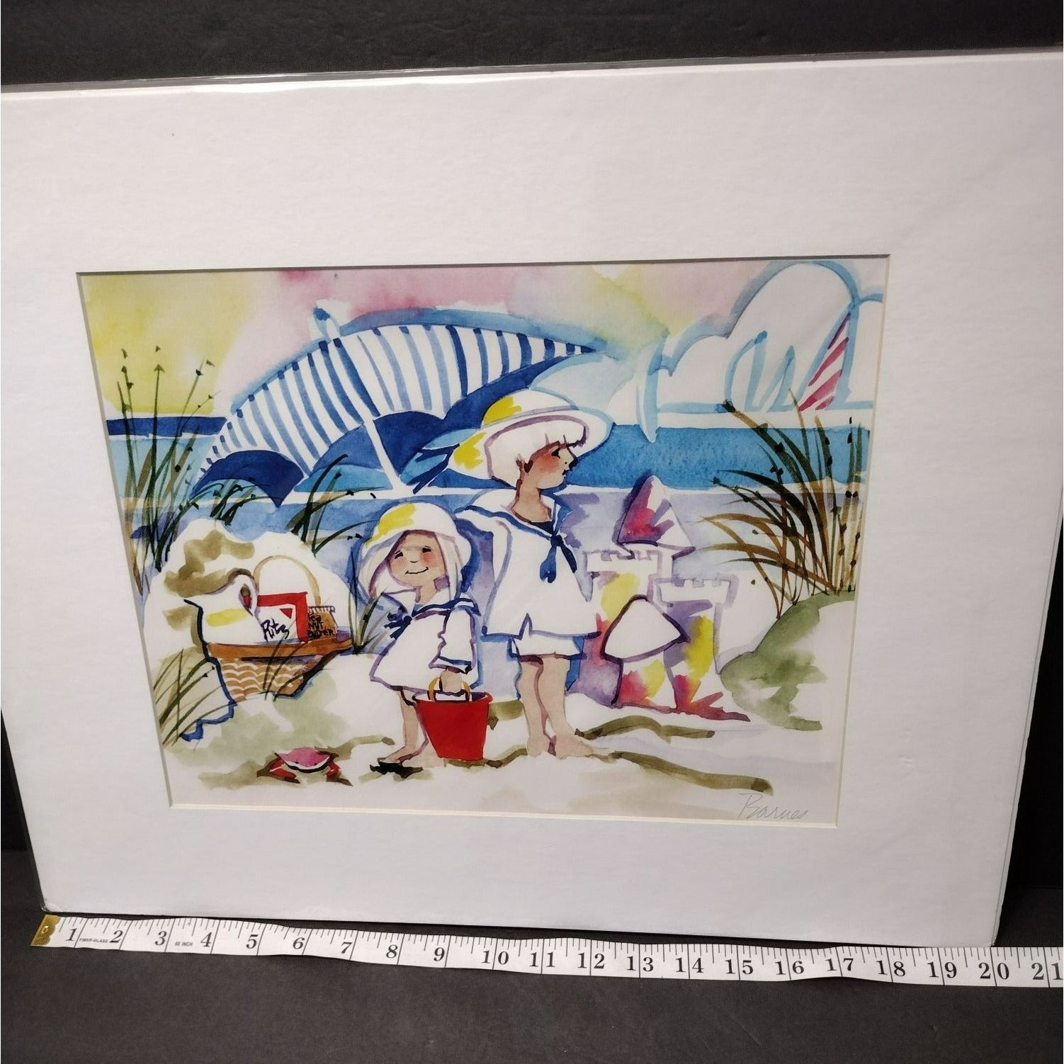 Signed Art Print by Diana Barnes, Matted Watercolor Artwork, Children on Beach