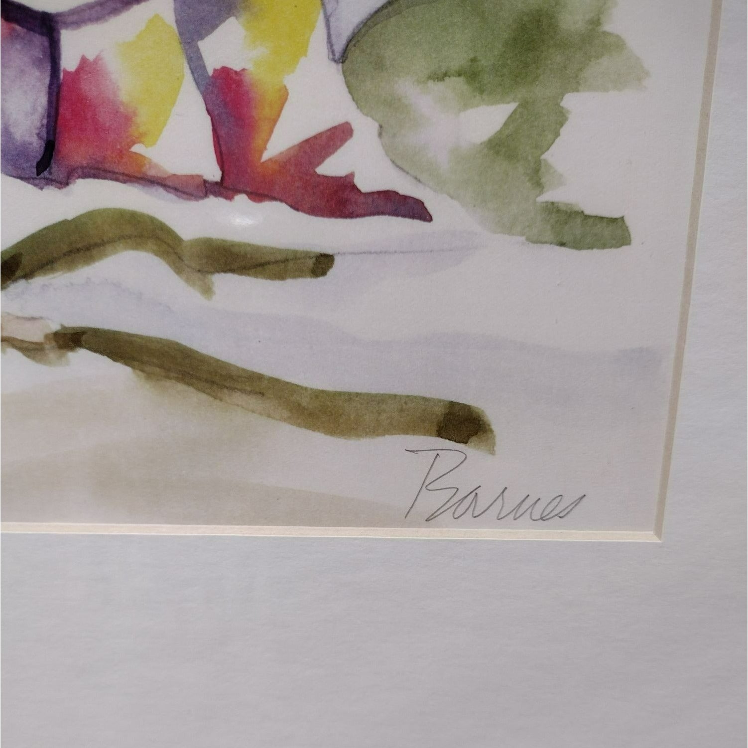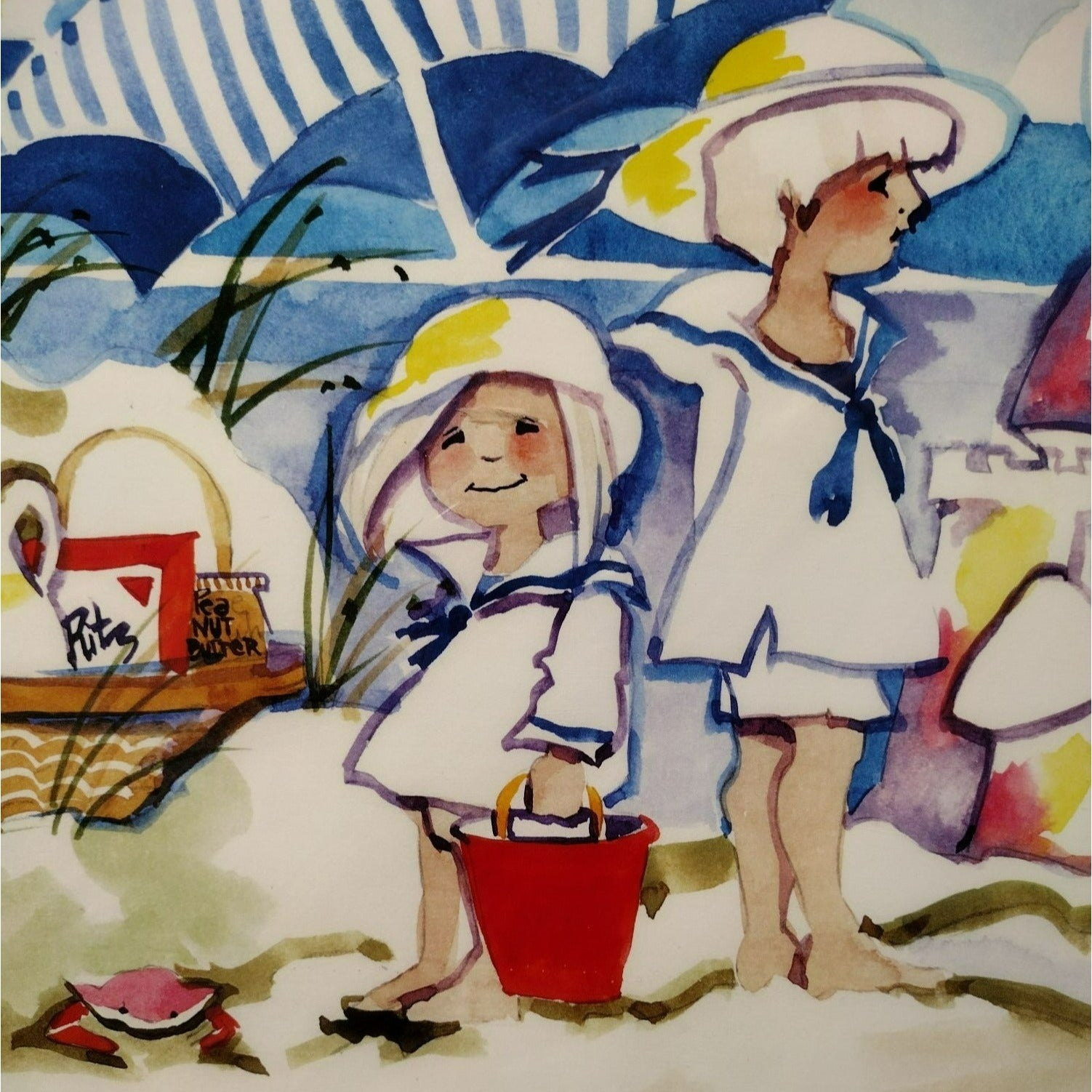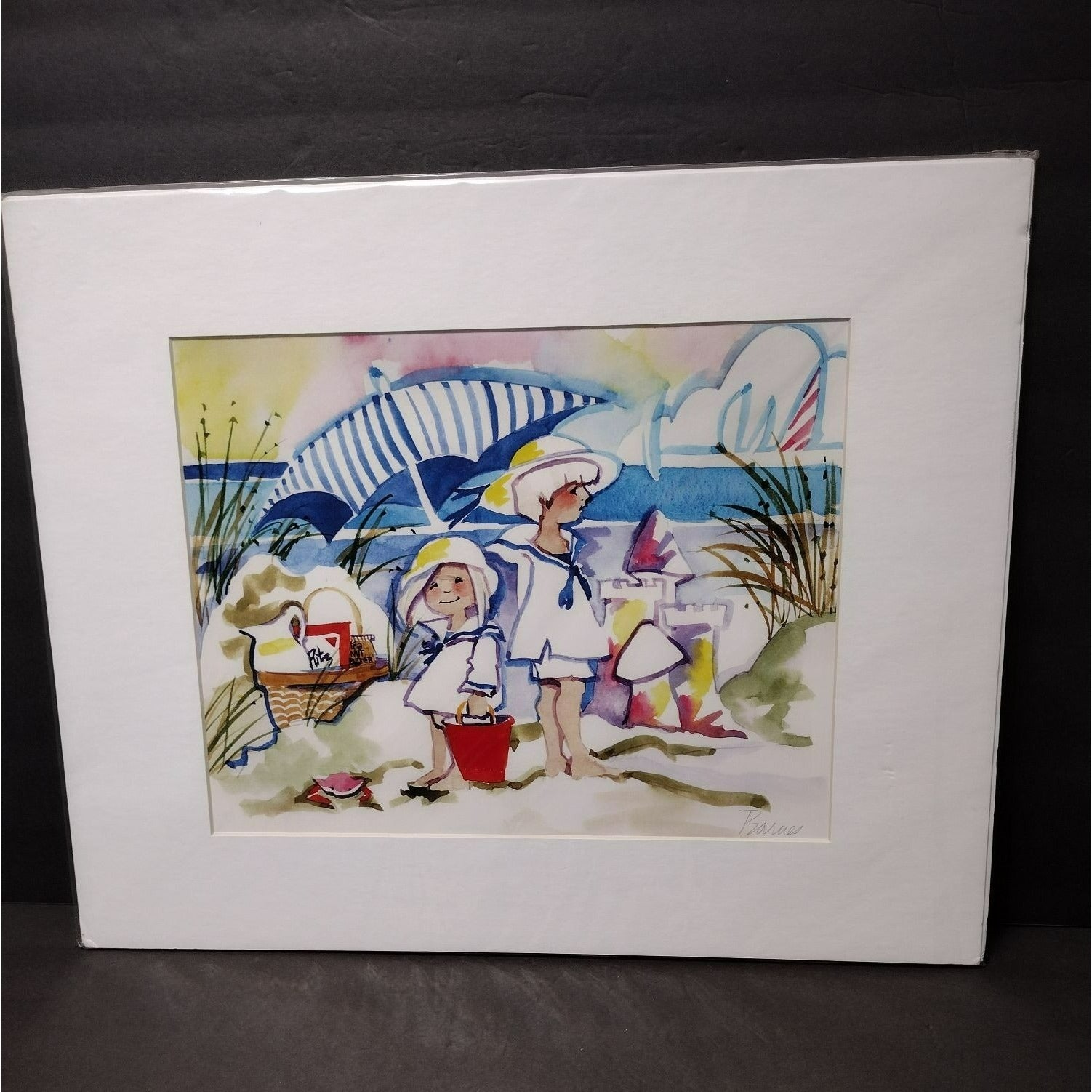 Signed Art Print by Florida artist Diana Barnes -- a matted watercolor artwork showcasing children on a beach, with the artist's pencil signature in the bottom corner. The print features a colorful scene of children on the beach, perfect for adding a vintage, retro touch to your coastal wall decor.
