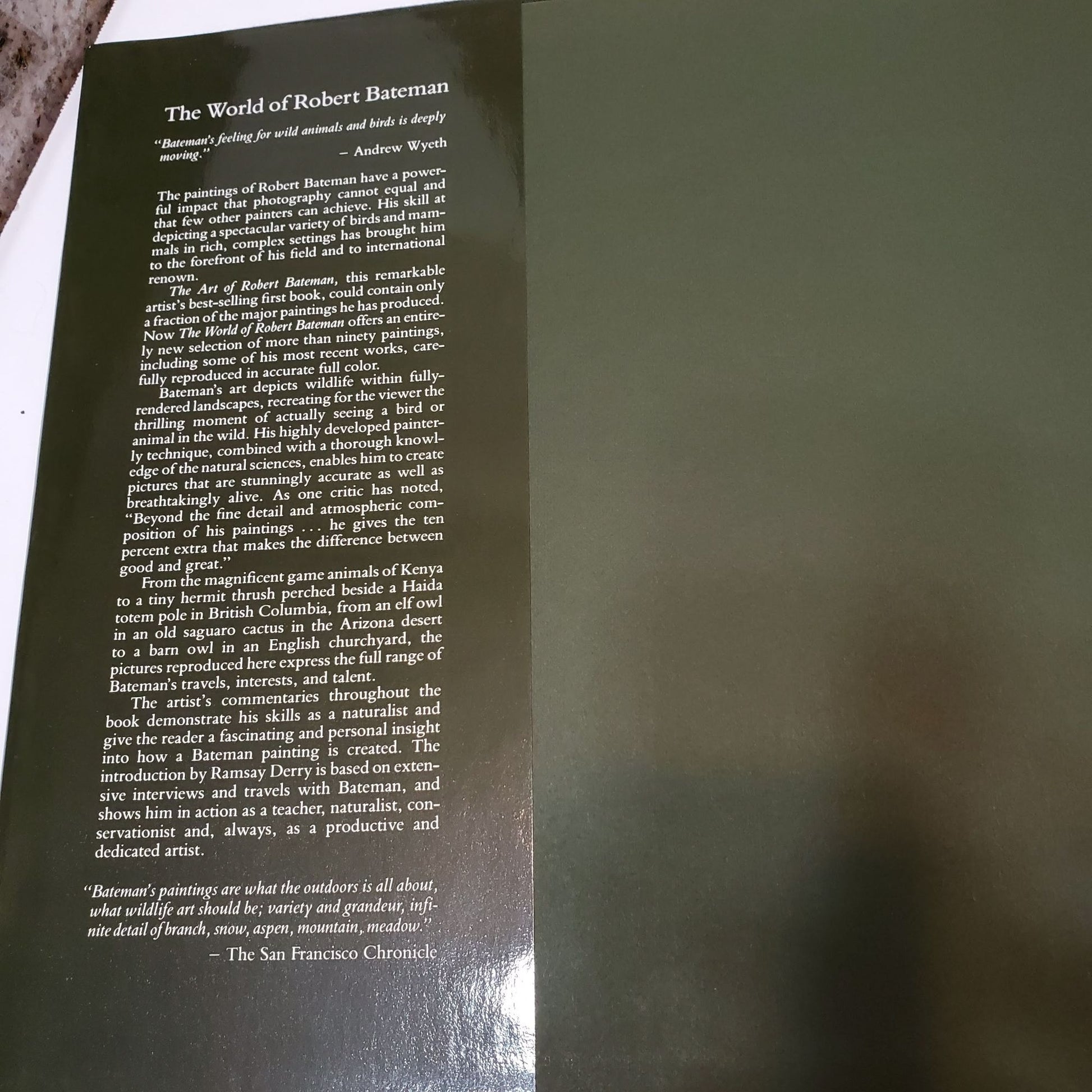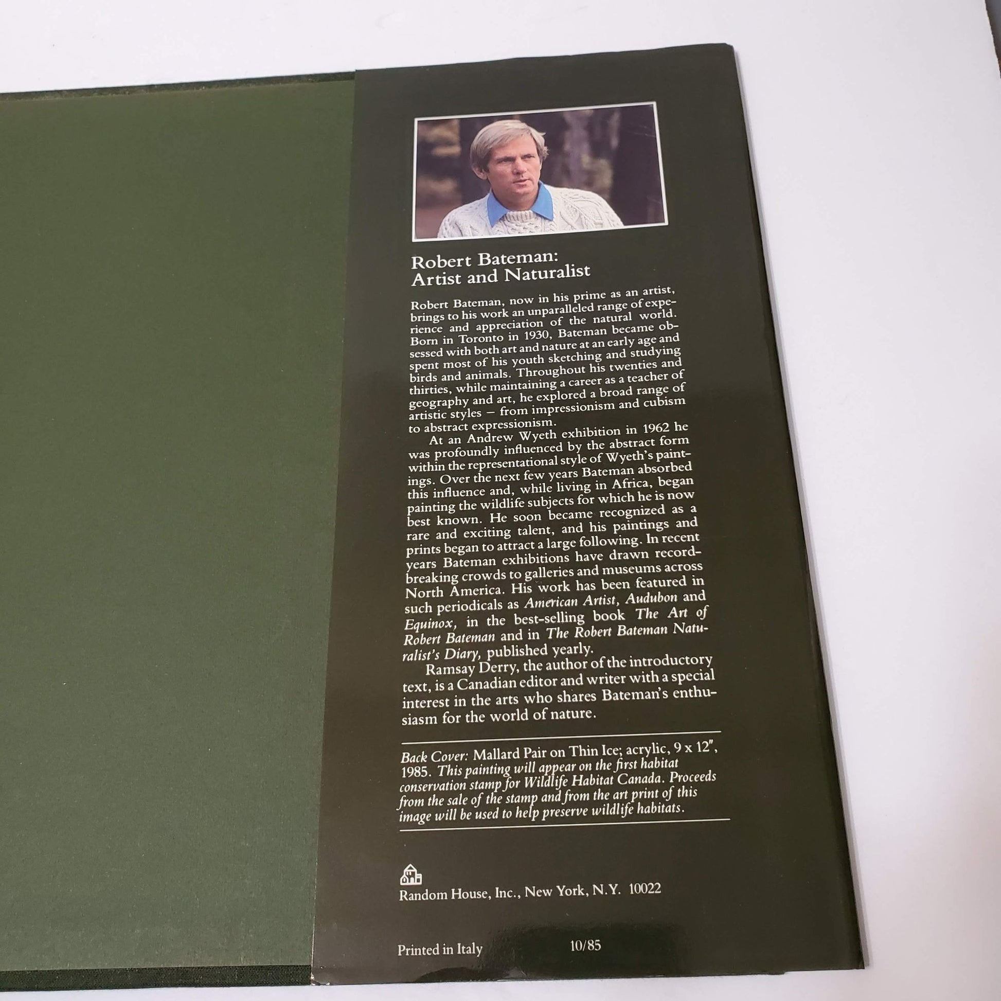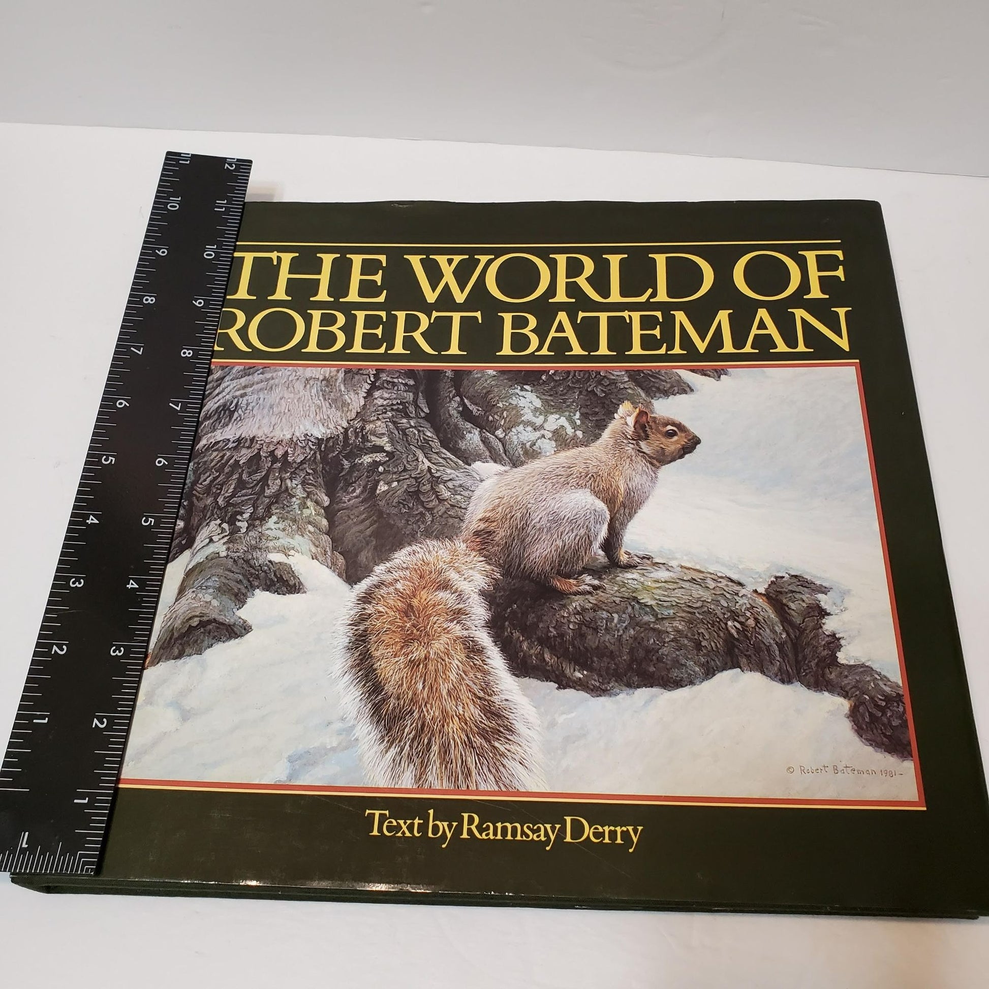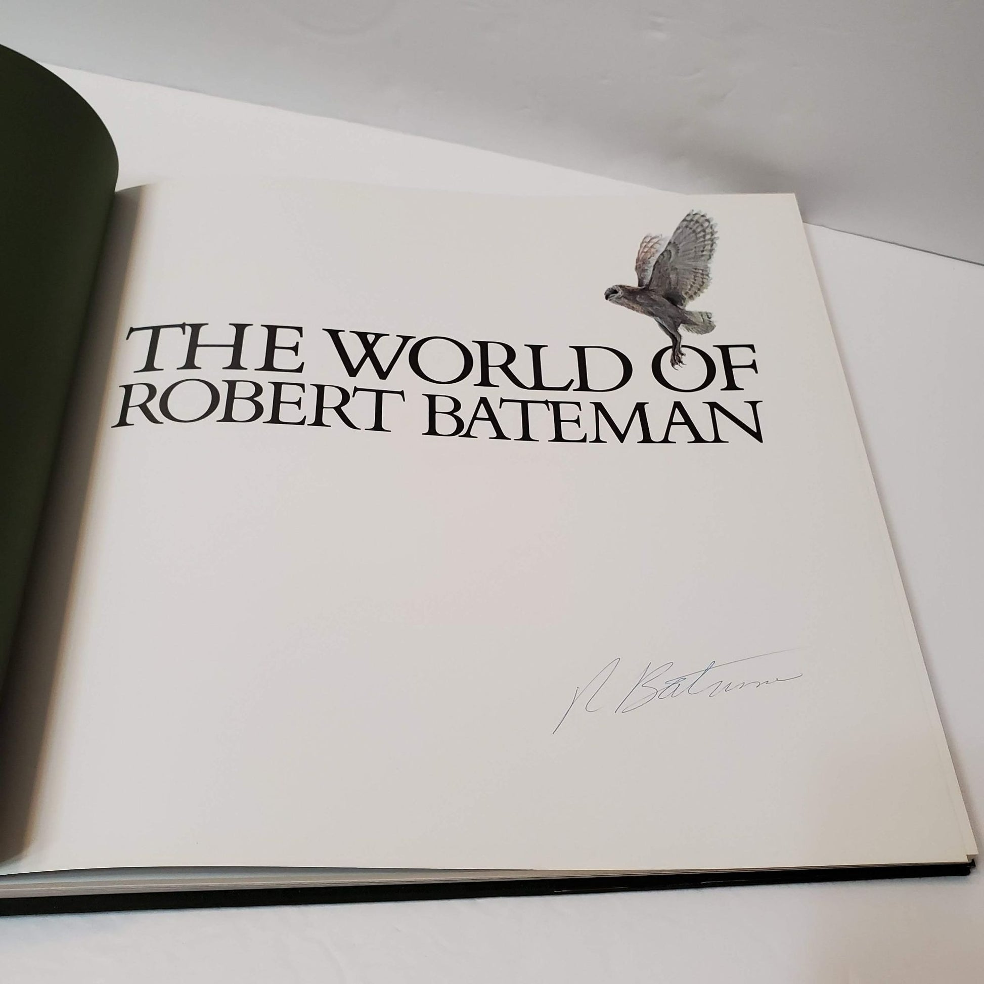 Hardcover Art Book signed by the artist, Robert Bateman, on the halftitle page. It also includes a second dated signature and message by the artist on the following page "Best Wishes, Robert Bateman, Nov 7, '92". The book is: The World of Robert Bateman, Text by Ramsay Derry, 1985. This book measures 11 1/4" x 12" and is 180 pages. The book is in excellent mint condition with no problems. Includes the dust jacket. There are dozens of large color illustrations by Robert Bateman, as well as many smaller, halftone illustrations of varying size. There are no loose pages, torn pages, no writing, etc. All pages are high-quality glossy stock.