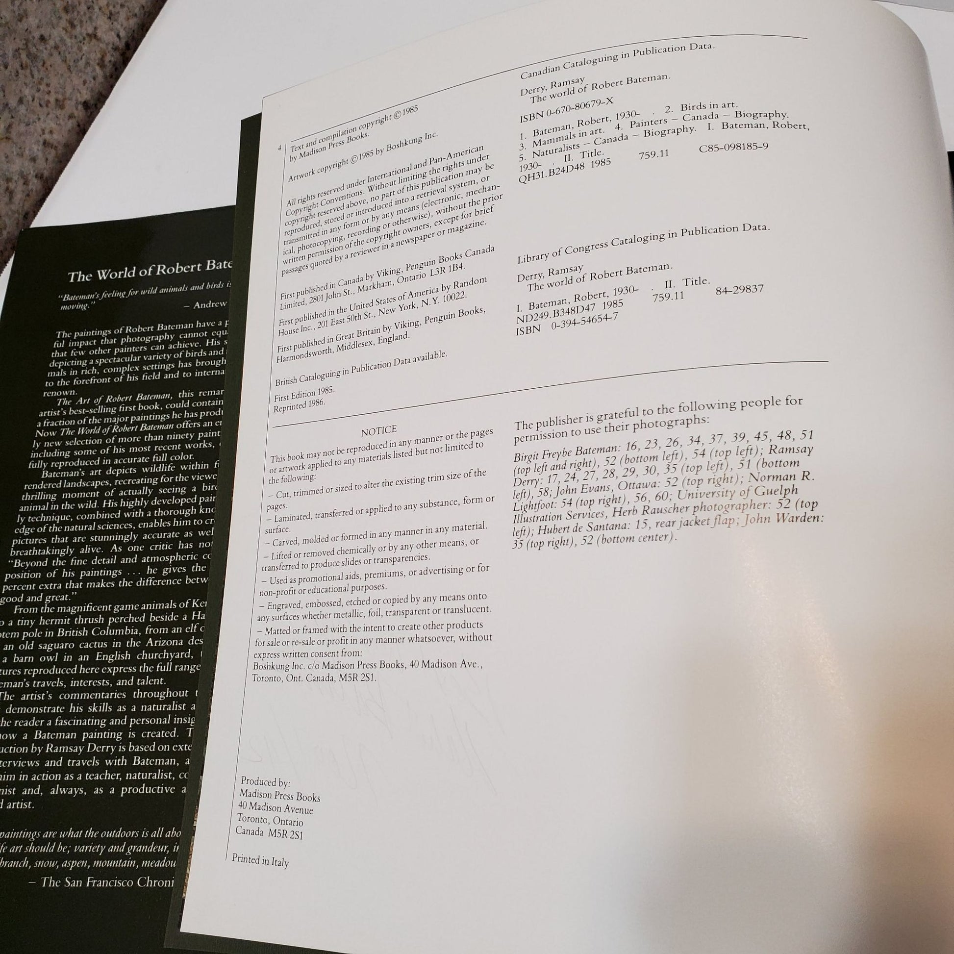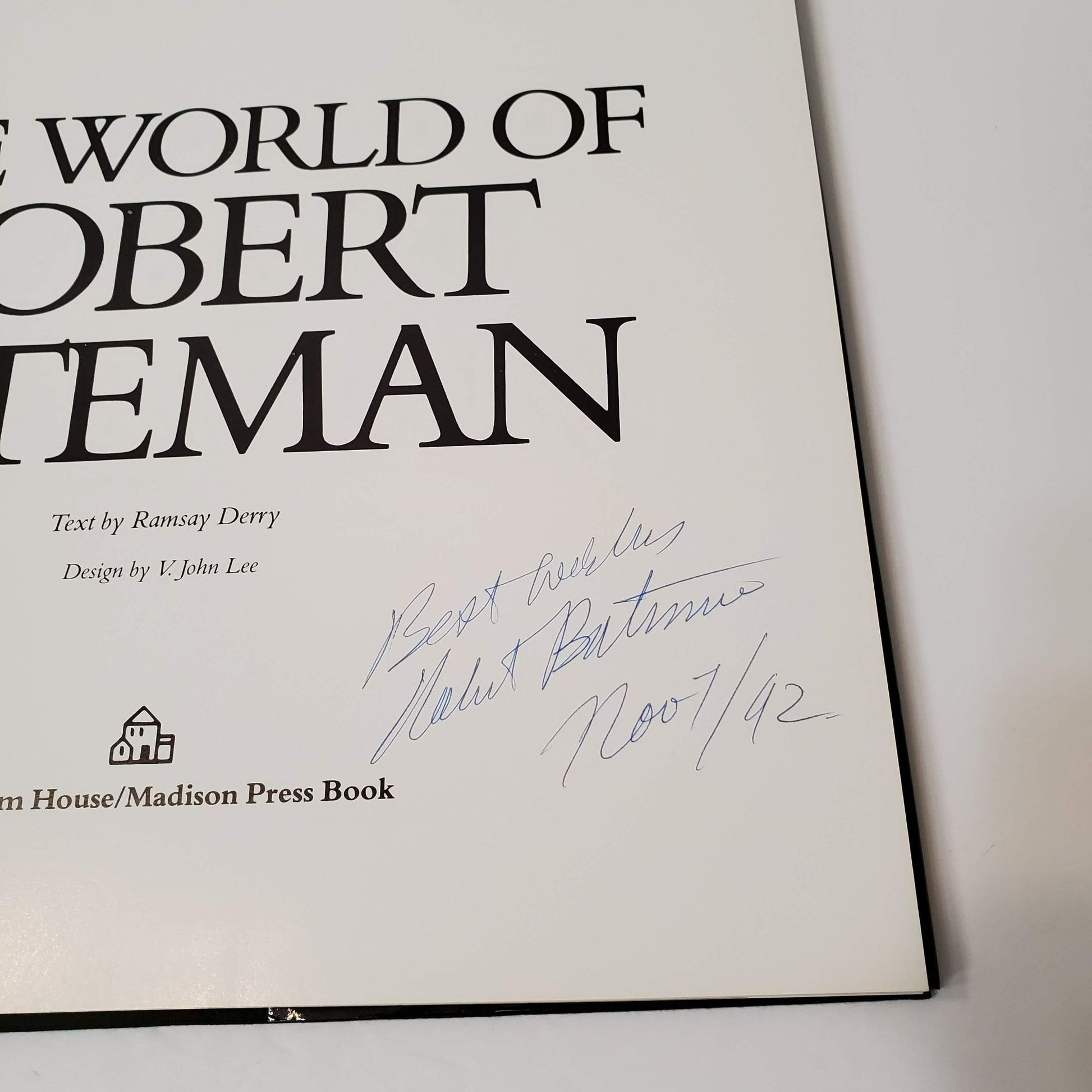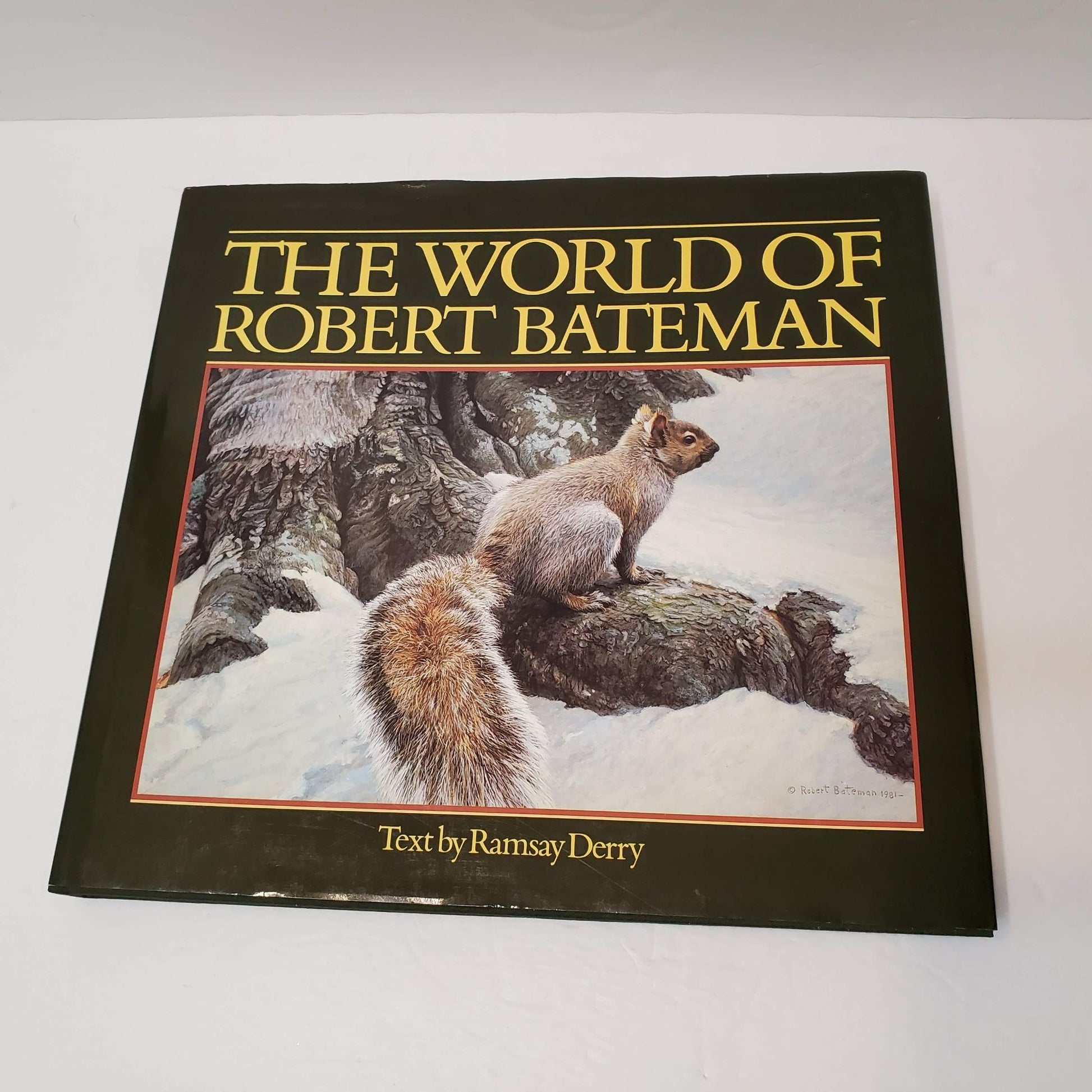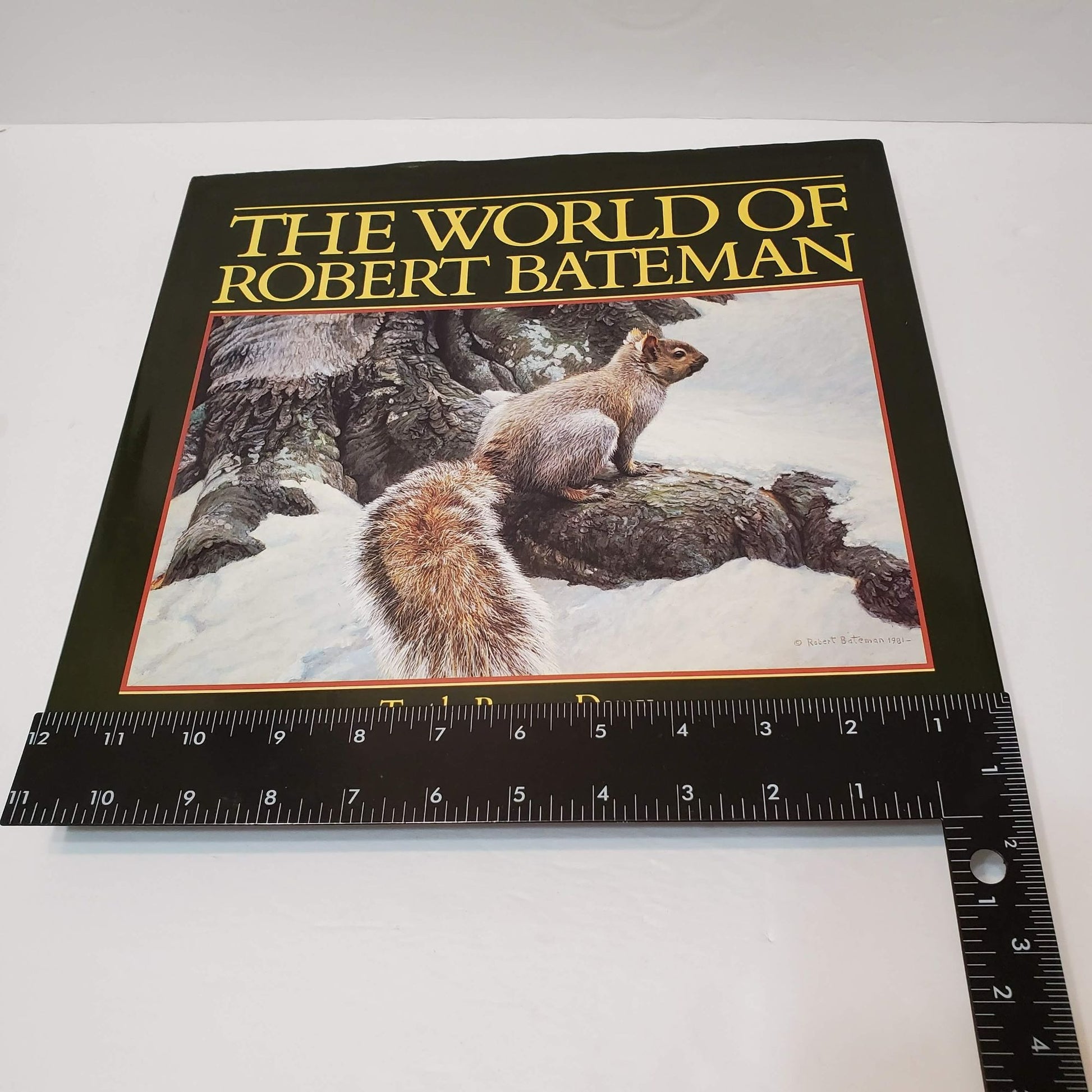 Hardcover Art Book signed by the artist, Robert Bateman, on the halftitle page. It also includes a second dated signature and message by the artist on the following page "Best Wishes, Robert Bateman, Nov 7, '92". The book is: The World of Robert Bateman, Text by Ramsay Derry, 1985. This book measures 11 1/4" x 12" and is 180 pages. The book is in excellent mint condition with no problems. Includes the dust jacket. There are dozens of large color illustrations by Robert Bateman, as well as many smaller, halftone illustrations of varying size. There are no loose pages, torn pages, no writing, etc. All pages are high-quality glossy stock.