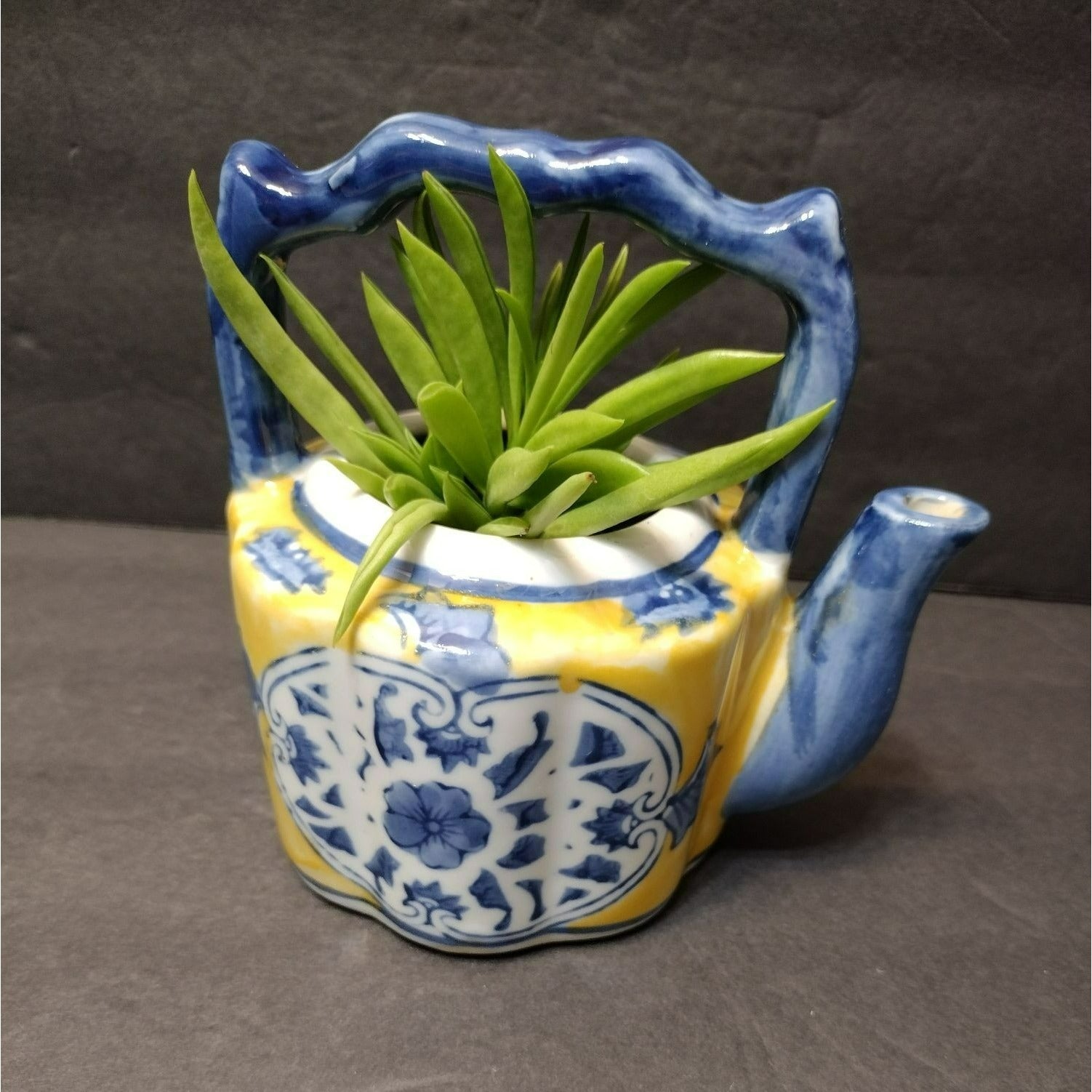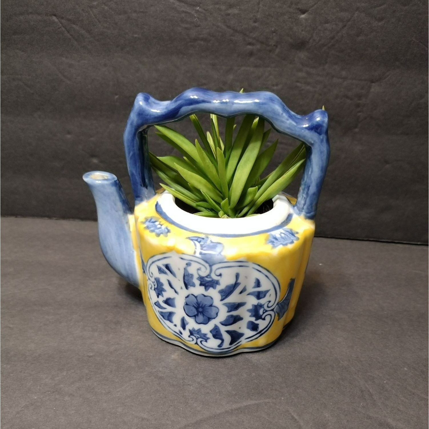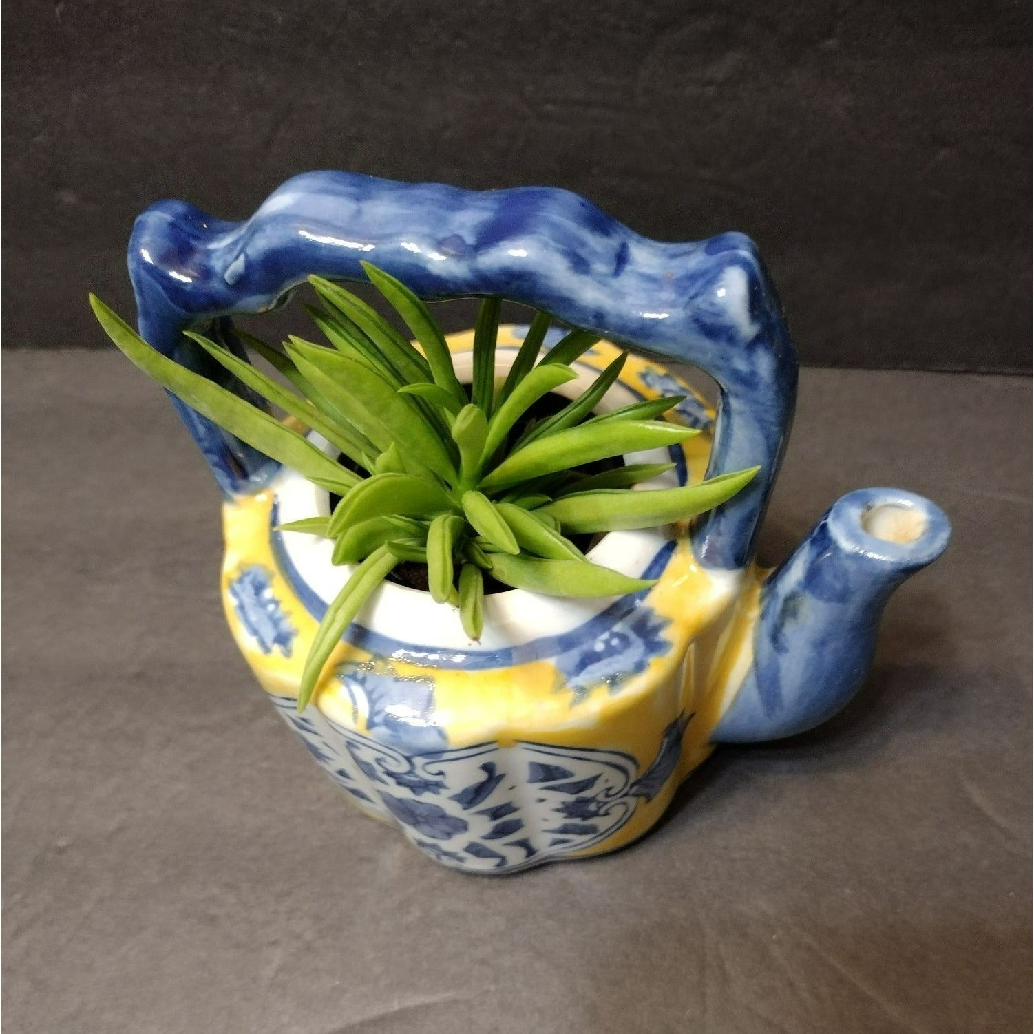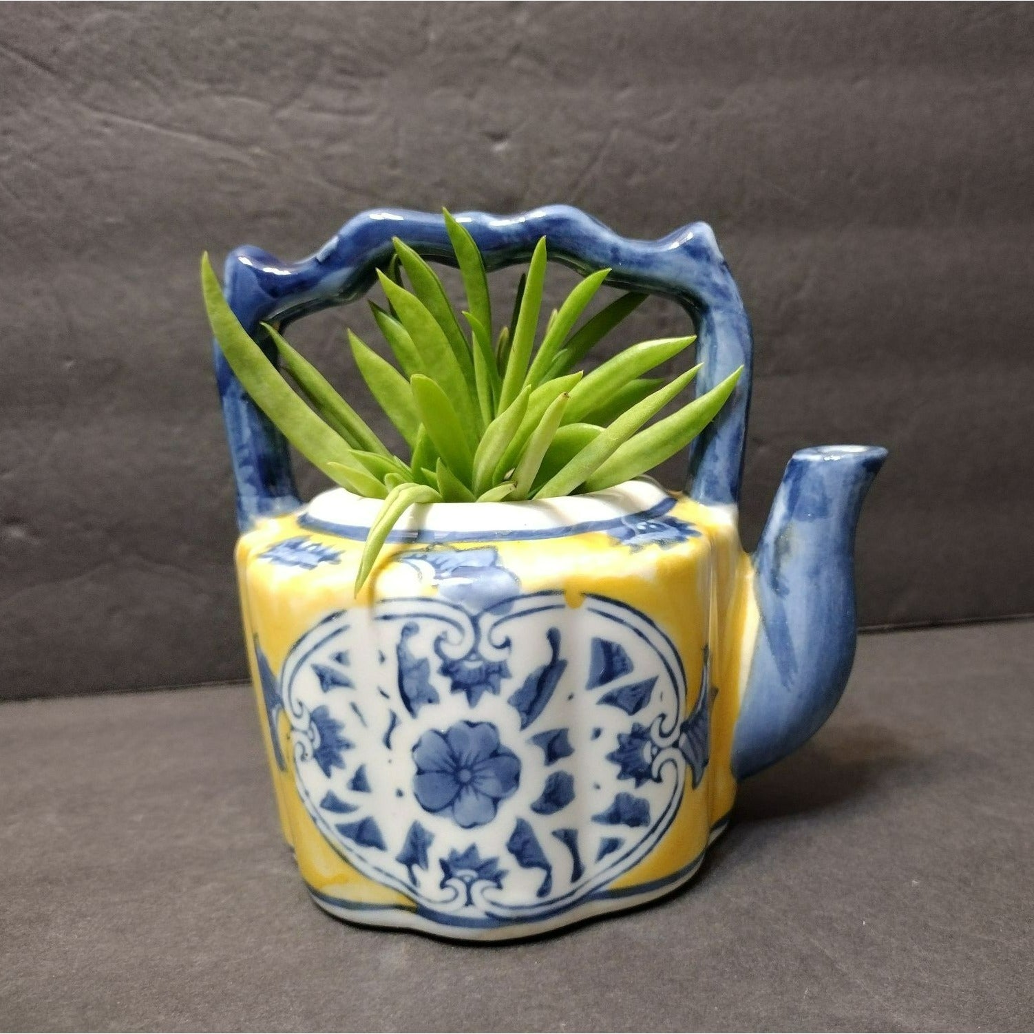 This Vintage Asian Succulent Planter is a charming miniature teapot crafted from ceramic. It sports a vibrant yellow and blue color scheme, perfect for adding an eclectic touch to your space. Makes a unique succulent planter, and an unusual gift for a tea lover or succulent / gardening lover.