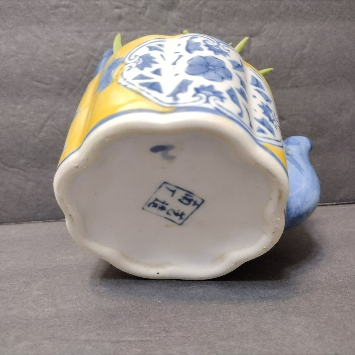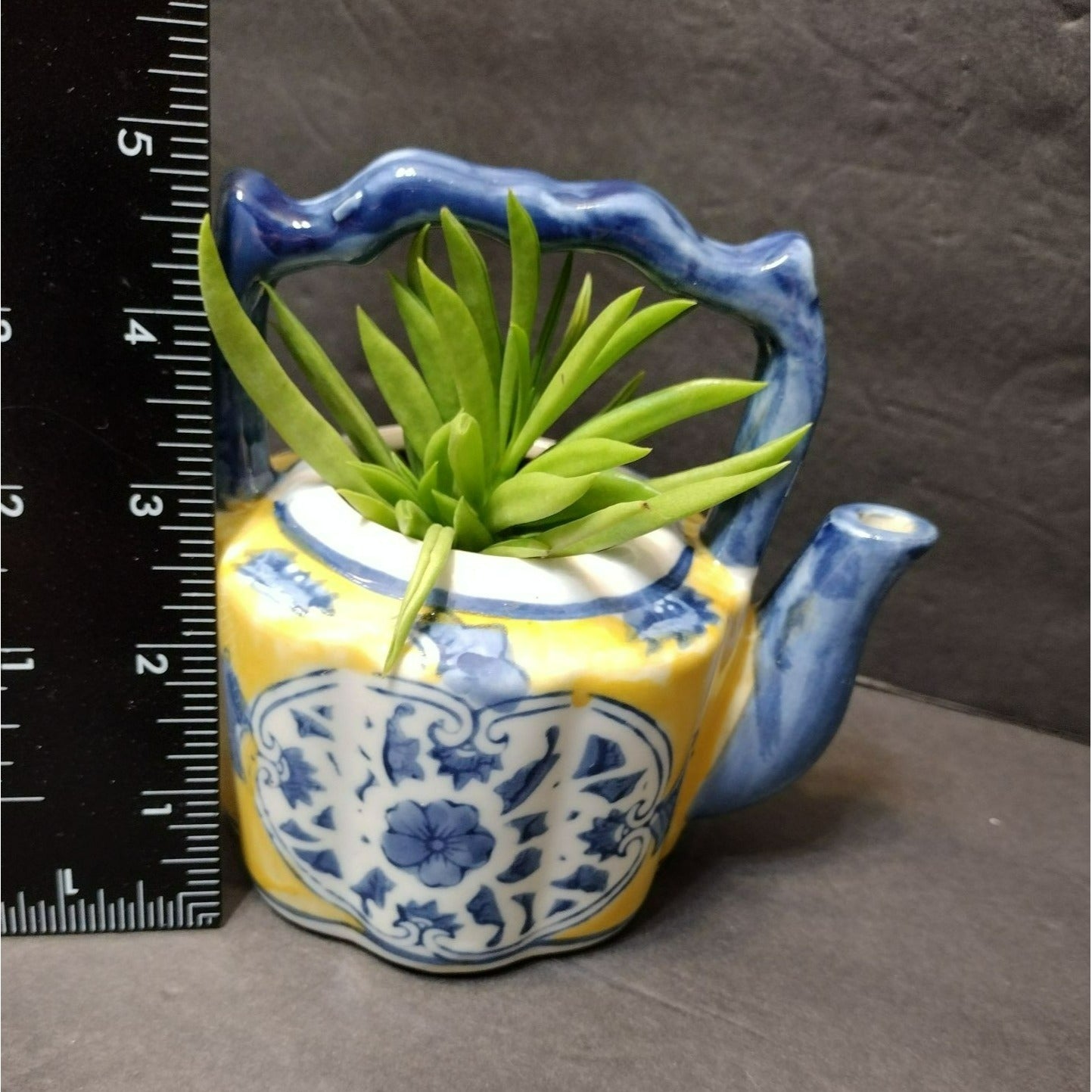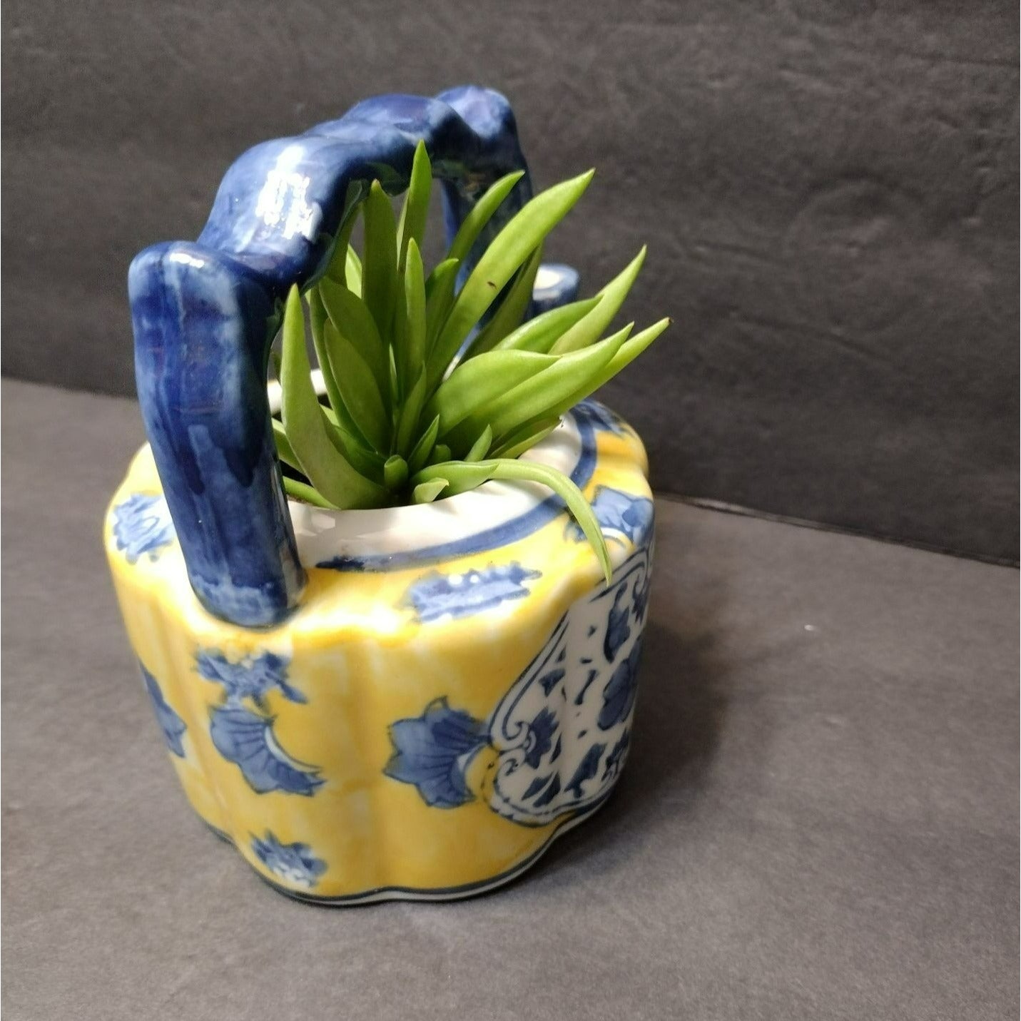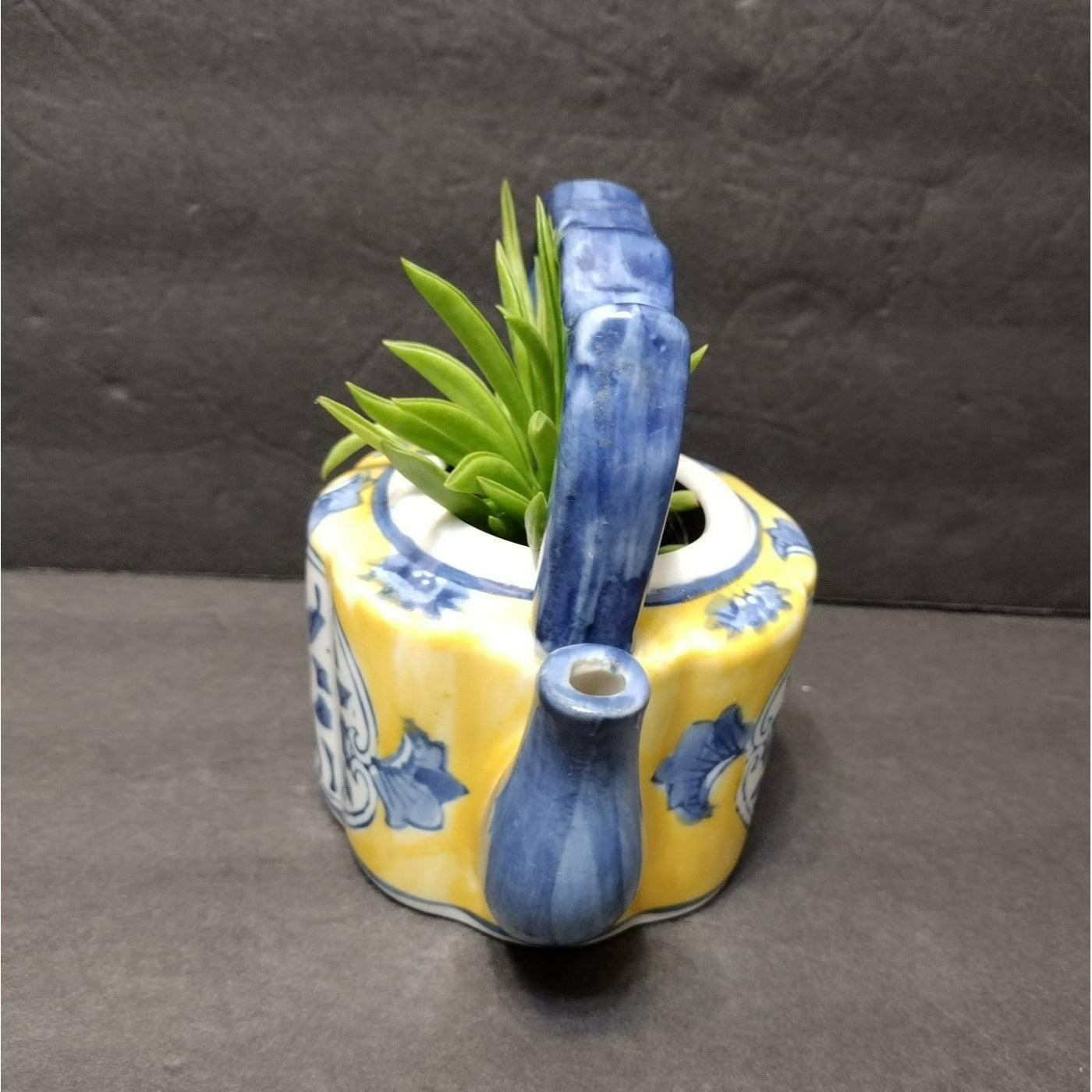 This Vintage Asian Succulent Planter is a charming miniature teapot crafted from ceramic. It sports a vibrant yellow and blue color scheme, perfect for adding an eclectic touch to your space. Makes a unique succulent planter, and an unusual gift for a tea lover or succulent / gardening lover.
