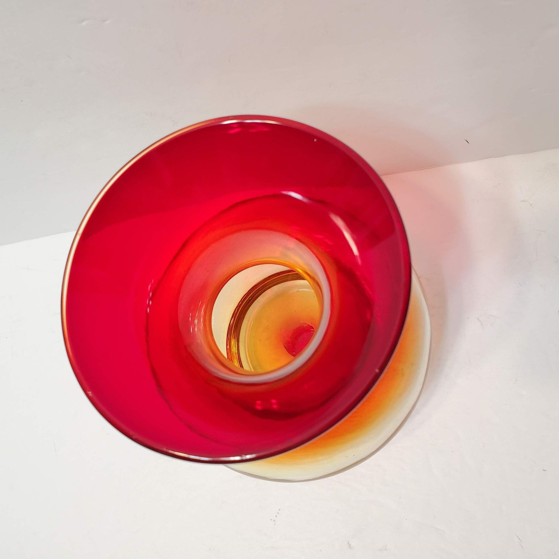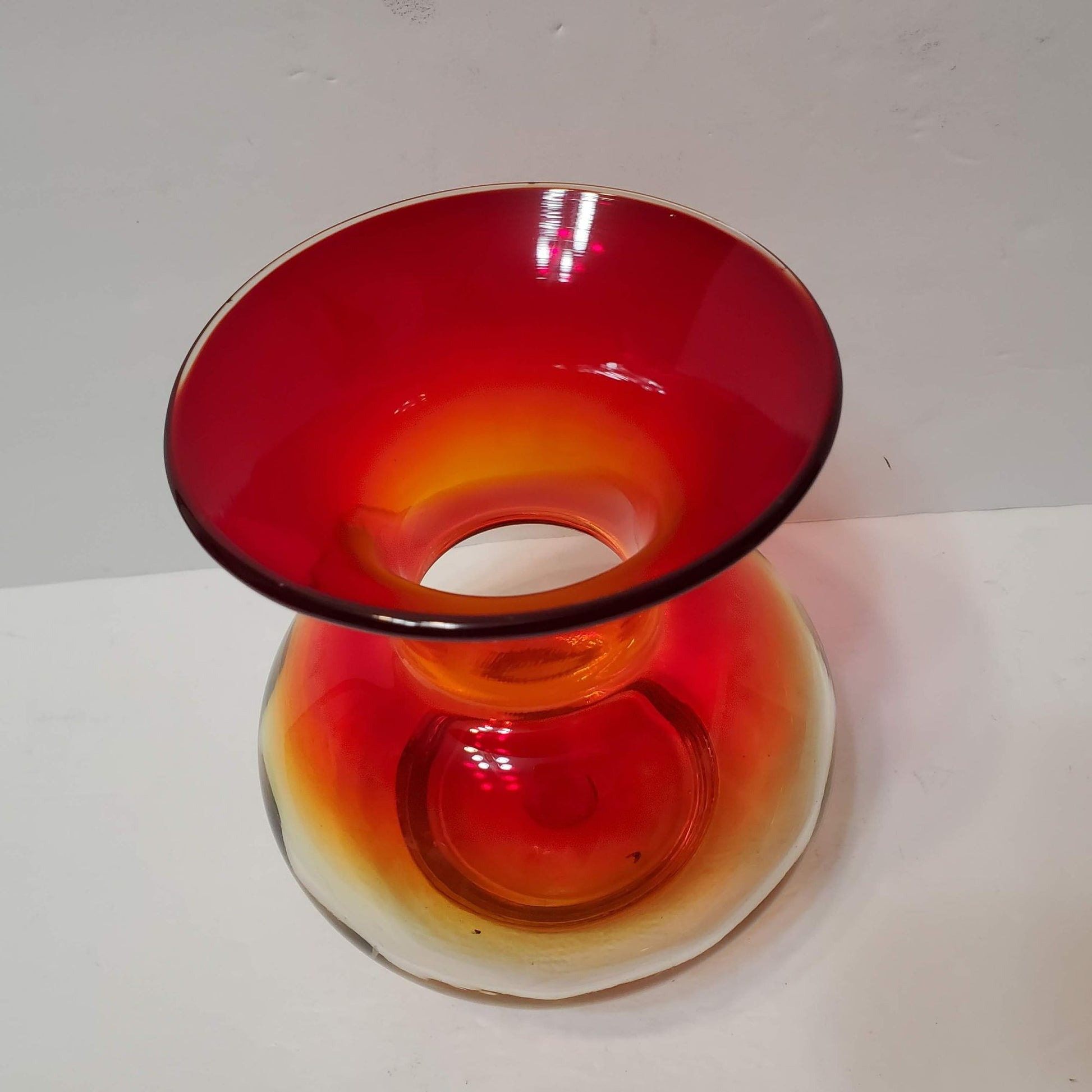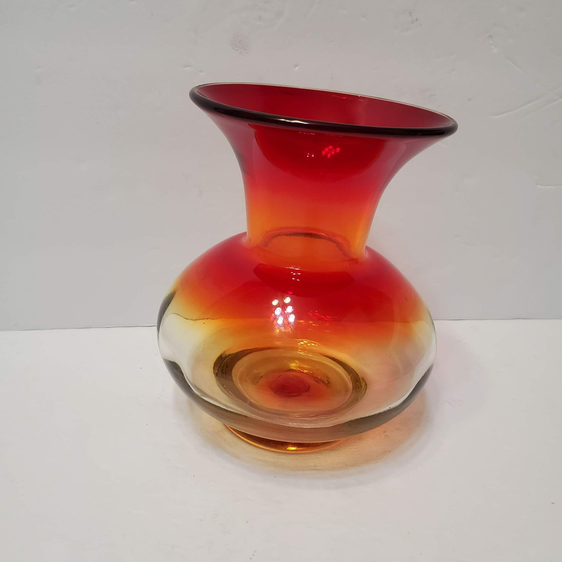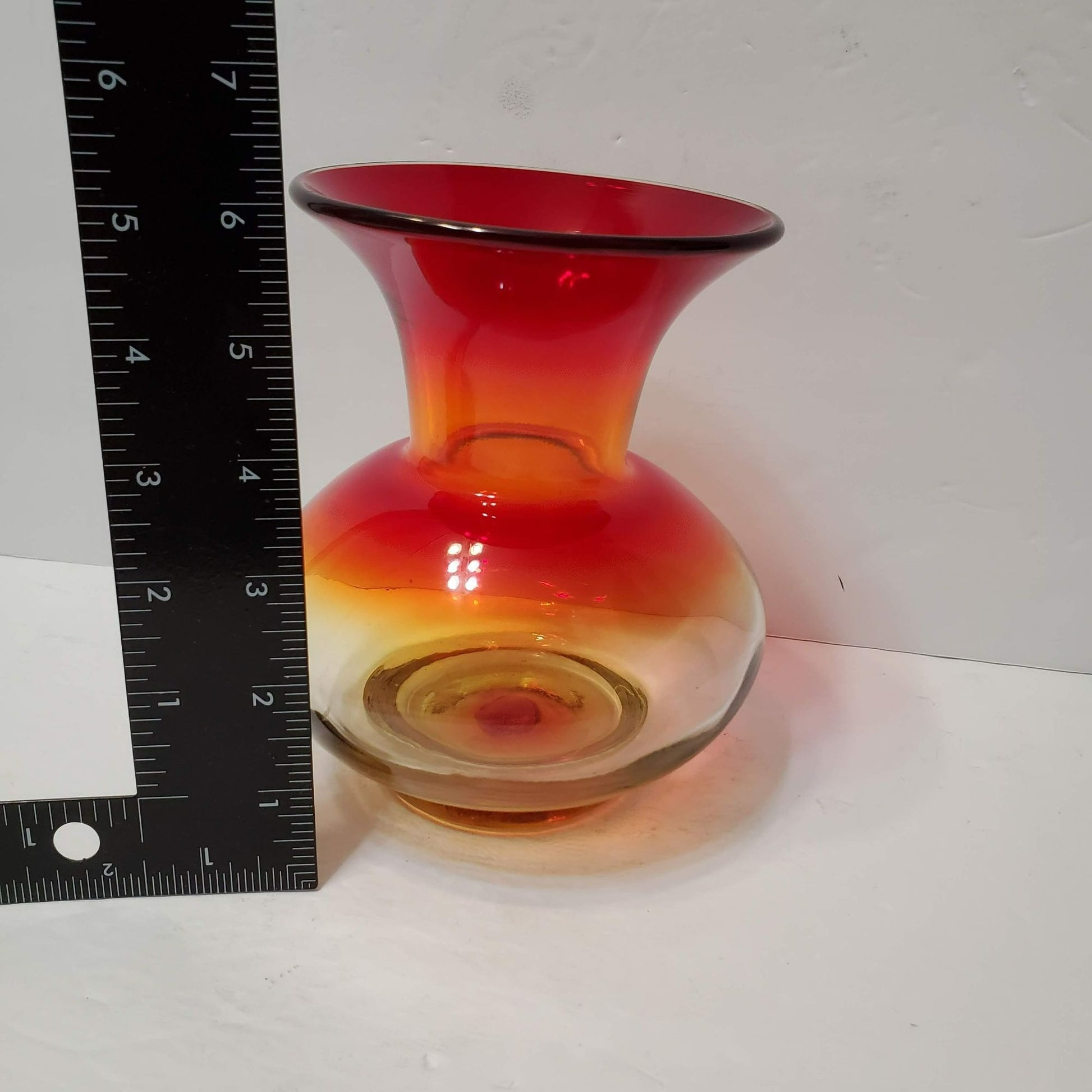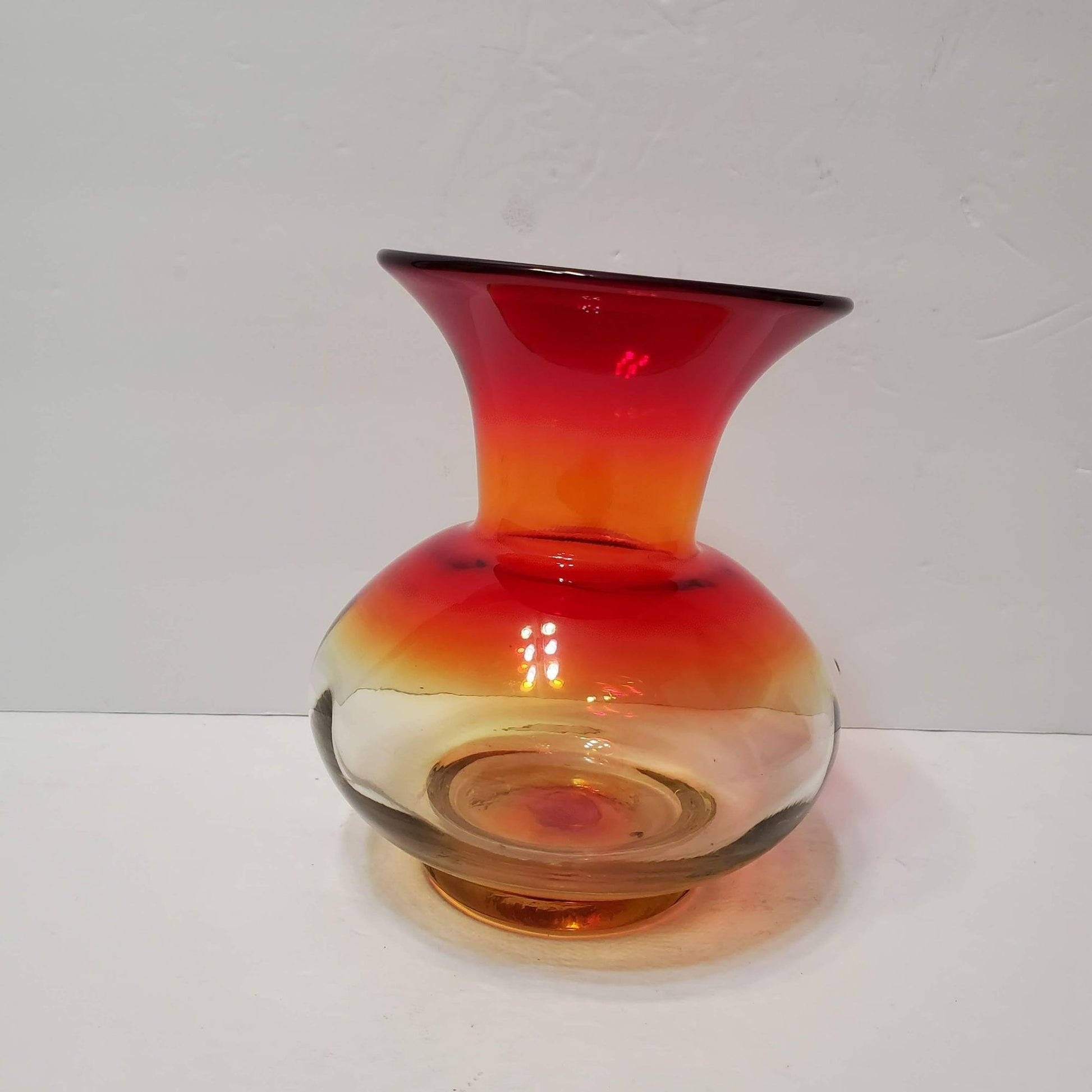 This Vintage Blenko Art Glass Hand Blown Amberina Vase is a stunning piece of mid-century modern art. At 6" tall, the bulbous orange and yellow vase adds a unique touch to any space.