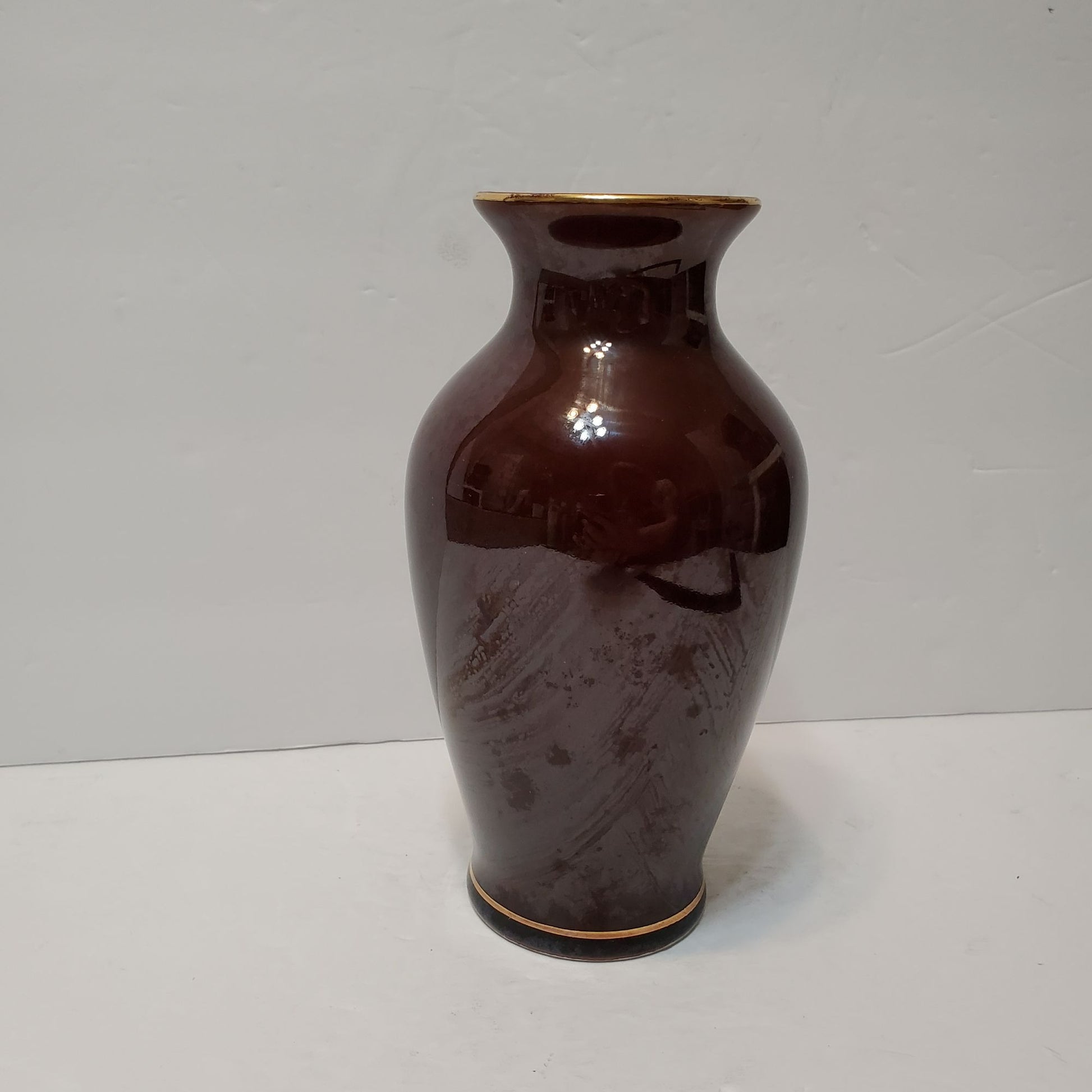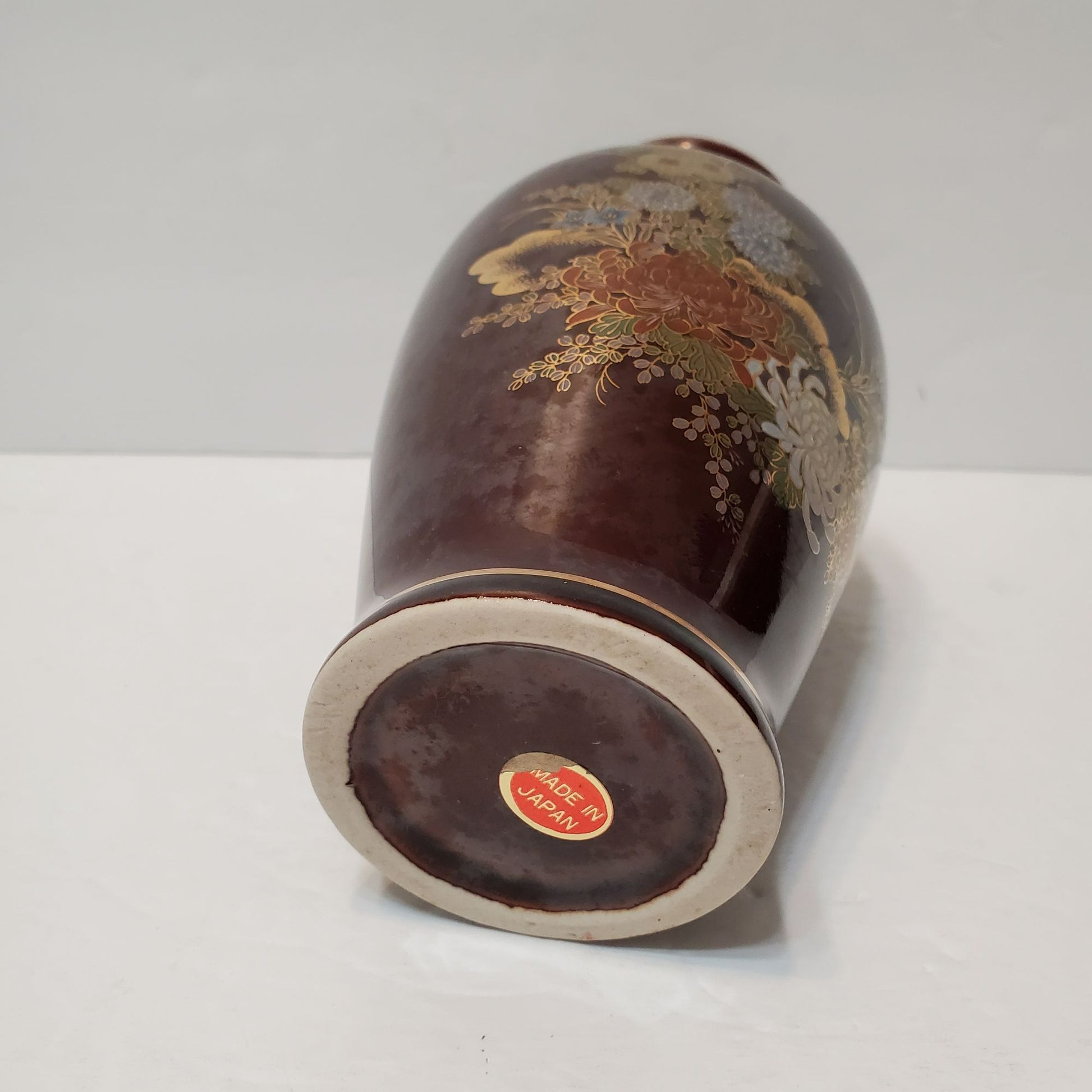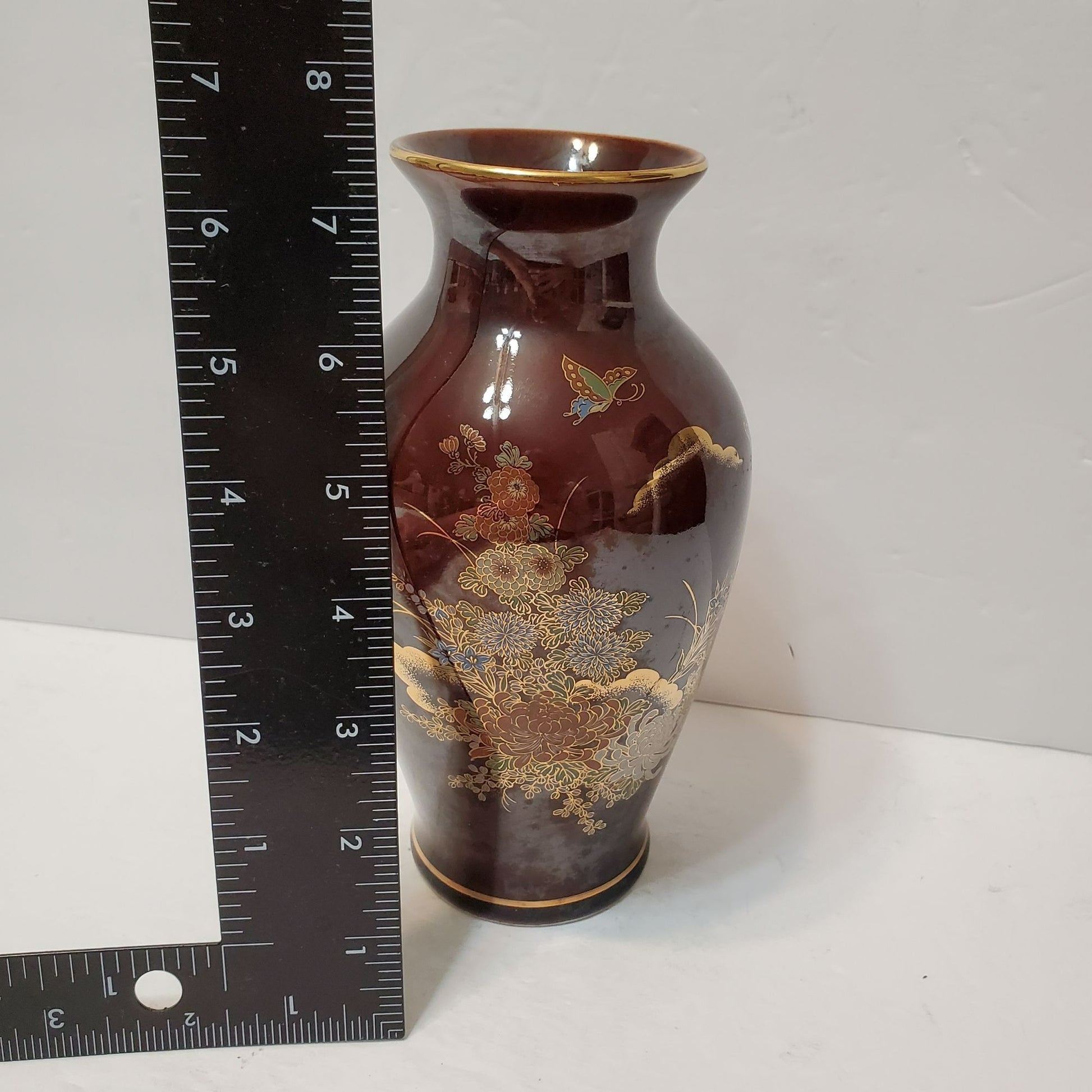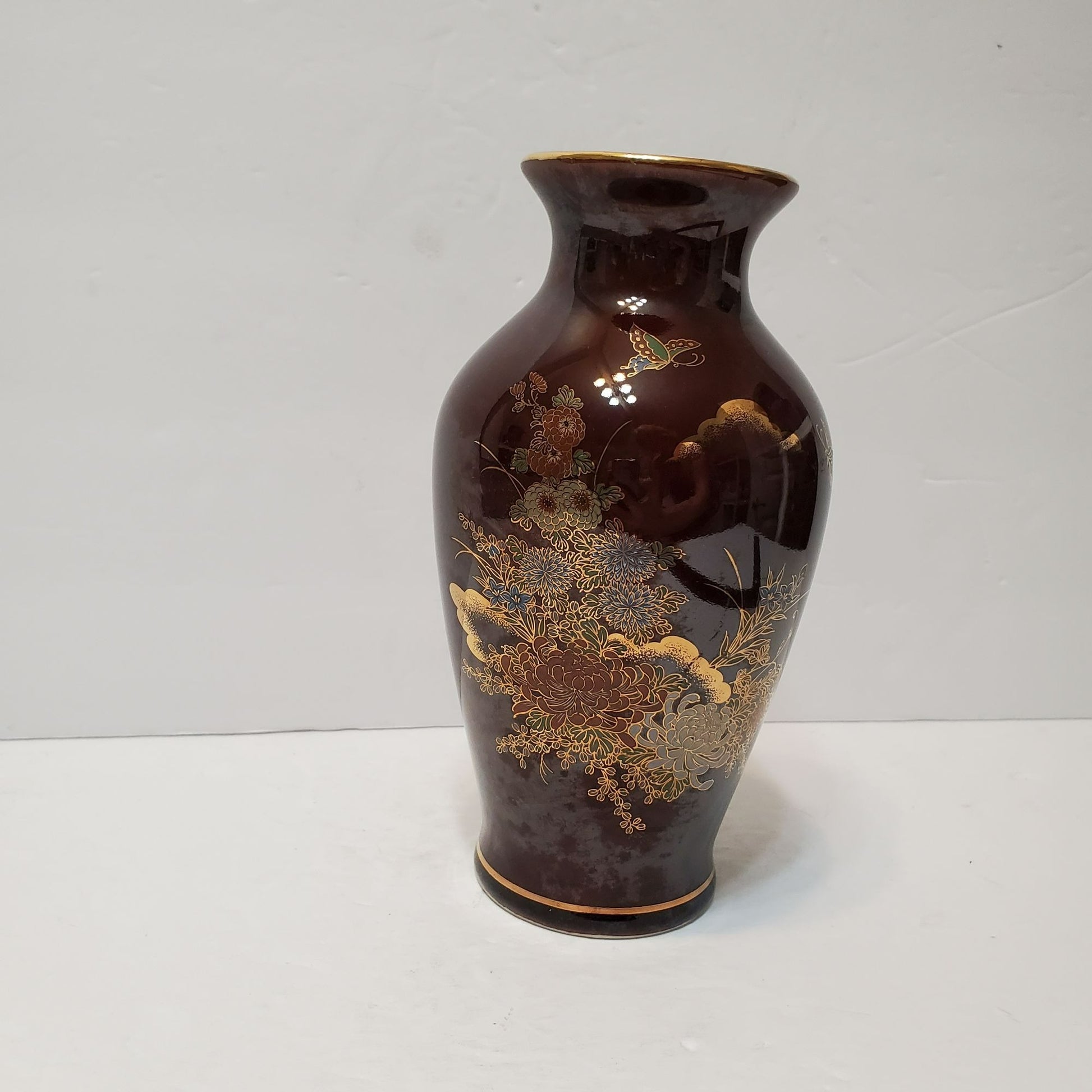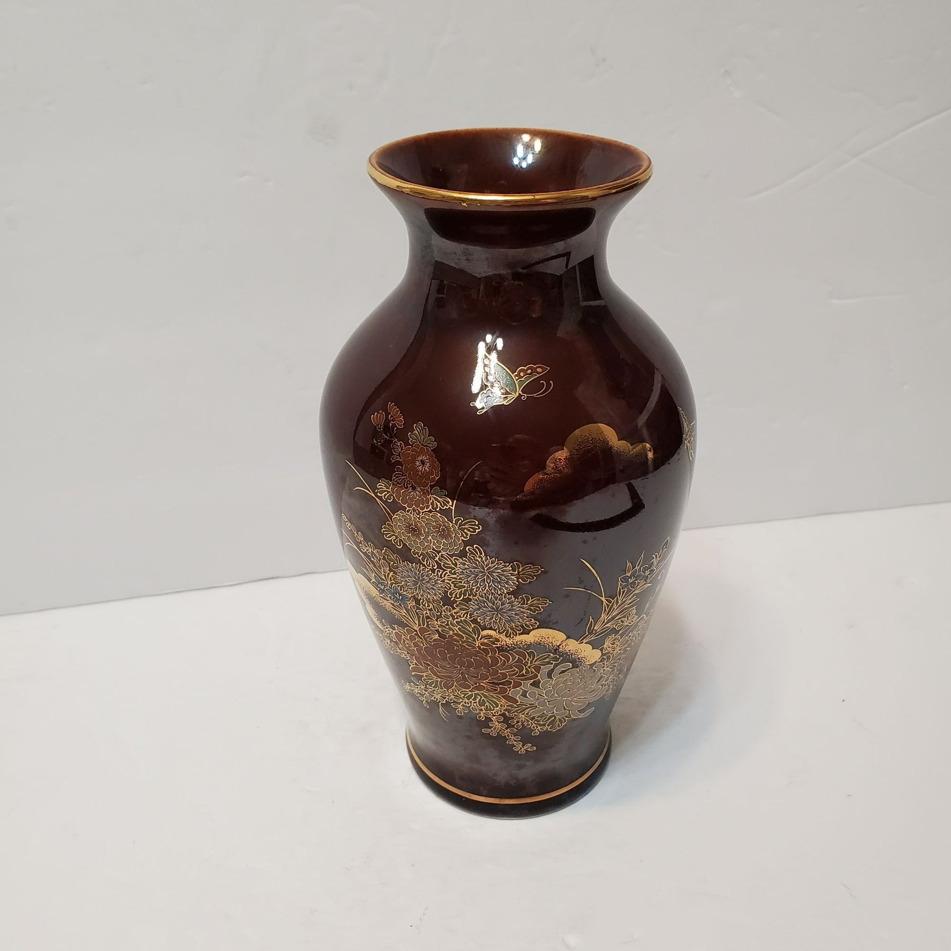 Vintage Brown Asian Japanese Vase, Gold Leaf Flowers Butterflies Chinoiserie Japan Garden 8"