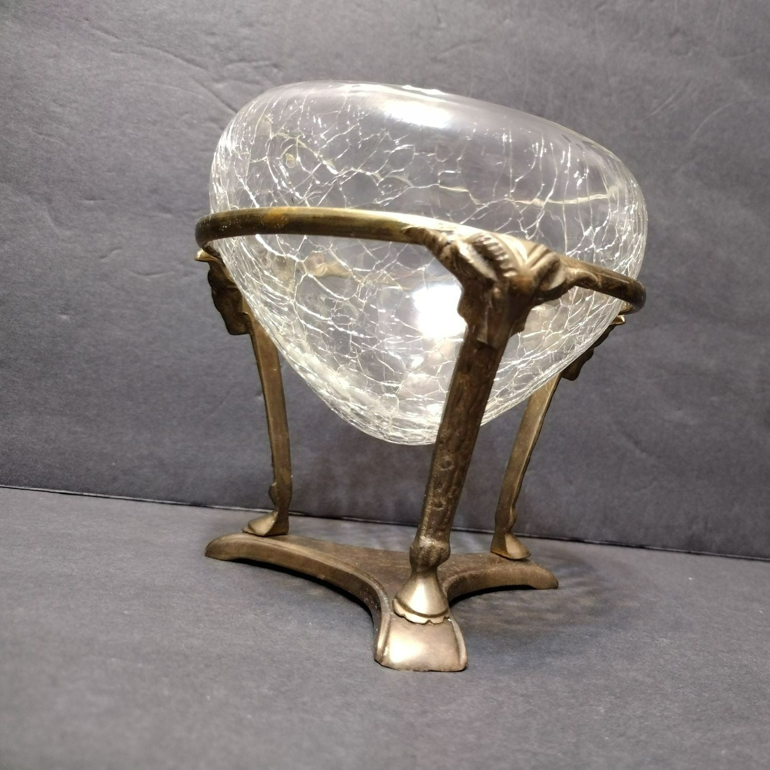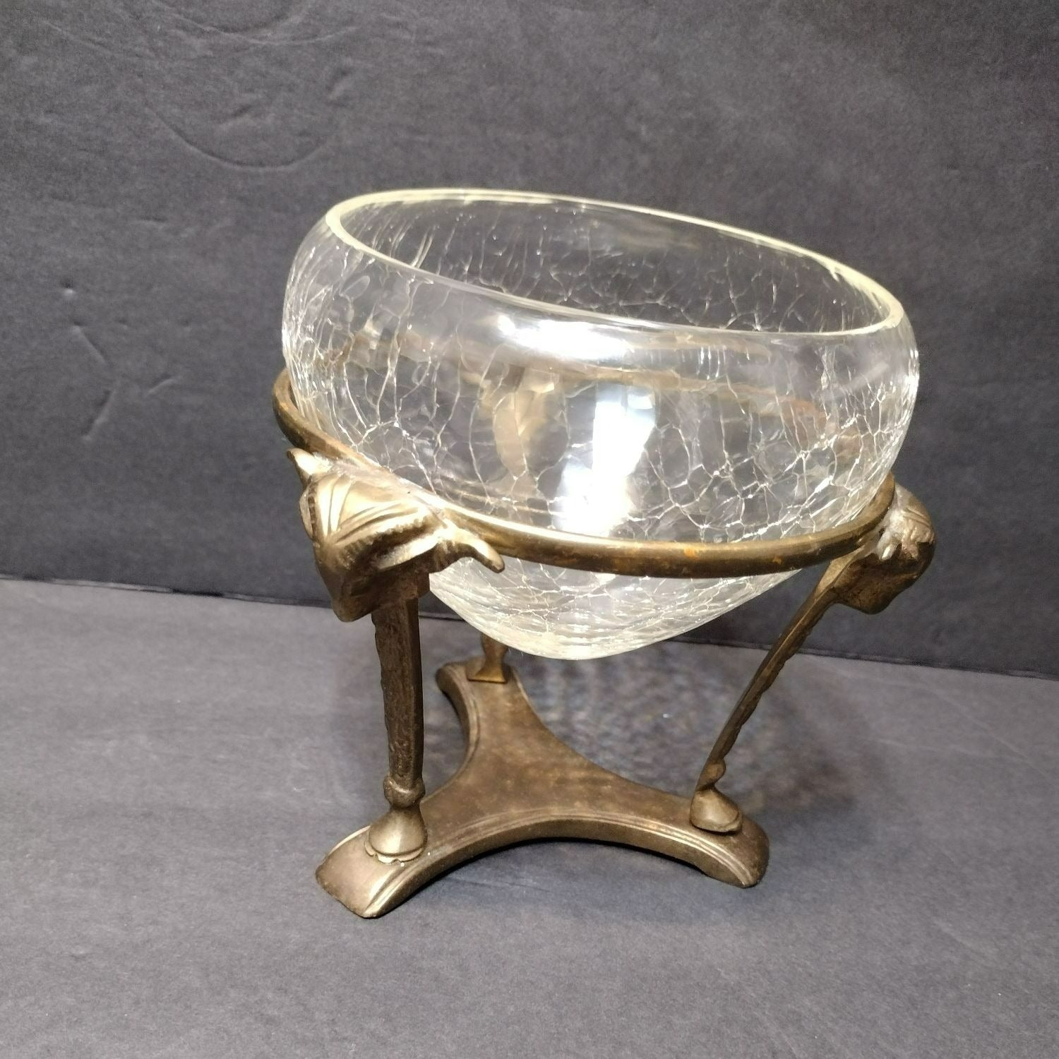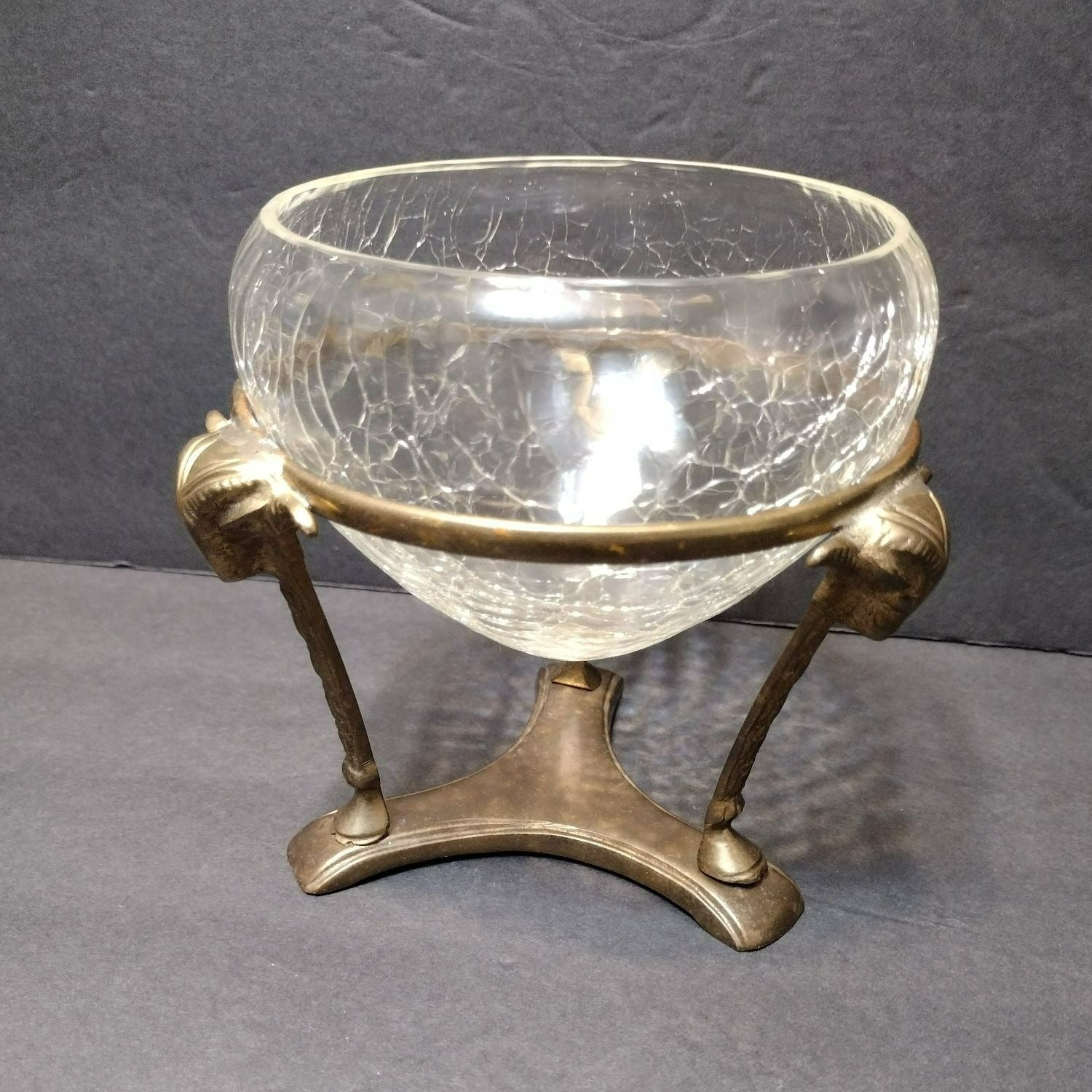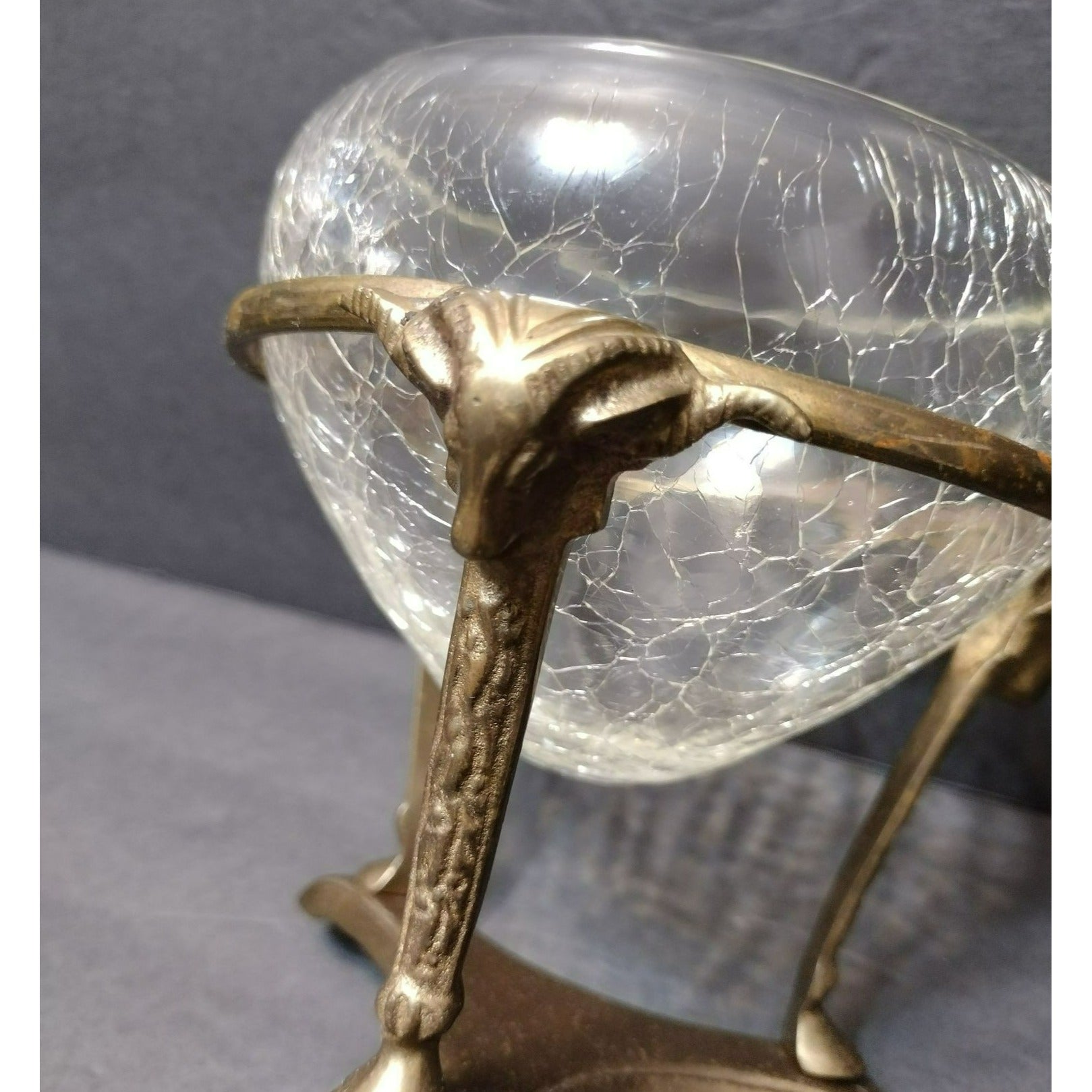 Vintage Crackle Glass Bowl in Ornate Brass Stand, Vase Gold Rams' Head Pedestal