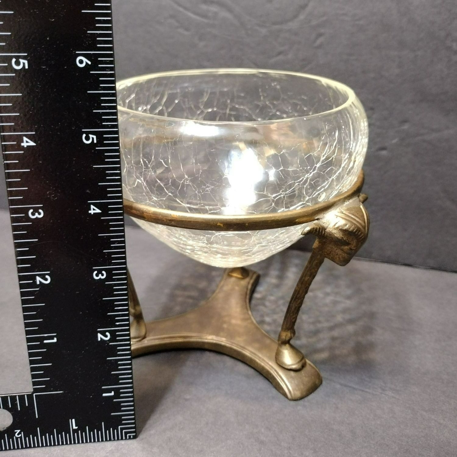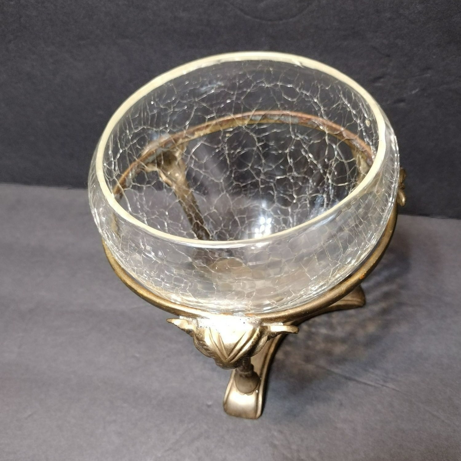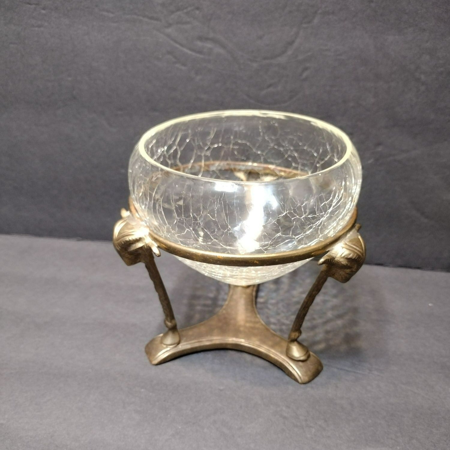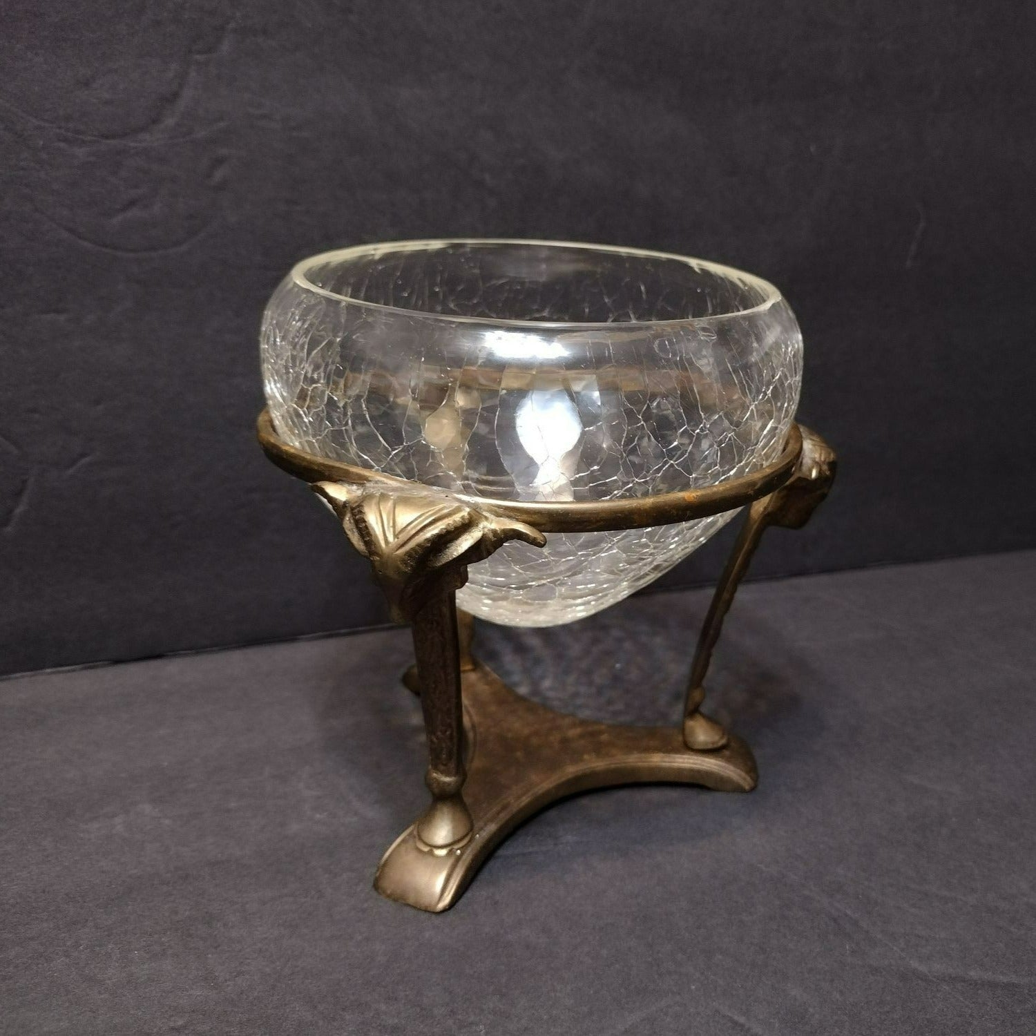 Vintage Crackle Glass Bowl in Ornate Brass Stand, Vase Gold Rams' Head Pedestal