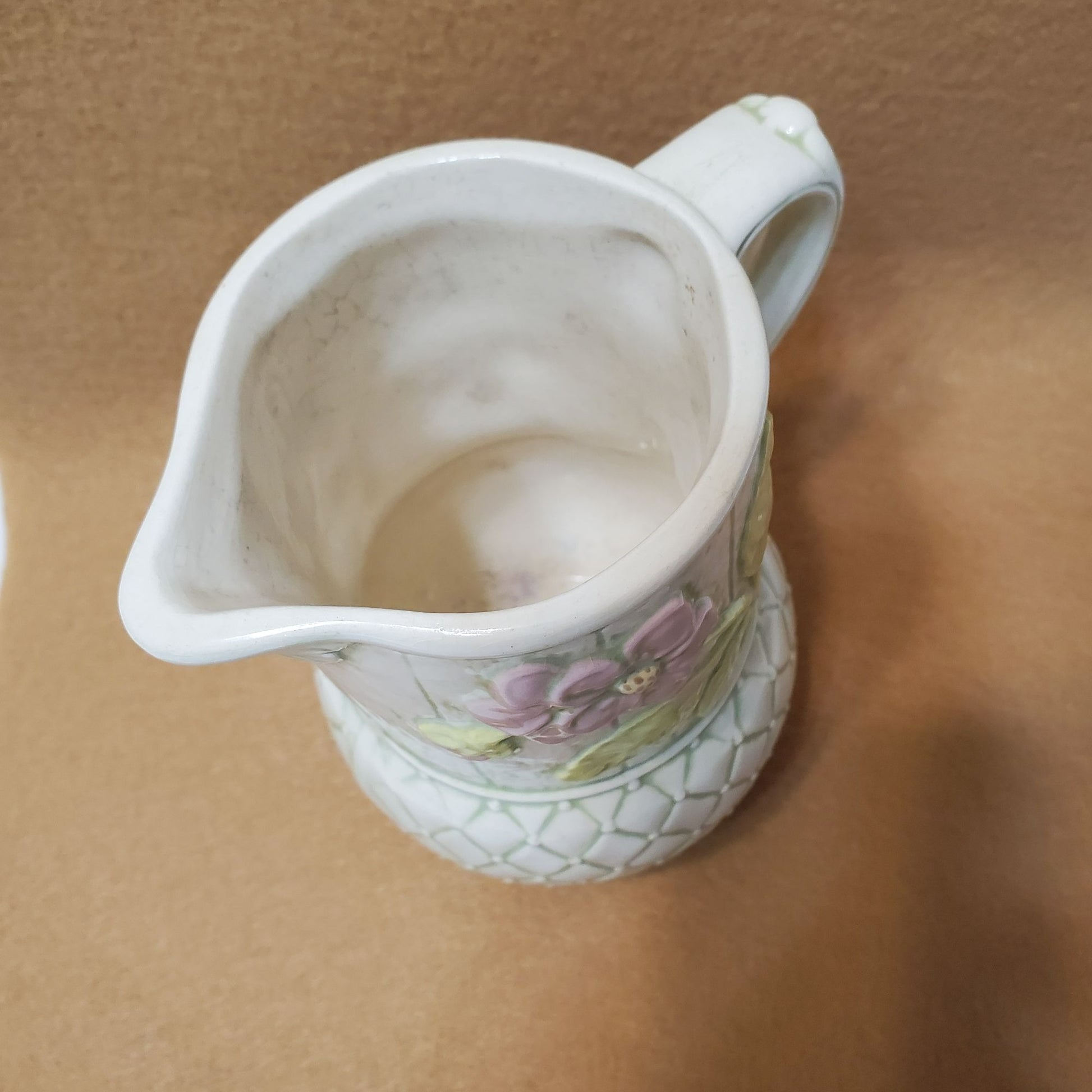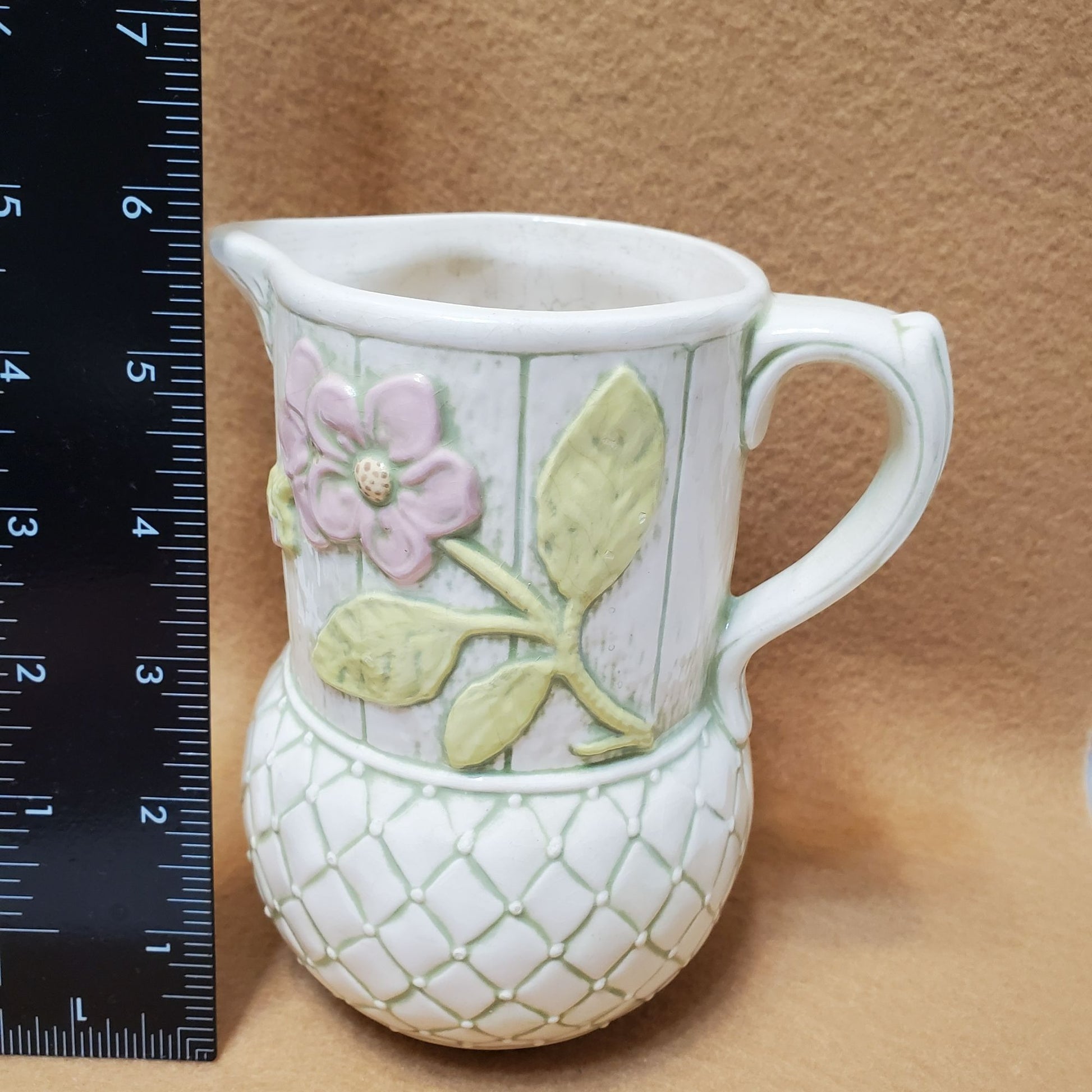 Vintage Majolica Pitcher Ceramic Hand Painted Floral Pink Flower Signed Basketweave Base