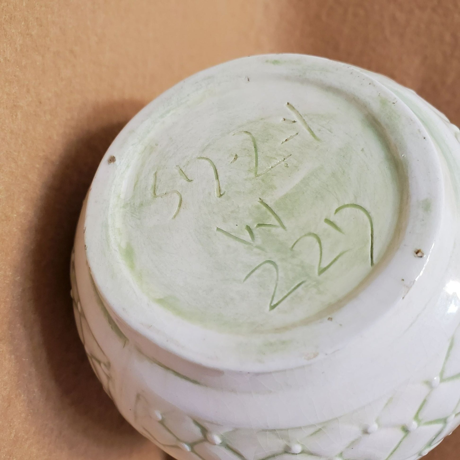 This vintage Majolica pitcher is a one-of-a-kind ceramic treasure, signed and dated on the base (I believe it says 1957). This design dates to the 19th century. Hand-painted floral designs in pink and green leaves adorn its white surface, while a basketweave design base adds a touch of rustic charm. It's a signed piece that beautifully showcases the classic Majolica pottery style.