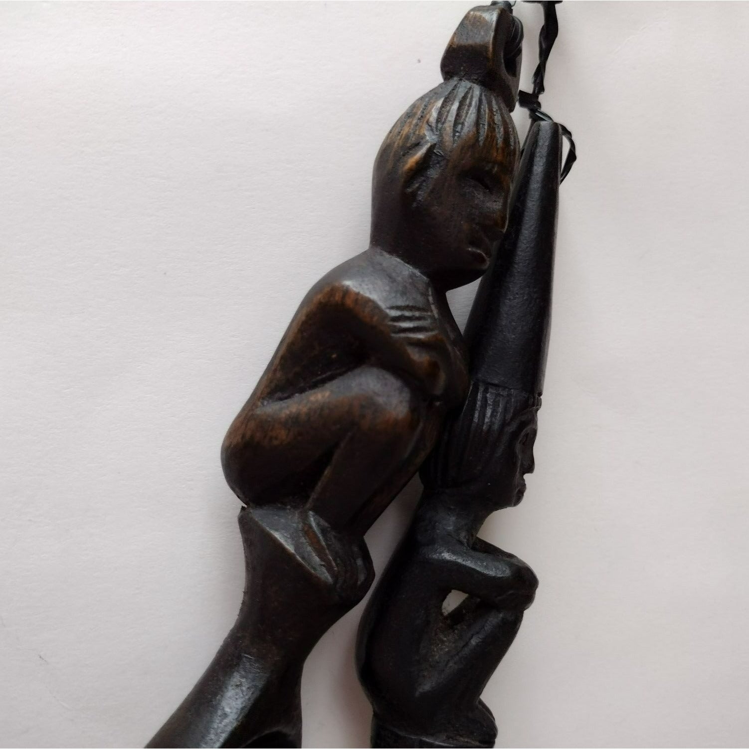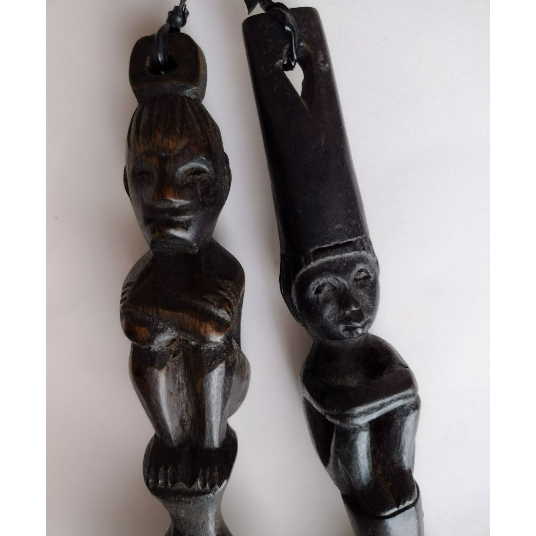 This set of 2 Vintage Philippine Ifugao Wooden Rice Spoons demonstrate the rich tribal culture of the Ifagao of the Philippines. The handles feature intricately hand-carved wooden figures, with holes at the top so they can be hung as wall decor if you'd like to do so. These are clearly hand crafted, but I do not know the age.